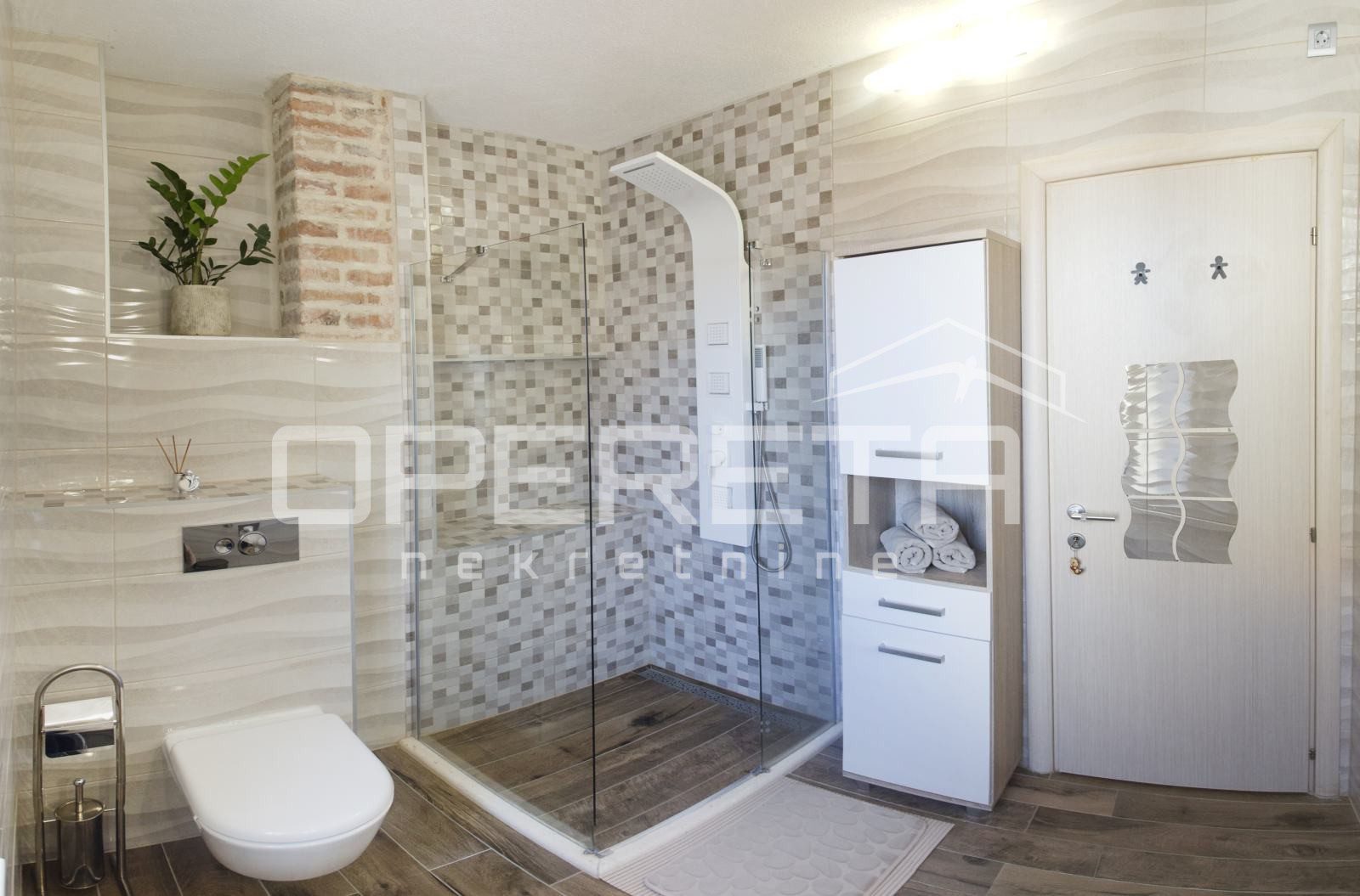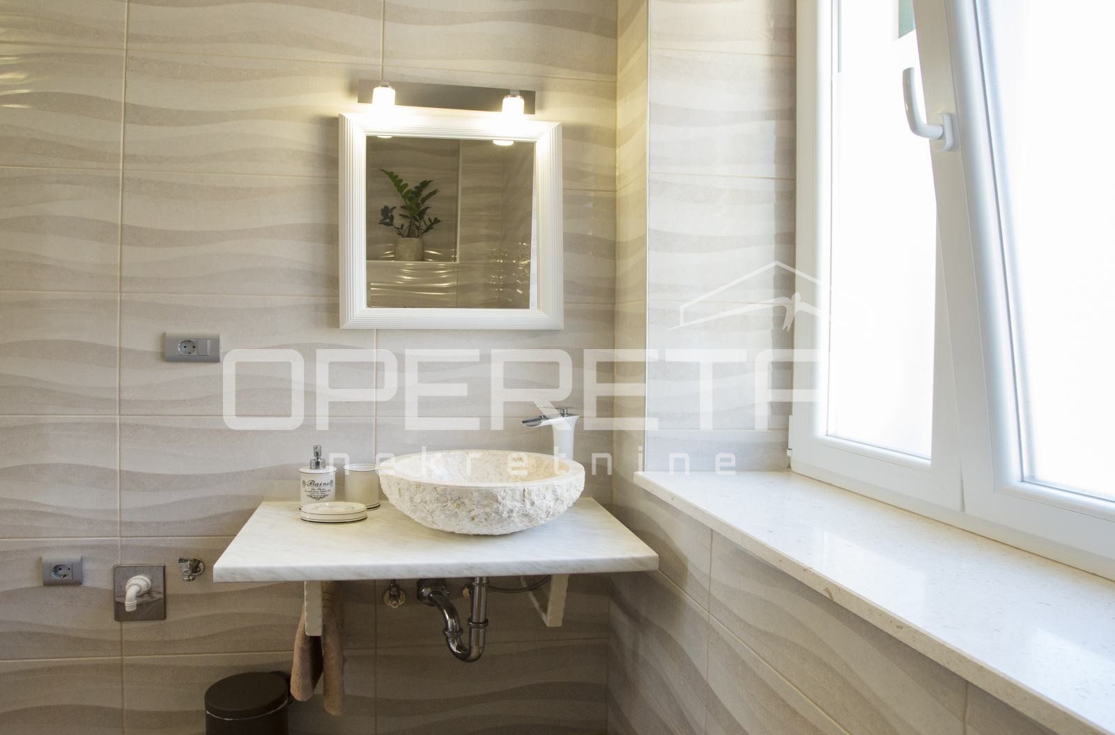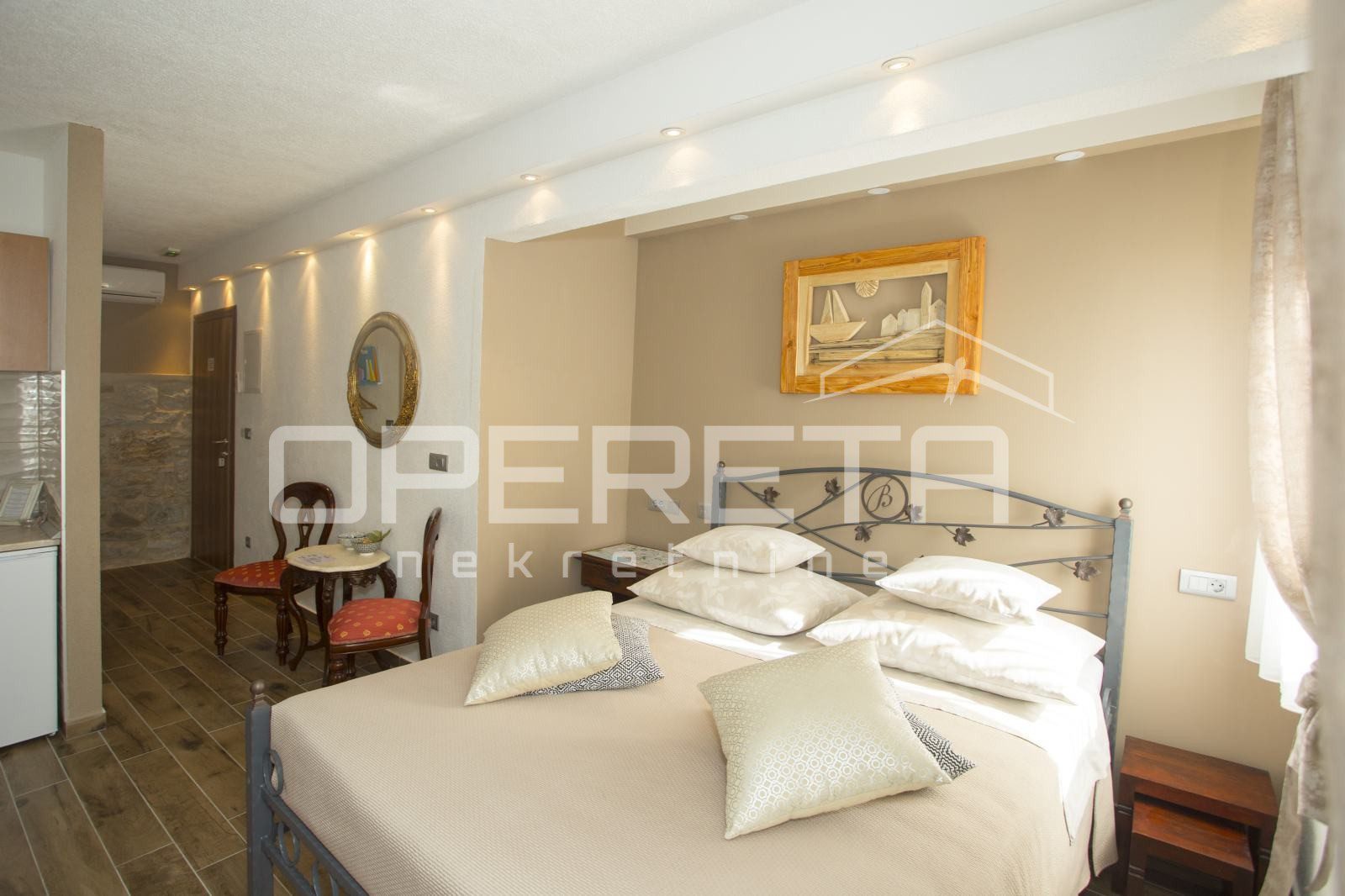 U prizemlju se nalazi dvosoban stan s posebnim ulazom, koji se sastoji od hodnika, dvije spavaće sobe, kupaonice, kuhinje s blagovaonicom te dnevnog boravka s izlazom na idilično dvorište s kaminom i sjenicom, idealno za uživanje u mediteranskom ambijentu.