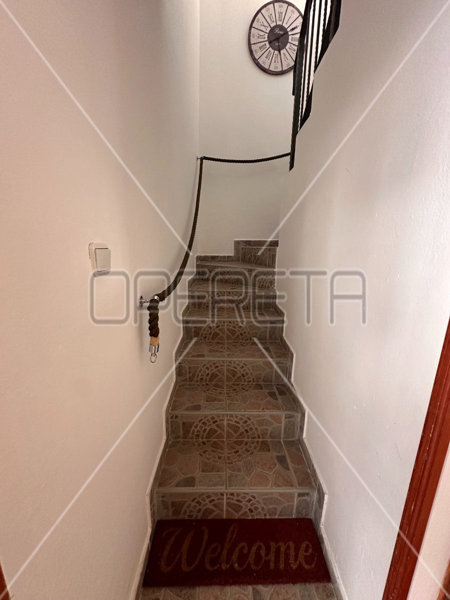 Prizemlje od 35 m² sadrži udobnu spavaću sobu, dnevni boravak, potpuno opremljenu kuhinju i kupaonicu od 4,5 m². Ispod unutarnjih betonskih stepenica nalazi se mali spremište s perilicom rublja, idealno za dodatno skladištenje.