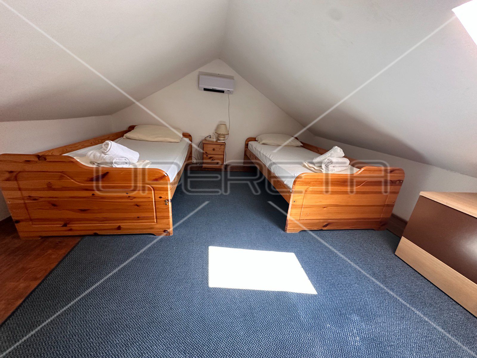 Potkrovlje, kojem se pristupa drvenim stepenicama iz dnevnog boravka, sadrži spavaću sobu s dva kreveta za jednu osobu, dok se drugi dio potkrovlja može koristiti kao spavaći prostor, igraonica ili za druge svrhe, pružajući veliku fleksibilnost.
