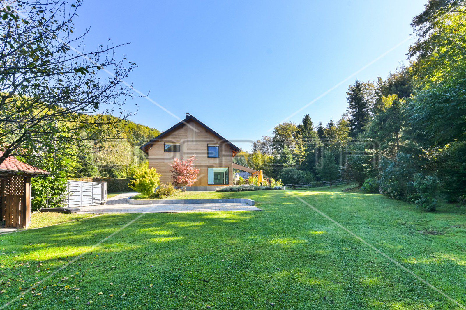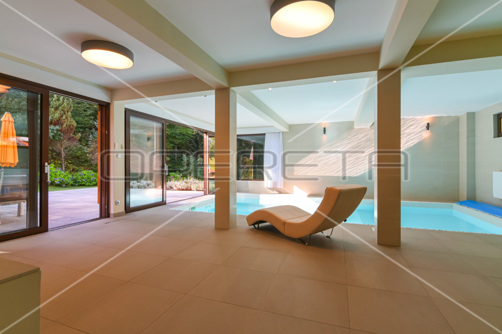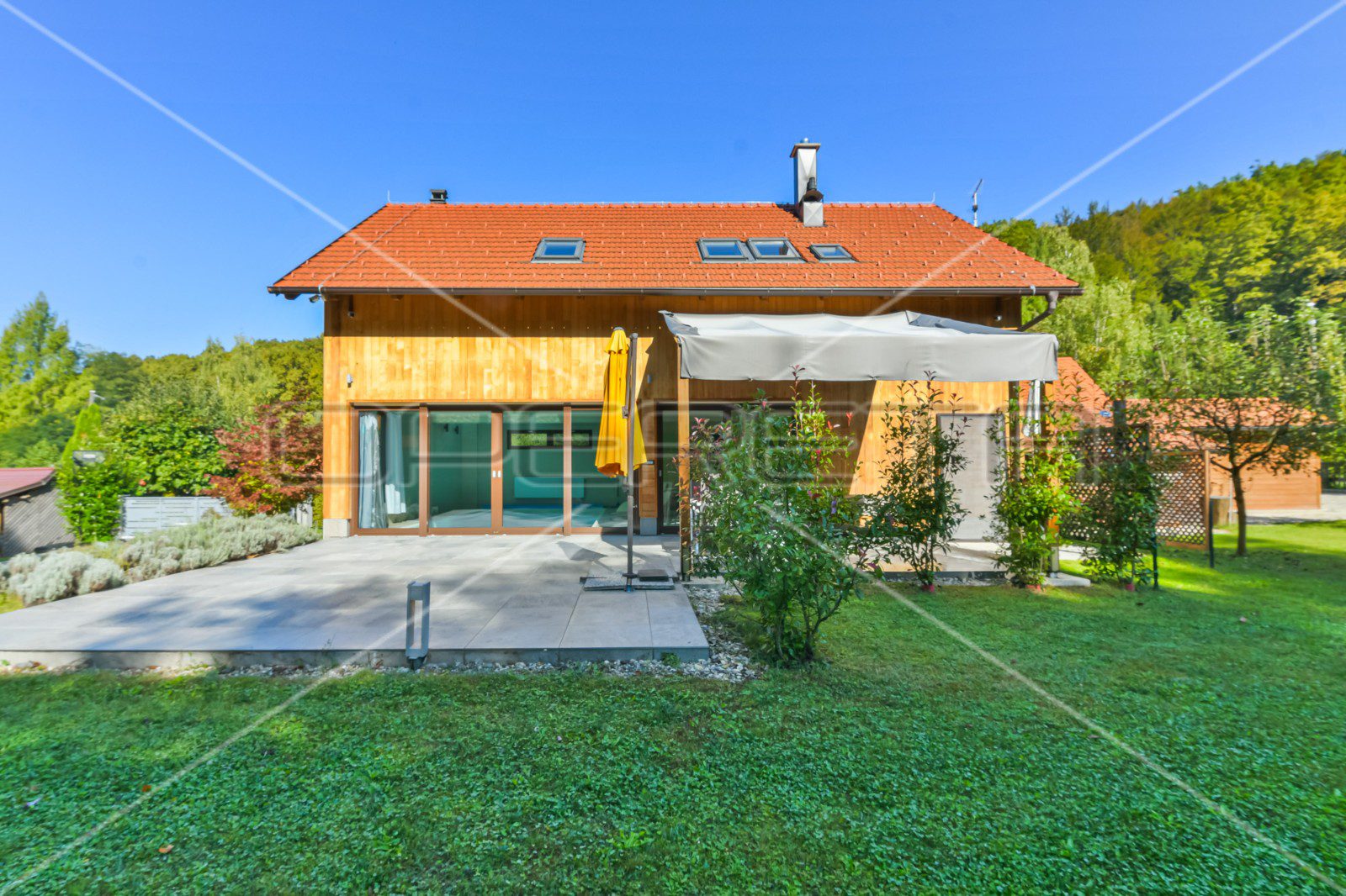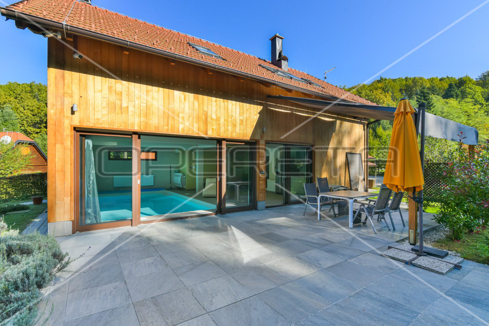 Moderna samostojeća vila od 264 m2 luksuznog interijera smještena na skrovitoj zelenoj oazi od 2130 m2. Razvedena je u tri etaže. U podrumskom prostoru nalazi se teretana, radna prostorija, hodnik i prostor tehnike bazena. Prizemljem prevladava bazen ( vrhunske izvedbe s protustrujnim plivanjem, slana voda) sa prostorom za opuštanje koji je putem kliznih stijena i vanjskih terasa u direktnom kontaktu s prirodom i šumovitim okruženjem, te wc + tuš i mini kuhinja. Na katu se nalaze 2 spavaće sobe s vlastitim kupaonicama te “open space” dnevni boravak s kuhinjom i blagovaonicom. Vrhunski namještaj i oprema uključujući alarm, video-nadzor, rolete na daljinsko upravljanje, auto-zatvaranje krovnih prozora u slučaju kiše itd.. Vila je armirano-betonske konstrukcije obložena drvetom ( hrast ) koji i obilježava okruženje u kojem se nalazi. 2 pomoćna objekta: garaža i spremište te parking. Idealna planinska mikroklima. Vila je kategorizirana s 4* i ima izvrsnu i konstantnu popunjenost. Prodaje se potpuno namještena i spremna za nastavak iznajmljivanja. Besprijekoran luksuz i odmor u čistoj prirodi!