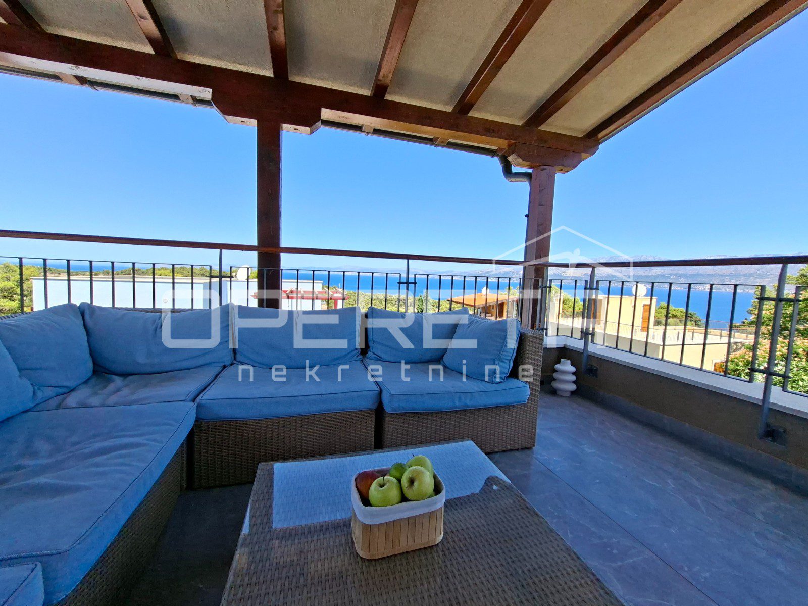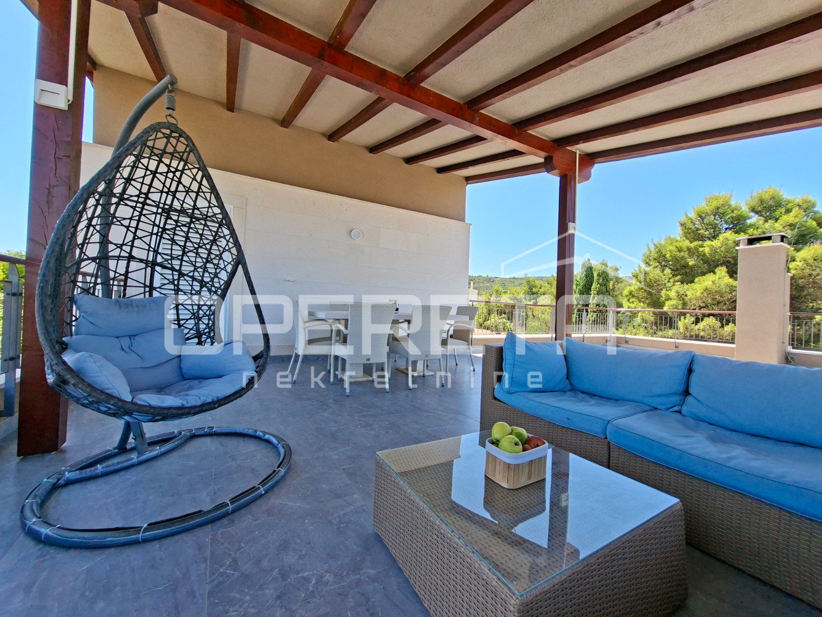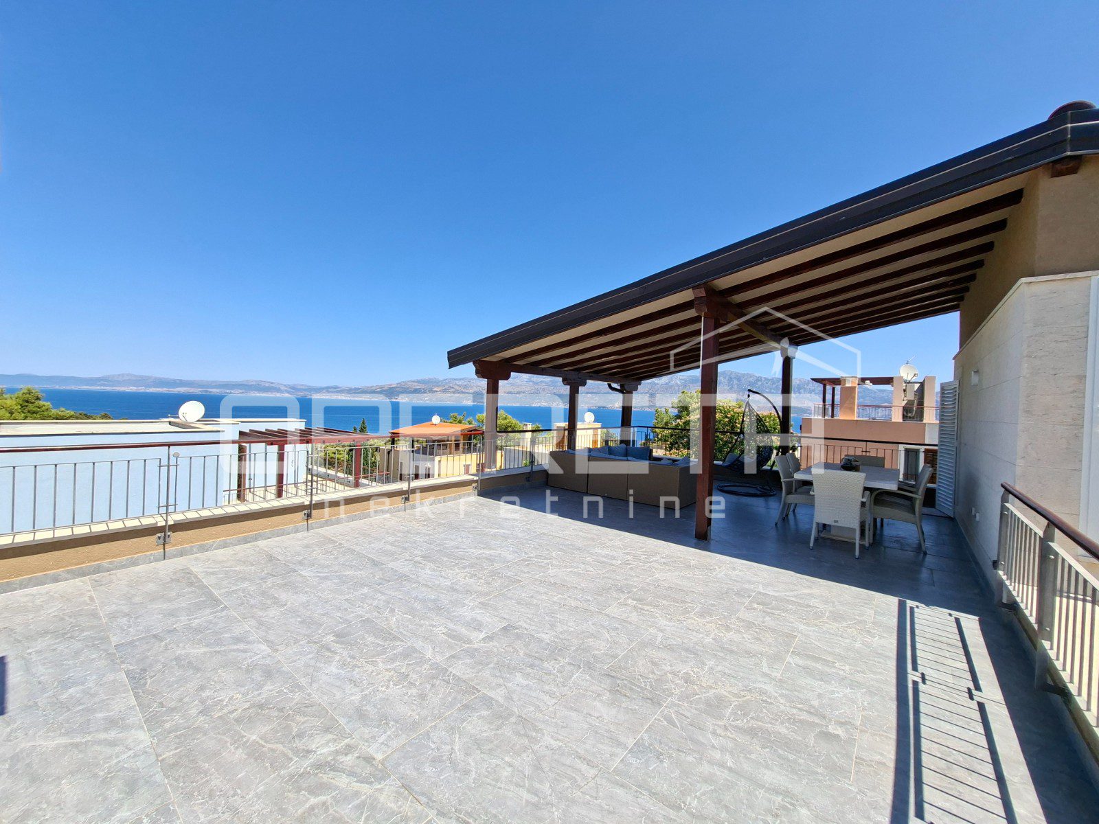 Treća etaža uređena je kao prostrana terasa s pergolom i blagovaonicom na otvorenom, s koje se pruža prekrasan pogled na cijeli zaljev, obližnja naselja i more.