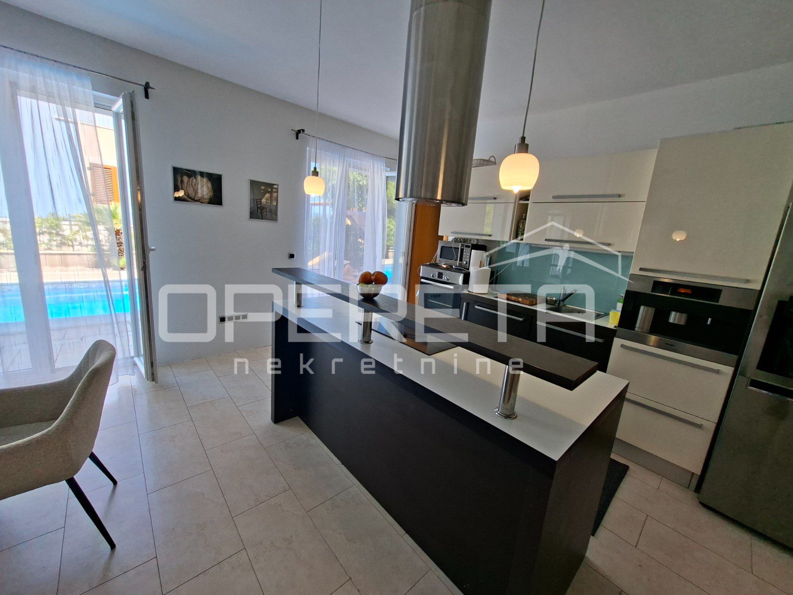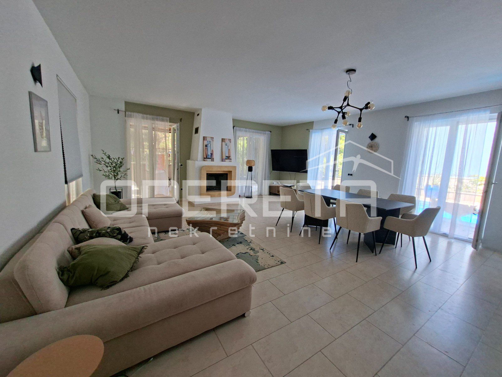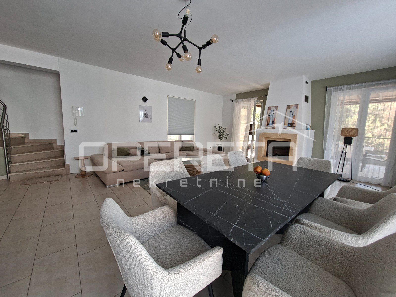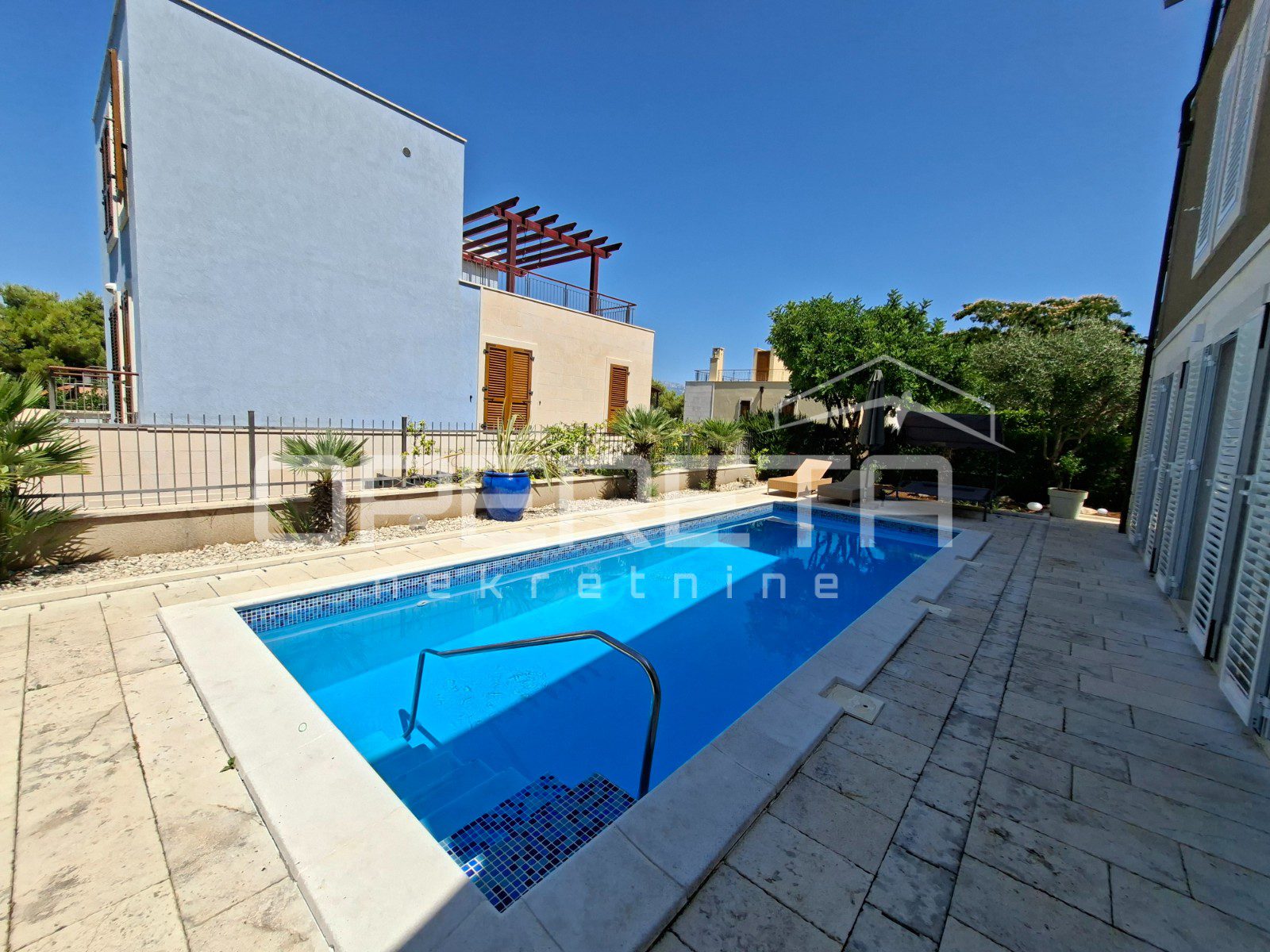 Vanjski prostor obogaćen je mozaik bazenom, kamenim kaminom i kutkom za druženje, dok je okućnica uređena kao mediteranski vrt s palmama, lavandom i autohtonim biljem.