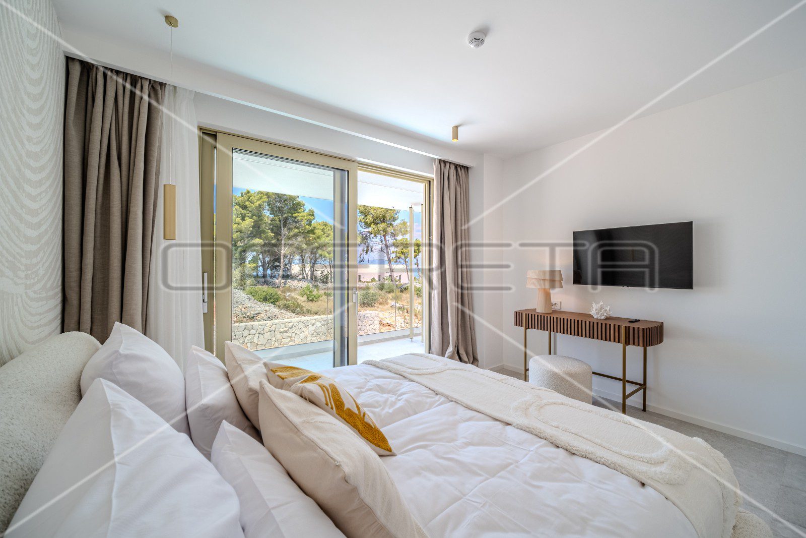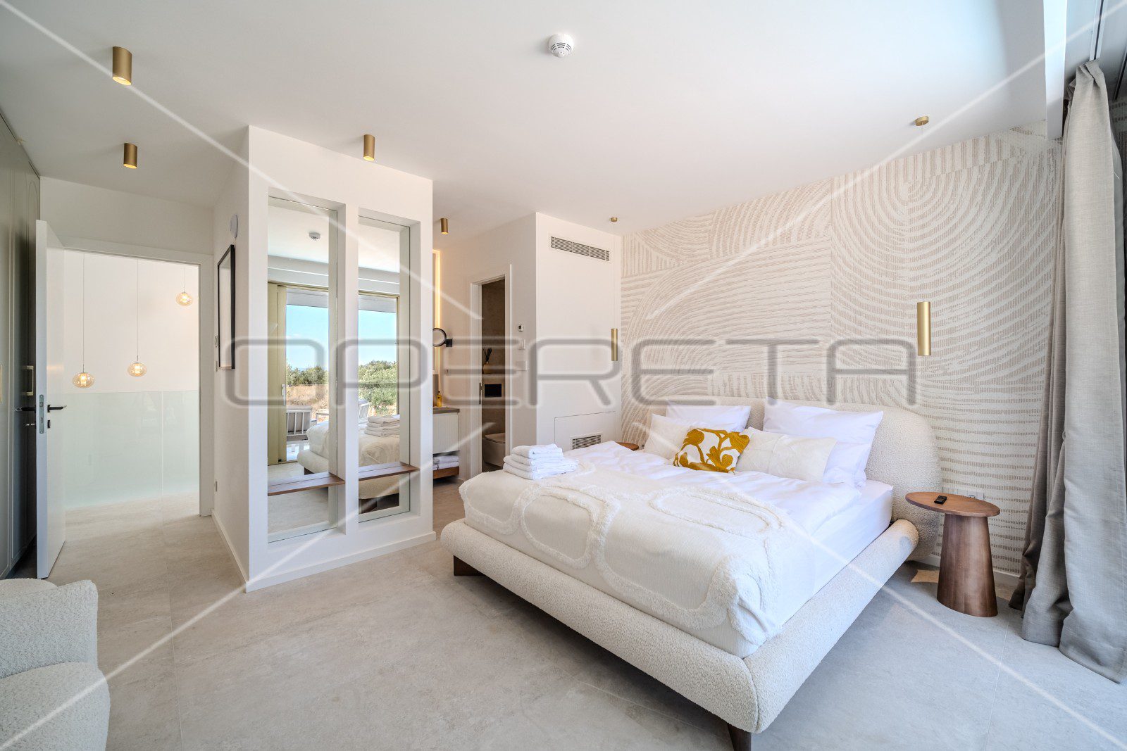 Tri spavaće sobe na prvom katu, svaka s privatnom kupaonicom i terasom, jamče privatnost i ekskluzivni pogled na more. Pažljivo razmatranje položaja vile, smjera vjetra i sunčeve svjetlosti osigurava optimalne uvjete života, s naglaskom na zaštiti od nepovoljnih vremenskih uvjeta i maksimalnom iskorištavanju prirodnog osvjetljenja.