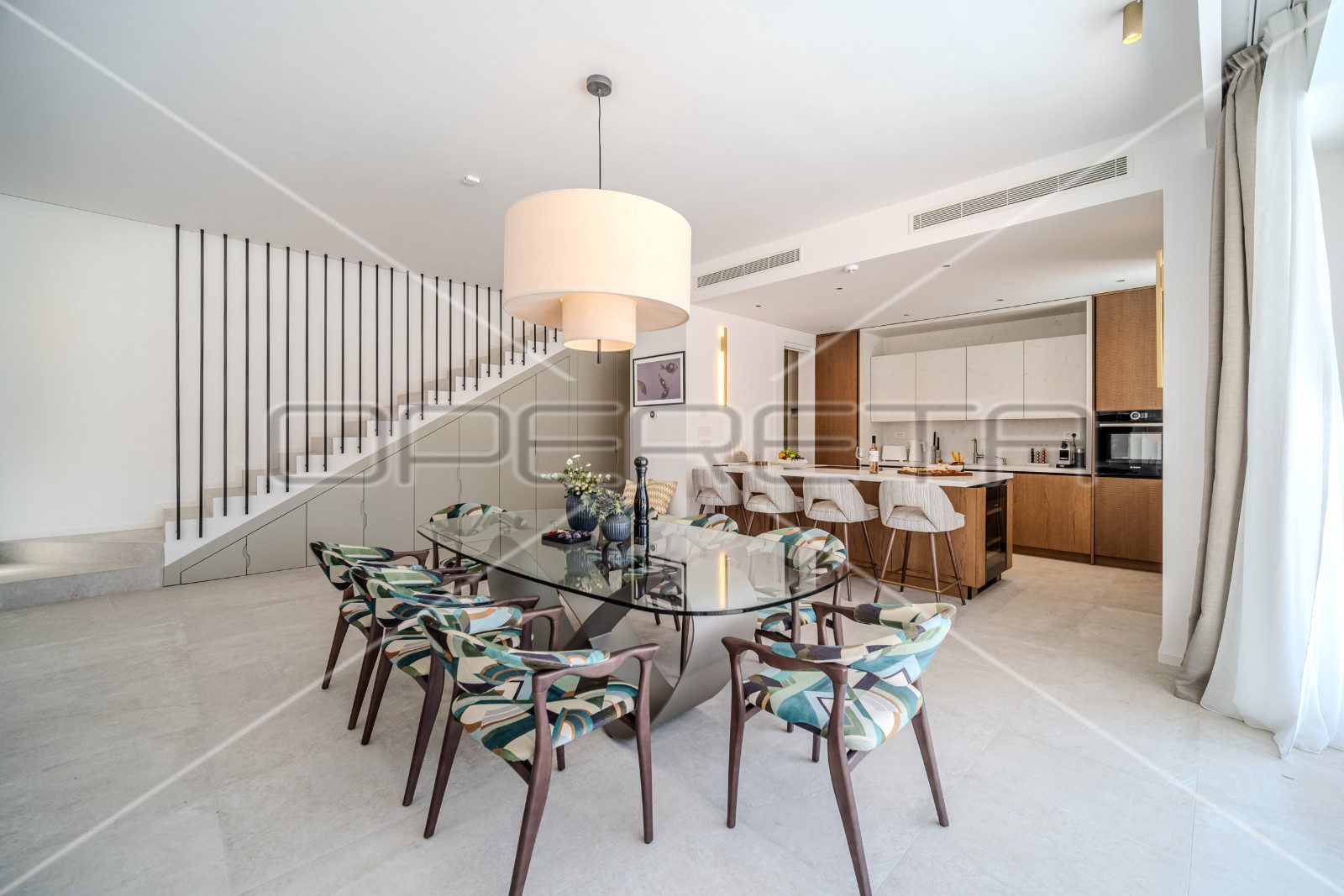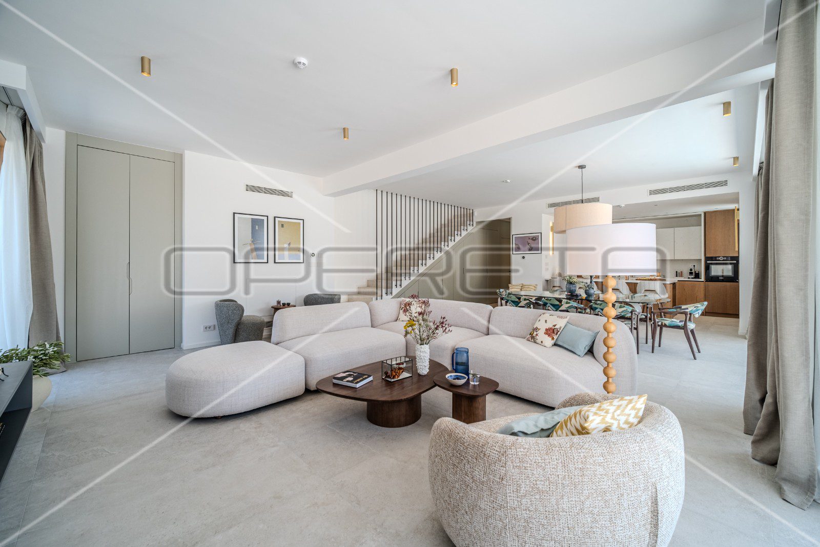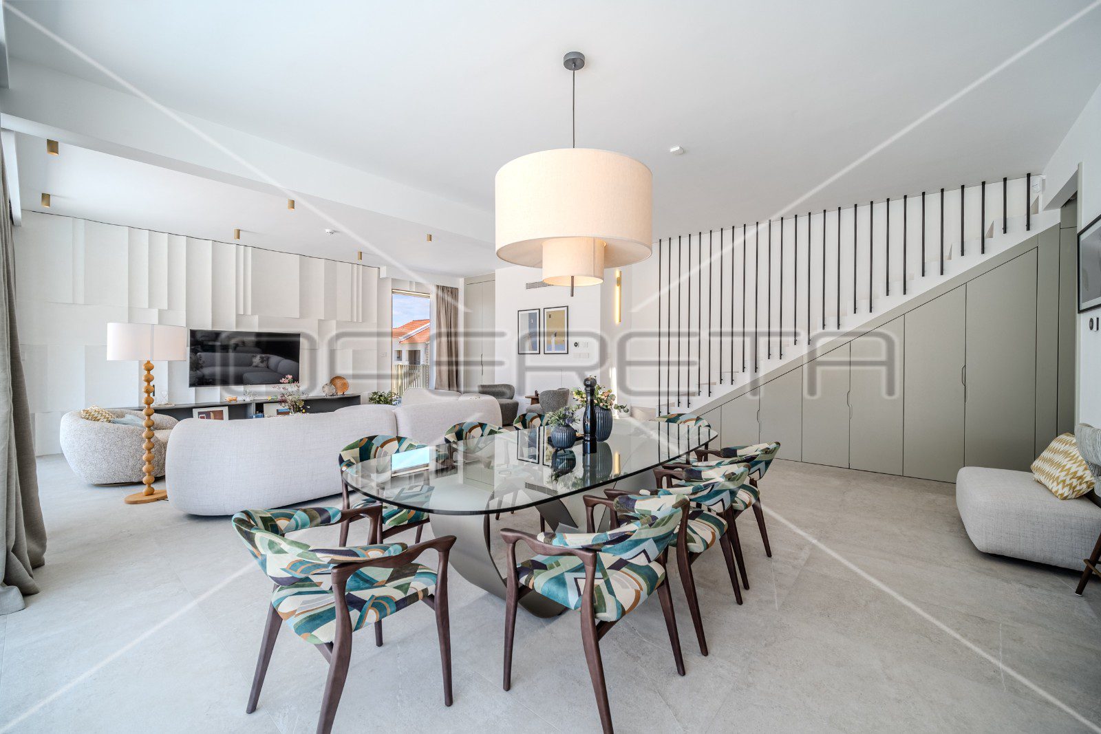 Prizemlje vile obuhvaća otvoreni prostor koji povezuje dnevni boravak, blagovaonicu i moderno opremljenu kuhinju, uz dodatne prostorije poput toaleta i pomoćne prostorije. Velike staklene površine osiguravaju obilje prirodnog svjetla, dok se izravni pristup terasi od 100 m² s bazenom nudi kao idealno mjesto za opuštanje.