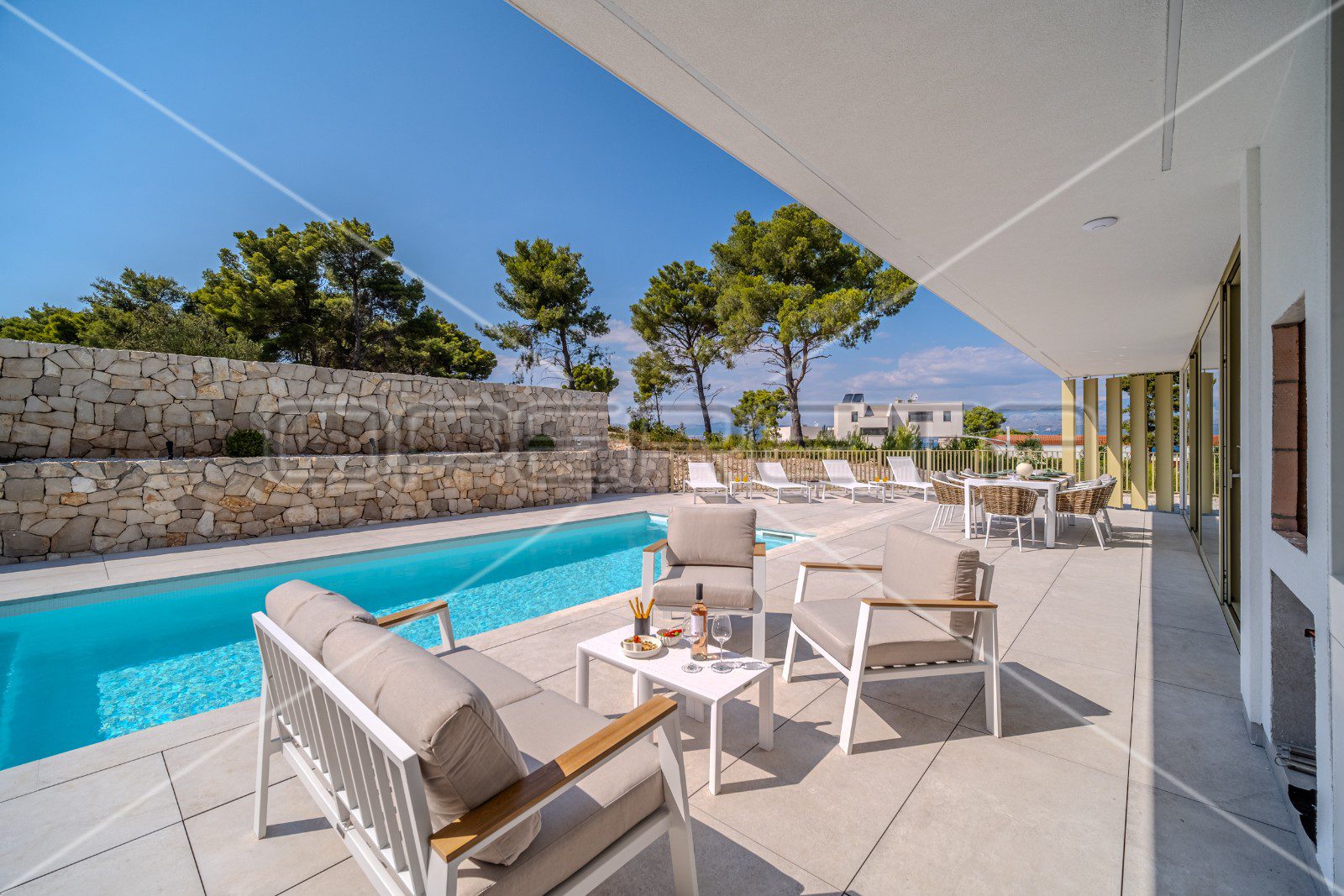 Zasebni prostori za opremu bazena i skladištenje, kao i vanjska kuhinja s roštiljem i tuš na terasi, nude dodatnu praktičnost i užitak u životu na otvorenom. Mogućnost instalacije protustrujnog plivanja u bazenu pruža dodatnu luksuznu dimenziju rekreacije.