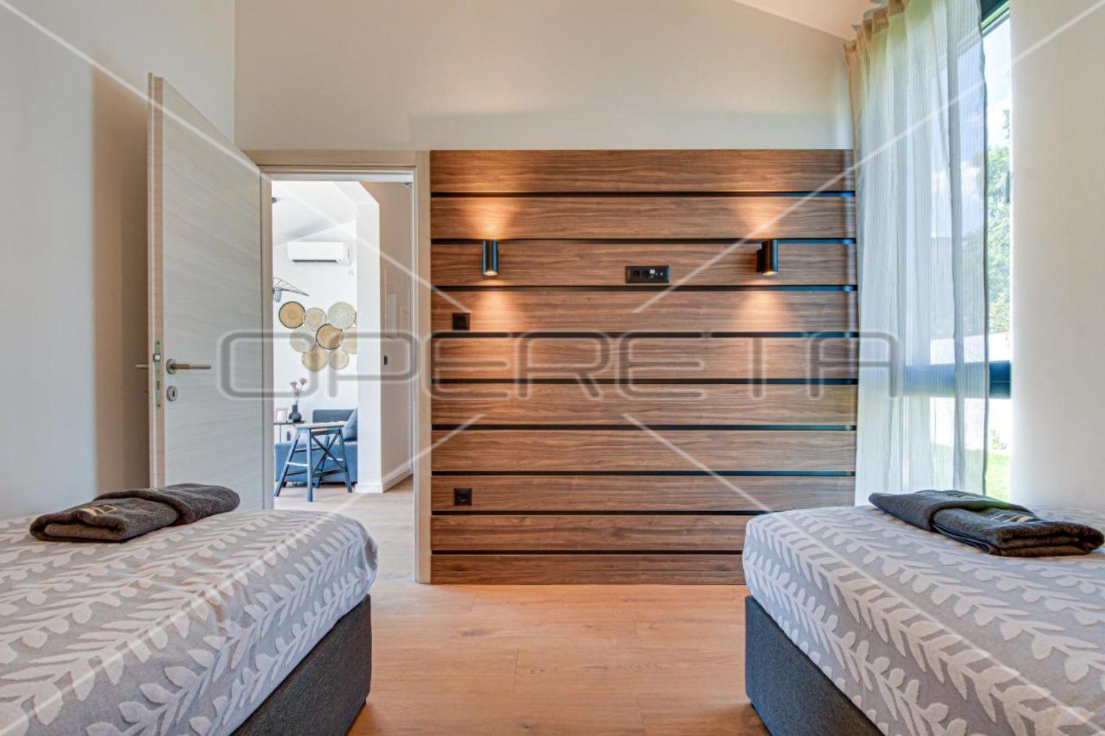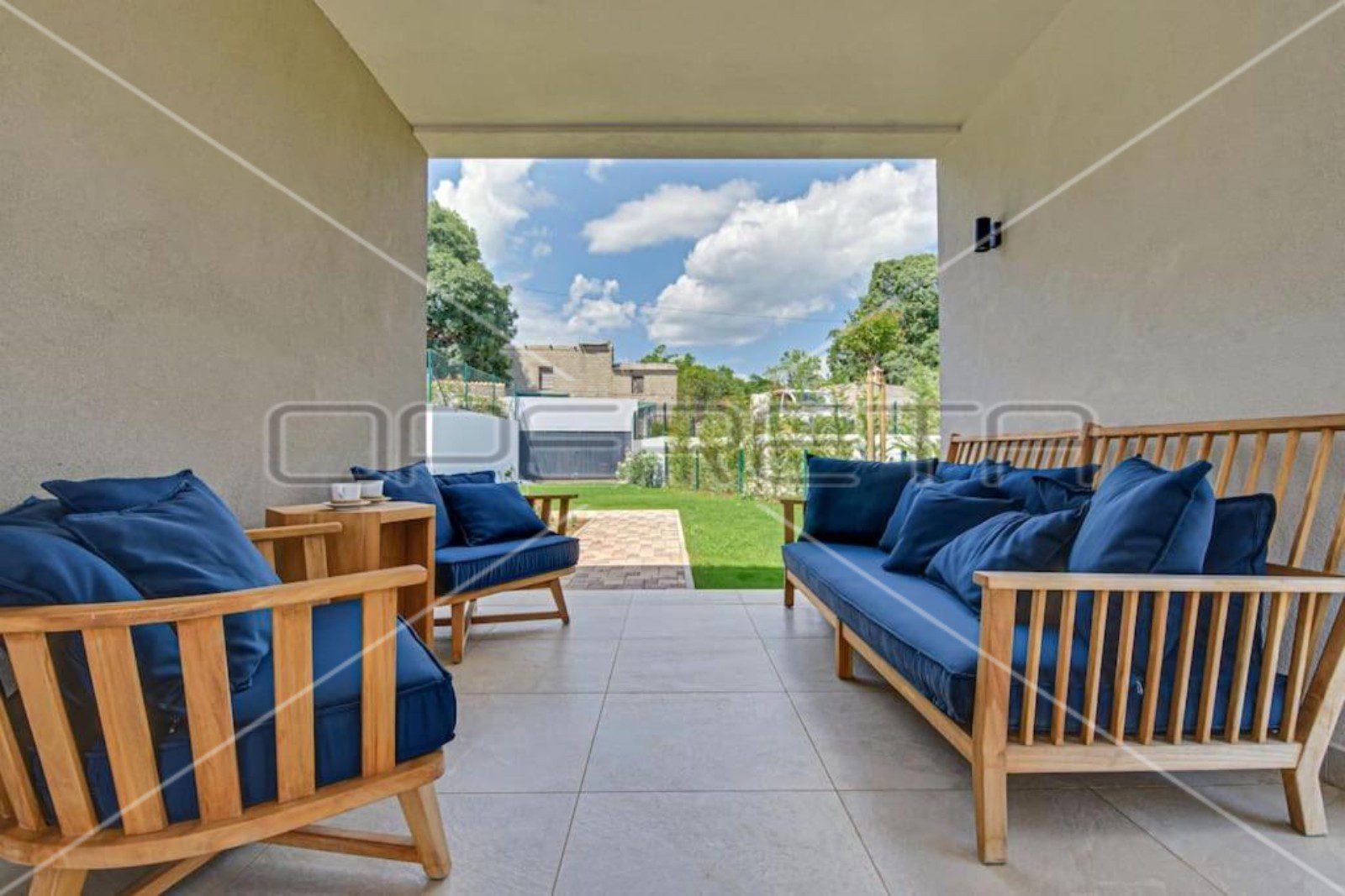 Kuća površine 102m2 sastoji se od dvije spavaće sobe, dvije kupaonice, dnevnog boravka s kuhinjom i blagovaonicom u jednoj cjelini, koje imaju izlaz na natkrivenu terasu i vrt sa sunčalištem i bazenom od 40m2.