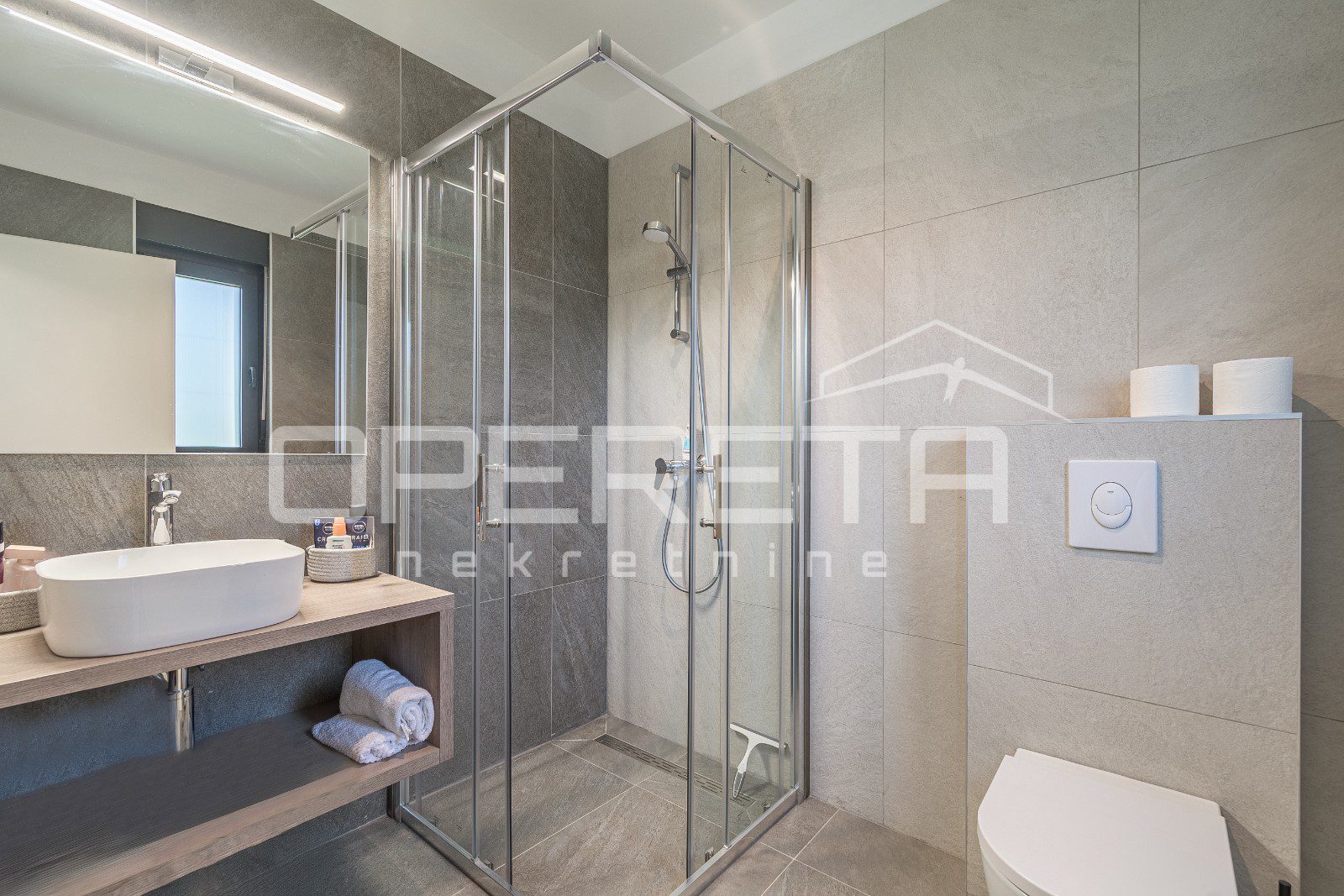 Unutrašnjost kuće nudi tri spavaće sobe, dvije kupaonice te dodatni WC i vešeraj. Kuća ima energetski razred A. U potpunosti je namještena vrhunskim modernim namještajem i uređajima te pažljivo osmišljena kako bi svaki kutak pružao osjećaj doma i opuštenosti. Prostrana natkrivena terasa sadrži ljetnu kuhinju s roštiljem, frižiderom, sudoperom i praktičnim radnim površinama, te veliki blagovaonski stol.