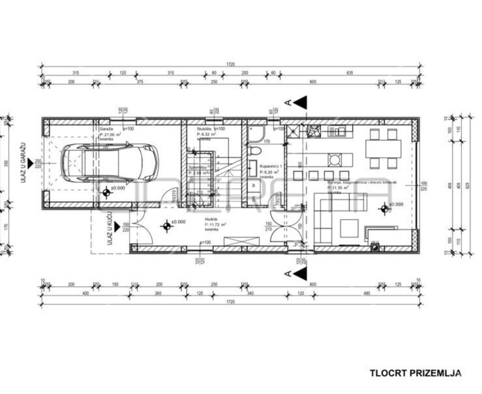U prizemlju se smjestio hodnik, kuhinja s blagovaonicom i dnevnim boravkom s izlazom na sunčalište bazena, kupaonica, ostava i komunikacija s garažom – direktan ulaz u kuću.
