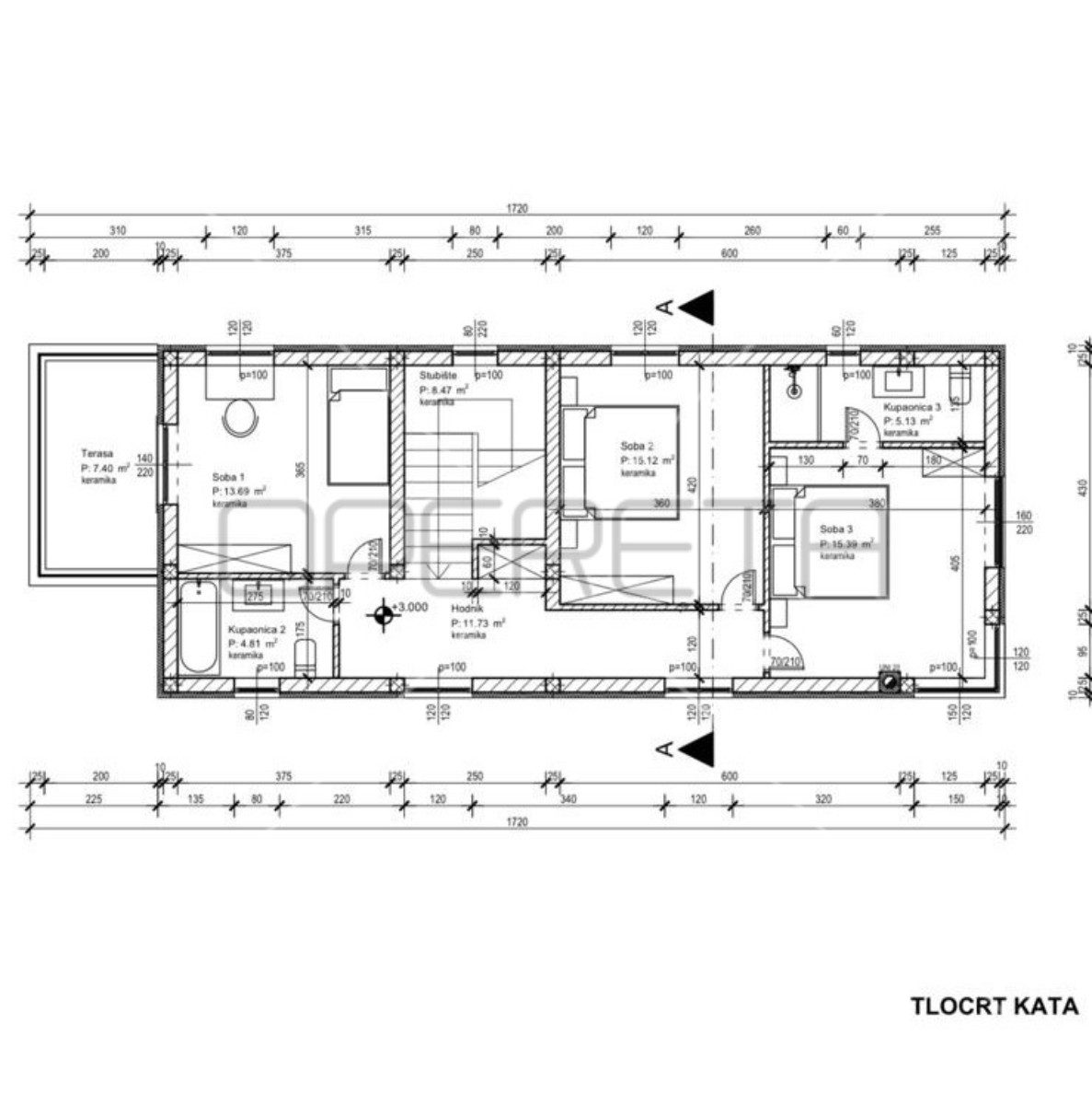 Na katu se nalaze tri spavaće sobe, jedna s vlastitom kupaonicom, dok dvije dijele jedno zajednička kupaonica.