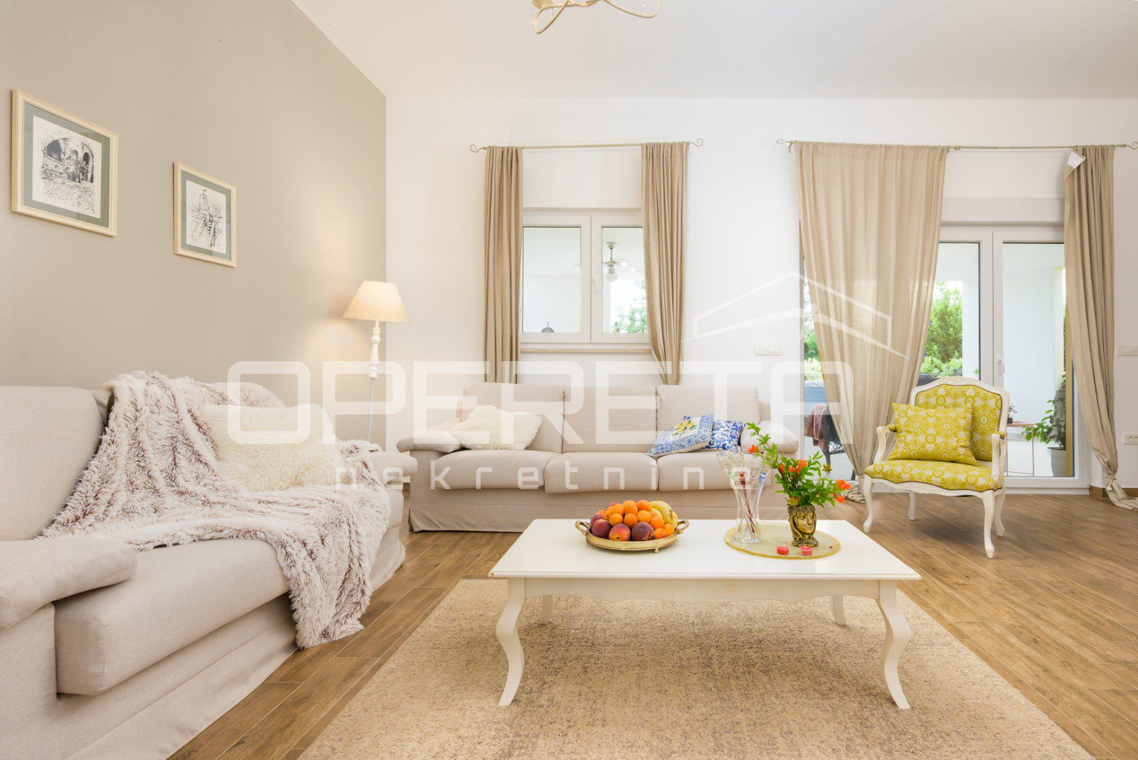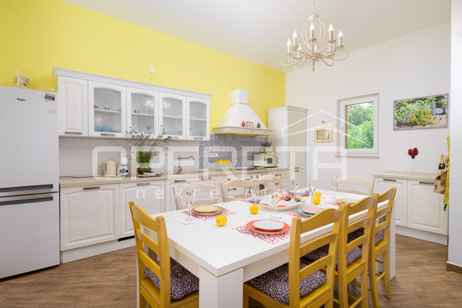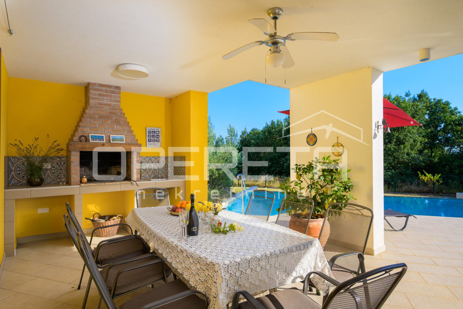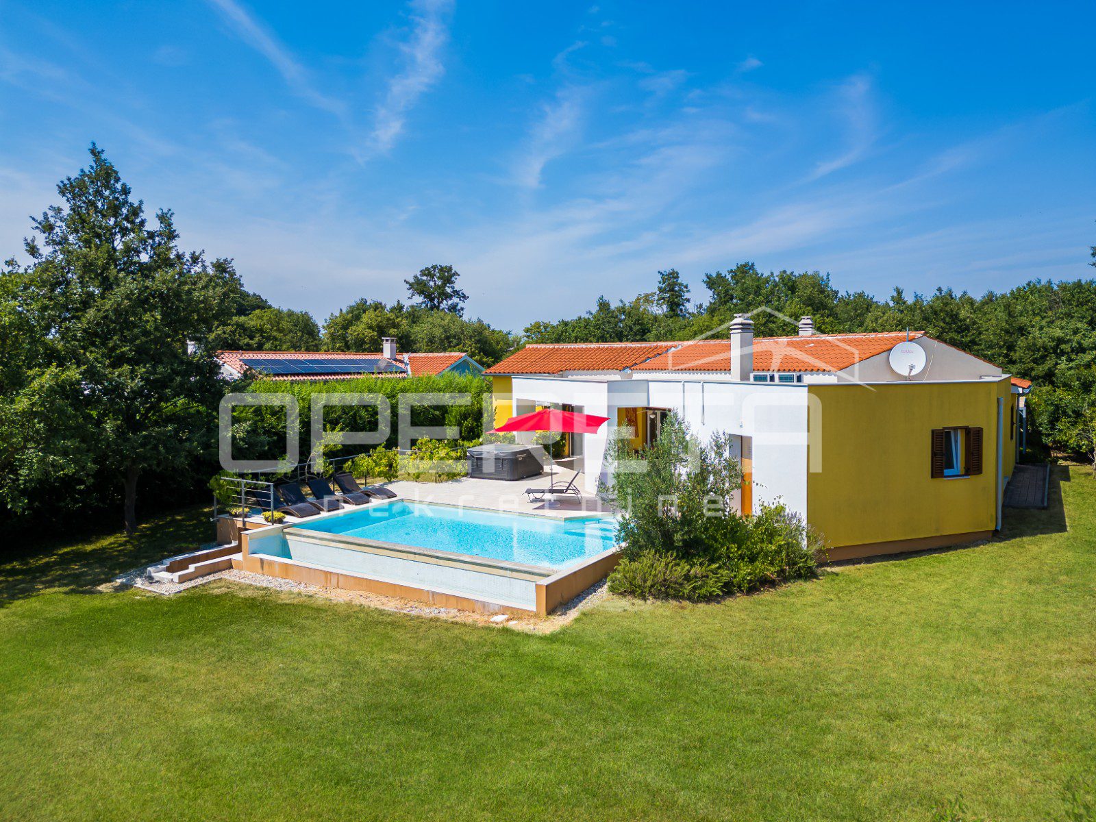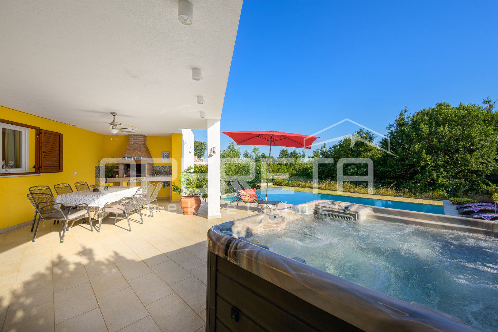 Cijeli objekt je klimatiziran, a dodatni luksuz pruža sauna — savršena za opuštanje u bilo koje doba godine. Iz dnevnog boravka i blagovaonice izlazi se na veliku natkrivenu terasu s ugrađenim kaminom, idealnu za zajednička druženja i večernja okupljanja. Uz terasu smješten je jacuzzi i veliki bazen okružen ležaljkama, stvarajući savršenu zonu za sunčanje i odmor.