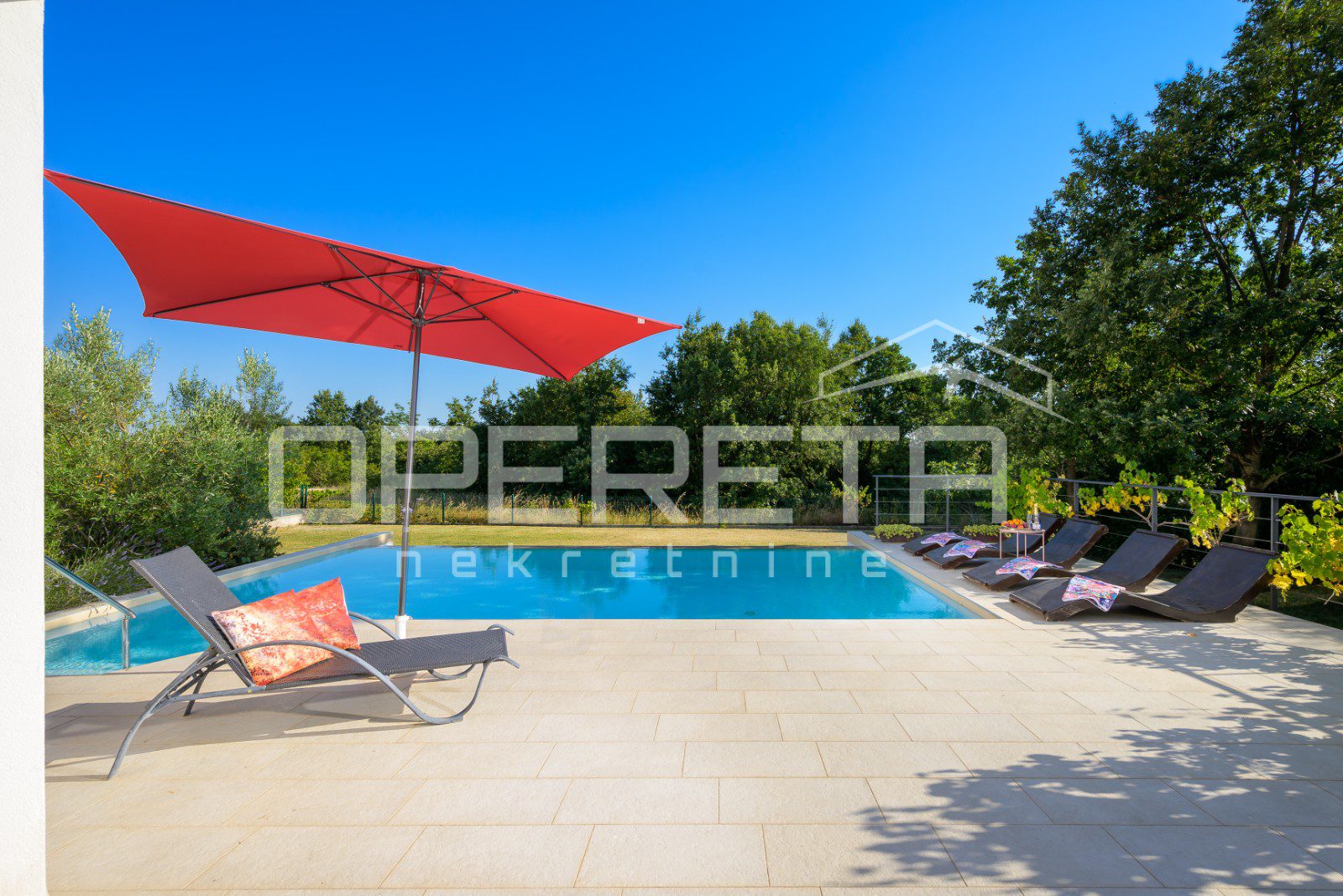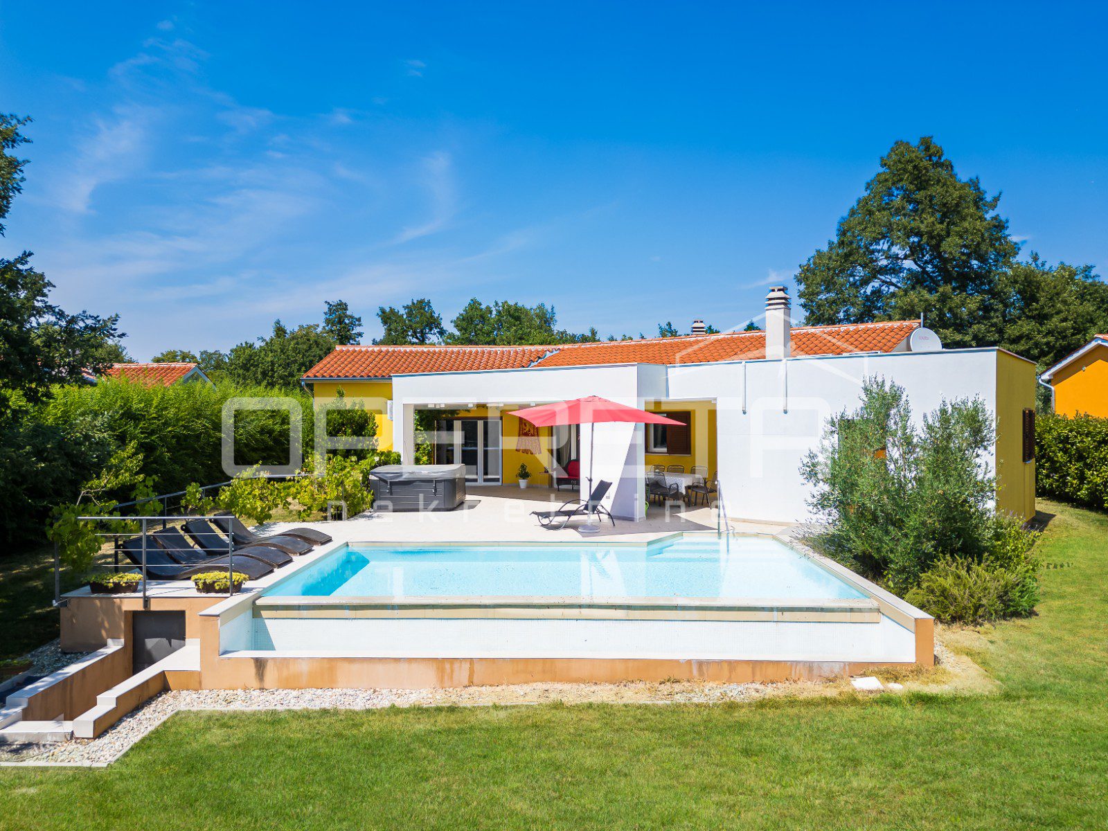 Na prodaju je atraktivna moderna vila smještena u srcu središnje Istre, u mirnom okruženju nedaleko od čarobnog srednjovjekovnog gradića Svetvinčenta. Ova elegantna prizemnica, izgrađena 2018. godine, odlikuje se suvremenom arhitekturom i pomno uređenim interijerom koji odiše stilom i profinjenošću. Vila se nalazi na parceli od 1.097 m², doK neto površina iznosi 170 m².