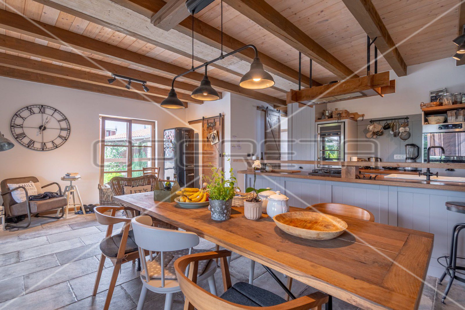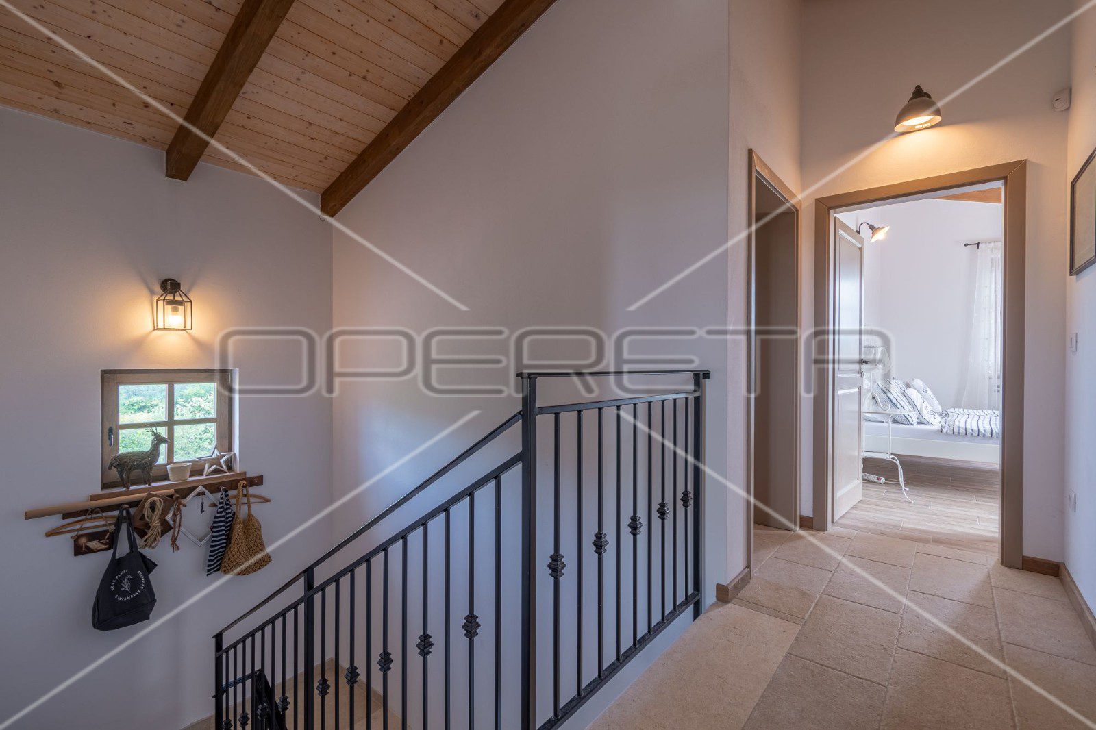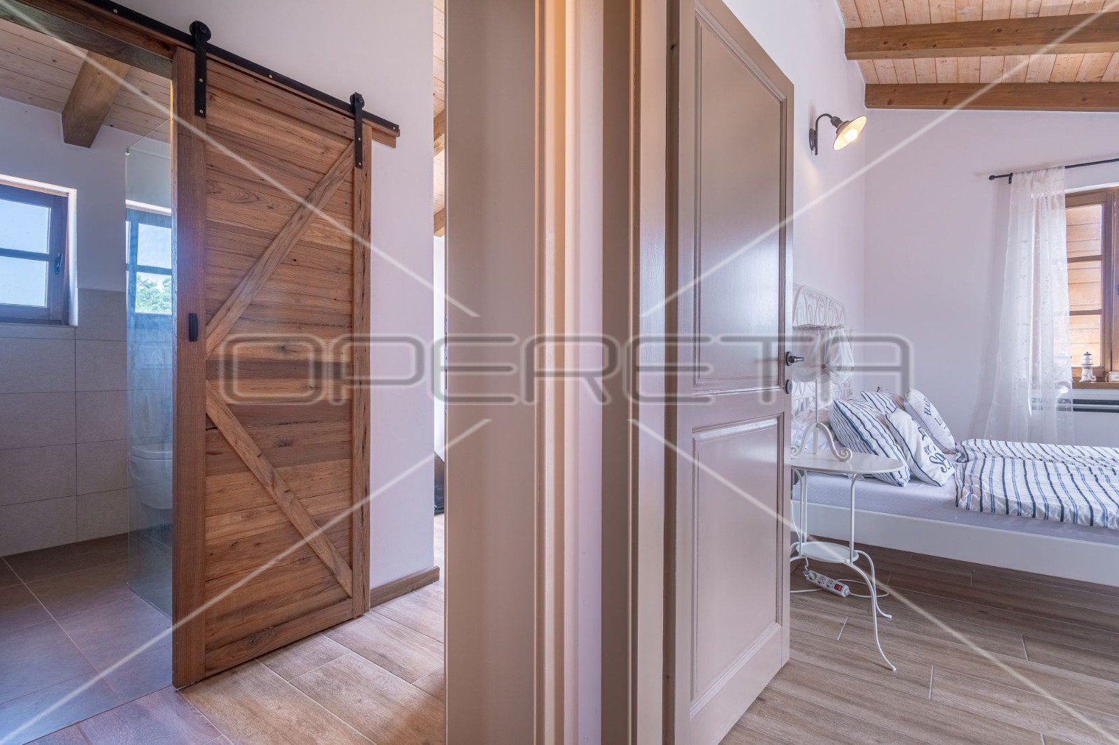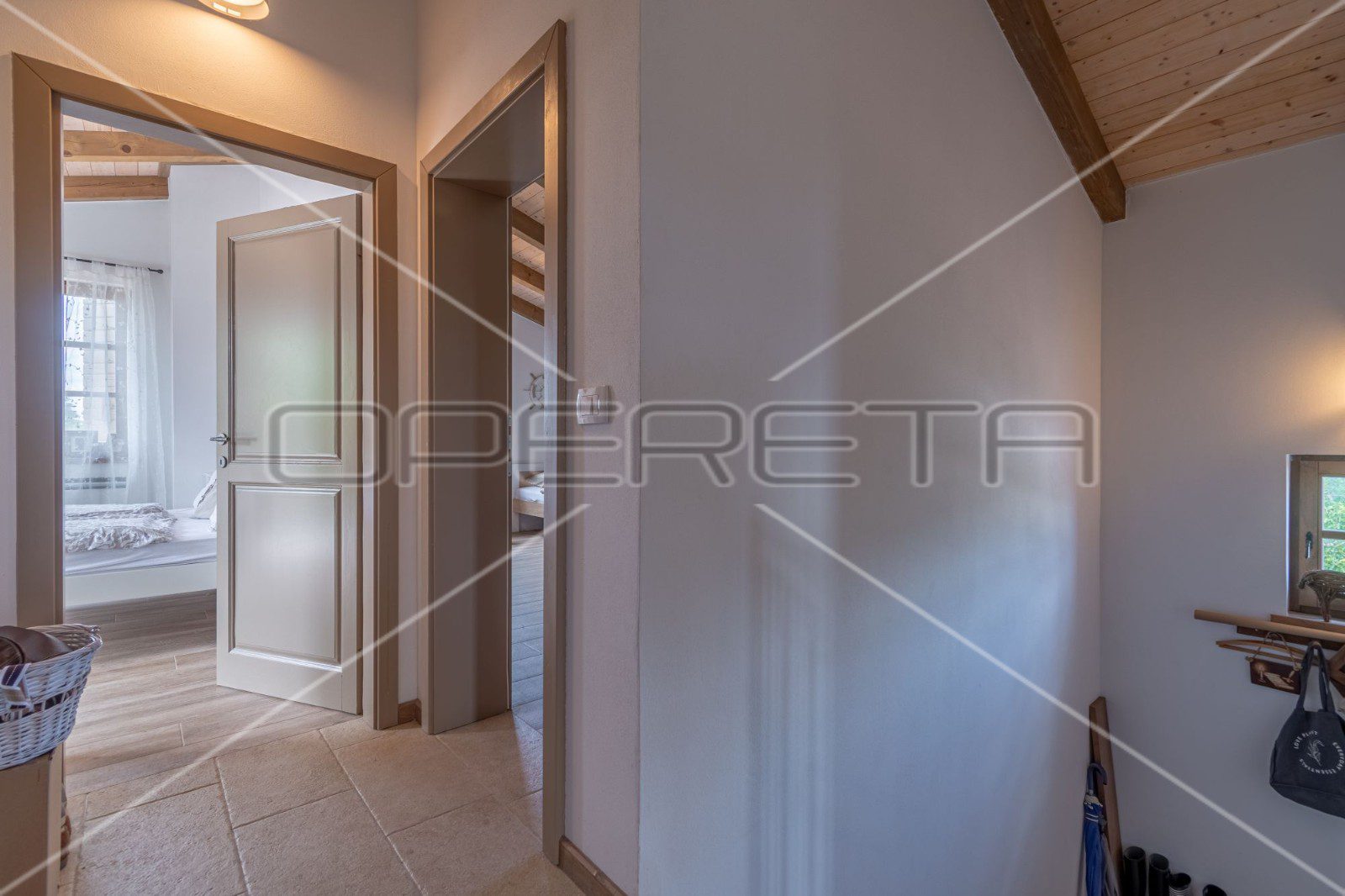 Kuća je uređena u predivnom rustikalnom stilu s puno stilskih detalja i autentičnoj kombinaciji kamena i drva.