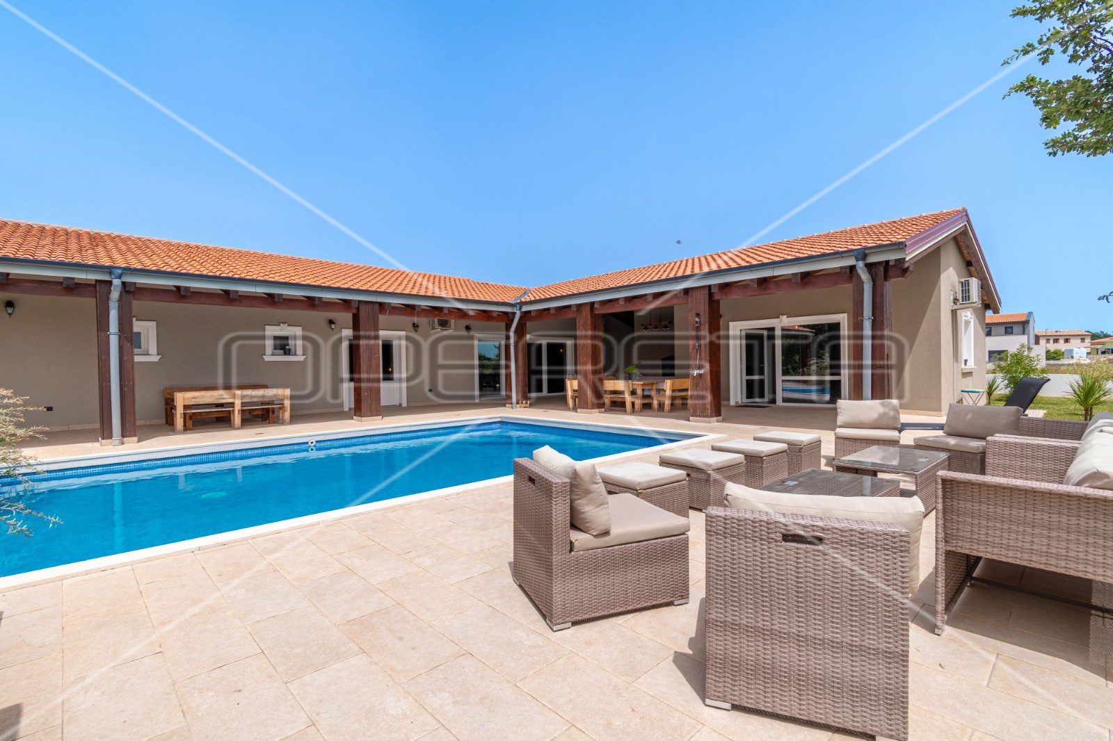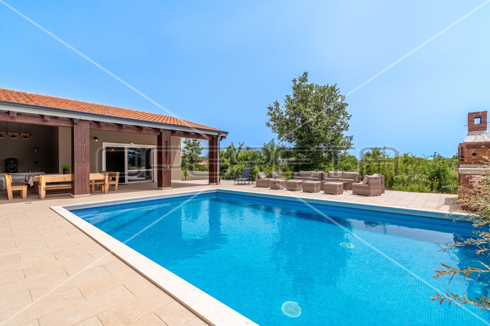 Vanjski dio čini bazen površine 42 m2 sa sunčalištem, kamin, prostran vrt s mediteranskim biljem i dovoljno zelenila koje upotpunjuje kompletan dojam.