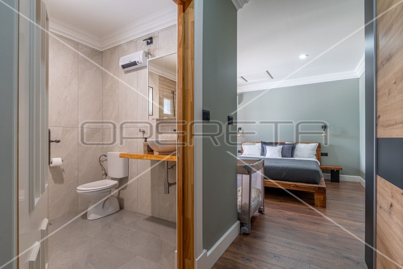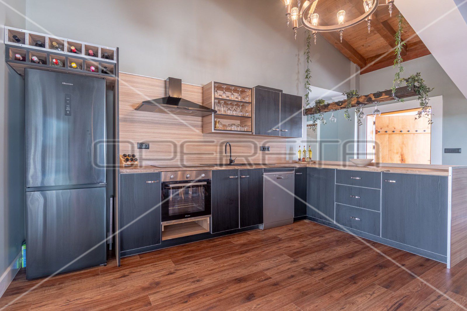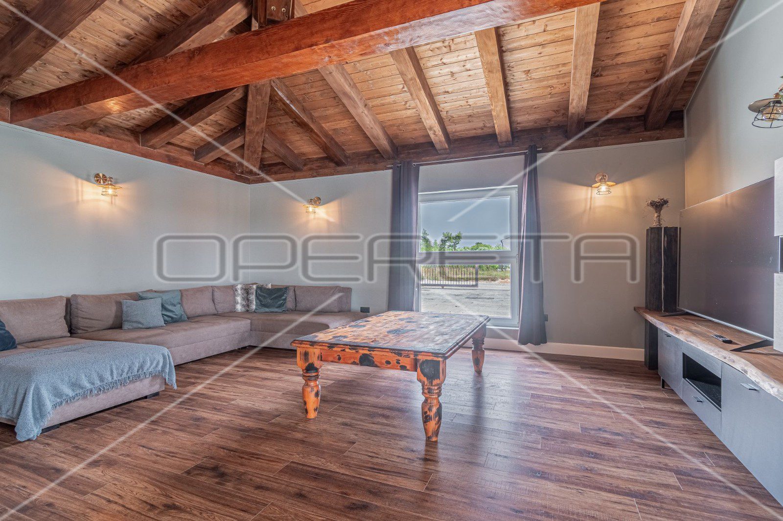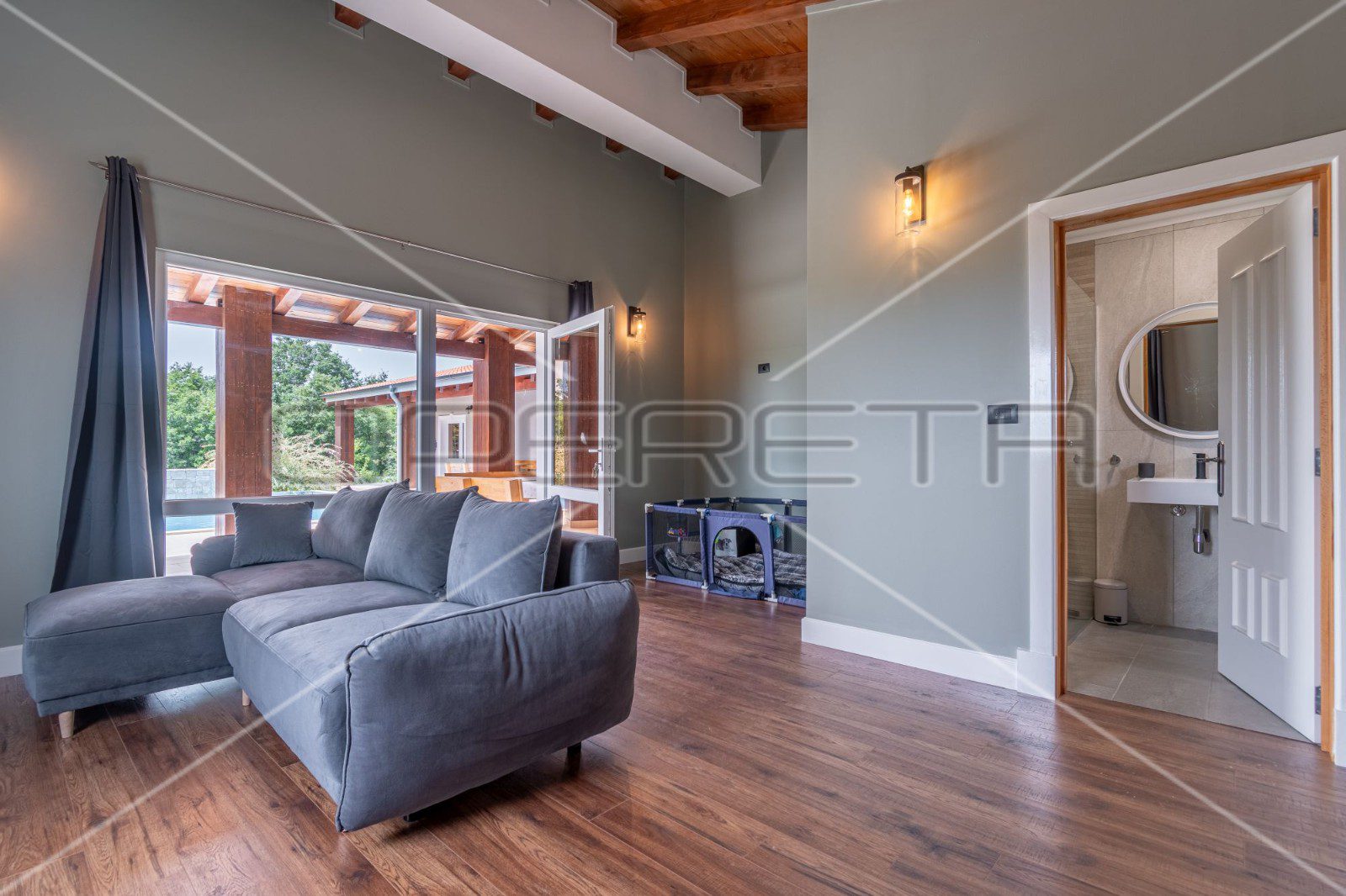 Uređena je u rustikalnom stilu kombinirajući puno drvenih elemenata, greda i kamen.