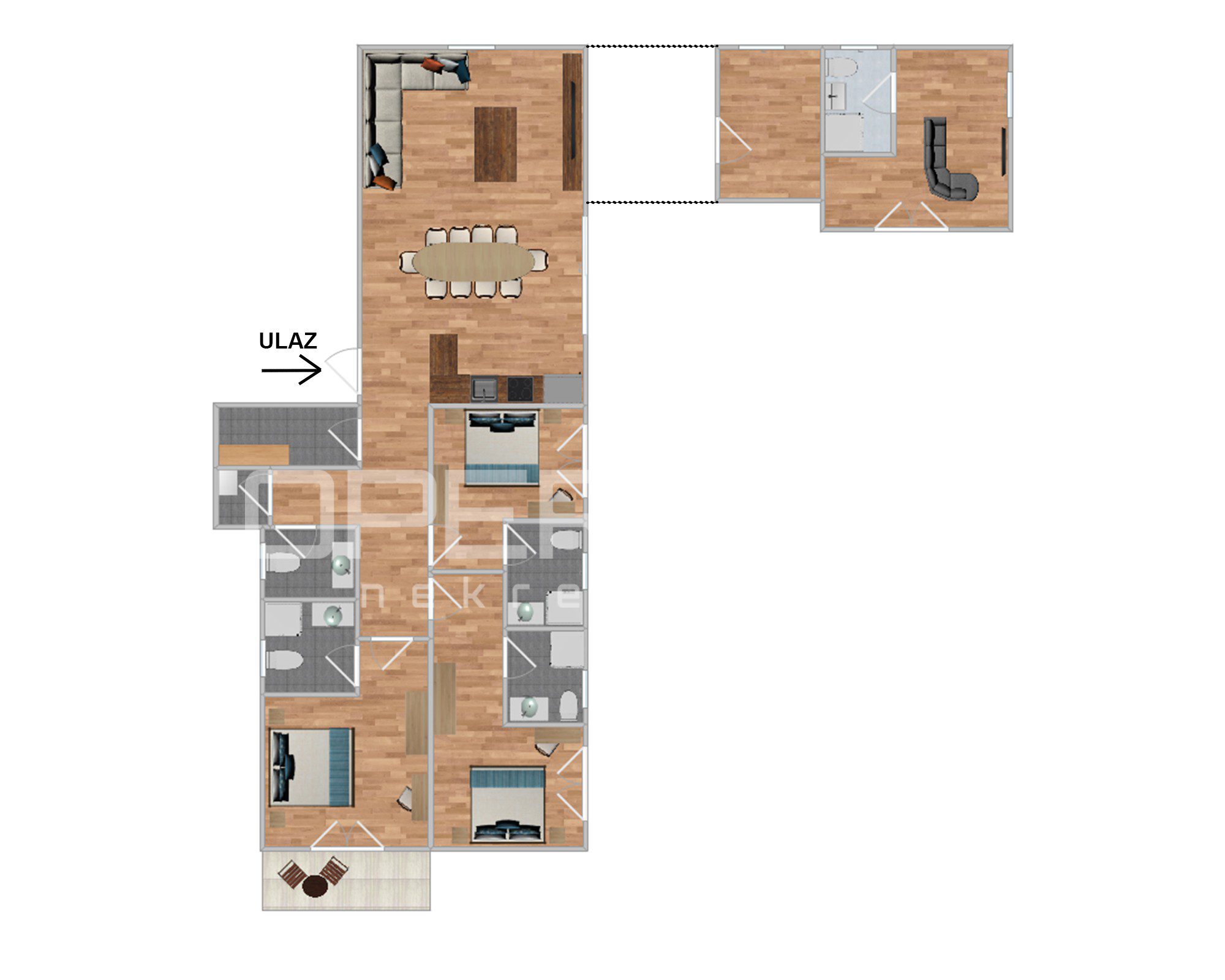Sastoji se od hodnika, dnevnog boravka sa kuhinjom i blagovaonicom i izlazom na prostranu natkrivenu terasu, tri spavaće sobe od kojih svaka ima vlastitu kupaonicu, klima uređaj i izlaz na terasu i sunčalište bazena.