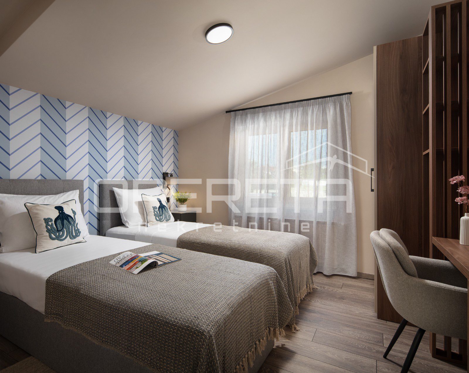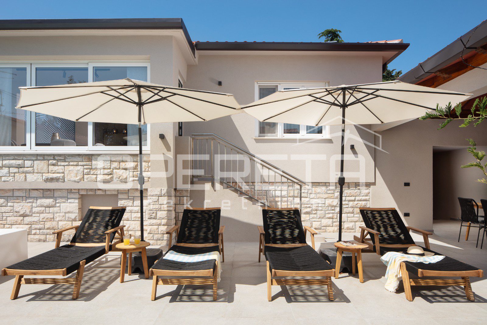 Kuća se sastoji od četiri klimatizirane spavaće sobe, dvije unutarnje kupaonice te dodatne vanjske kupaonice sa saunom.