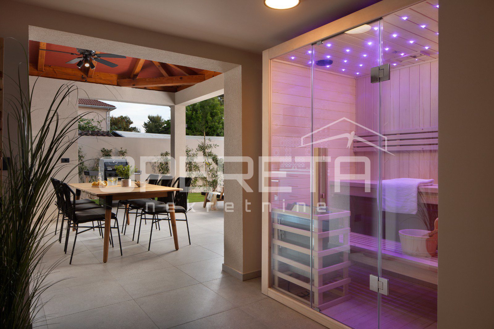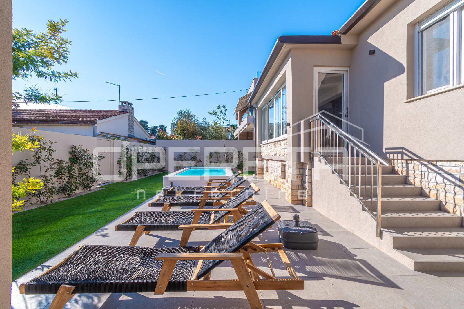 Na uređenoj i ograđenoj okućnici smješten je privatni bazen s rasvjetom i funkcijom hidromasaže, prostor za sunčanje, roštilj, hortikulturno uređen vrt te dva parkirna mjesta unutar dvorišta.