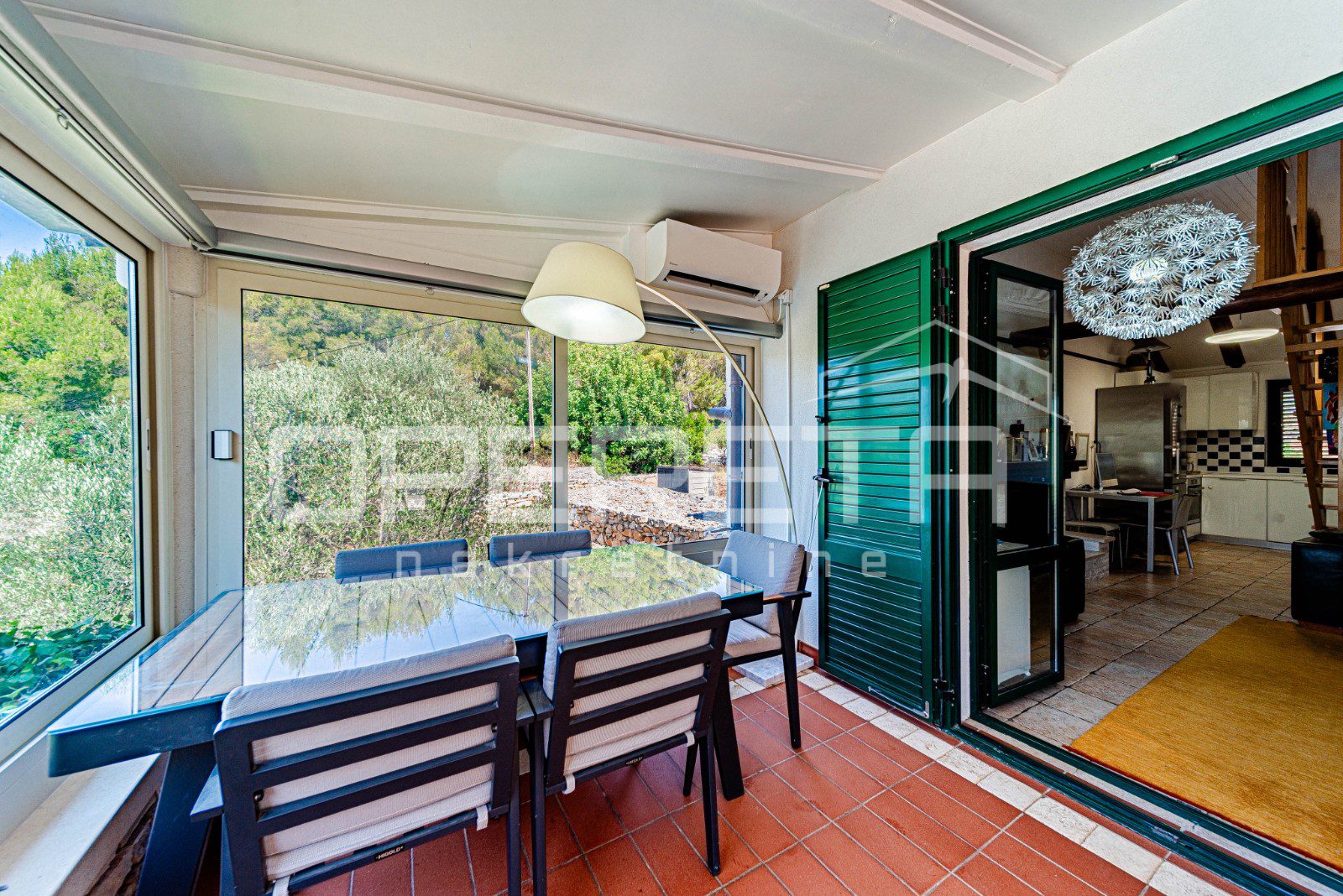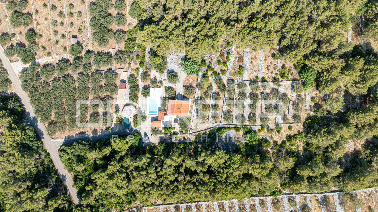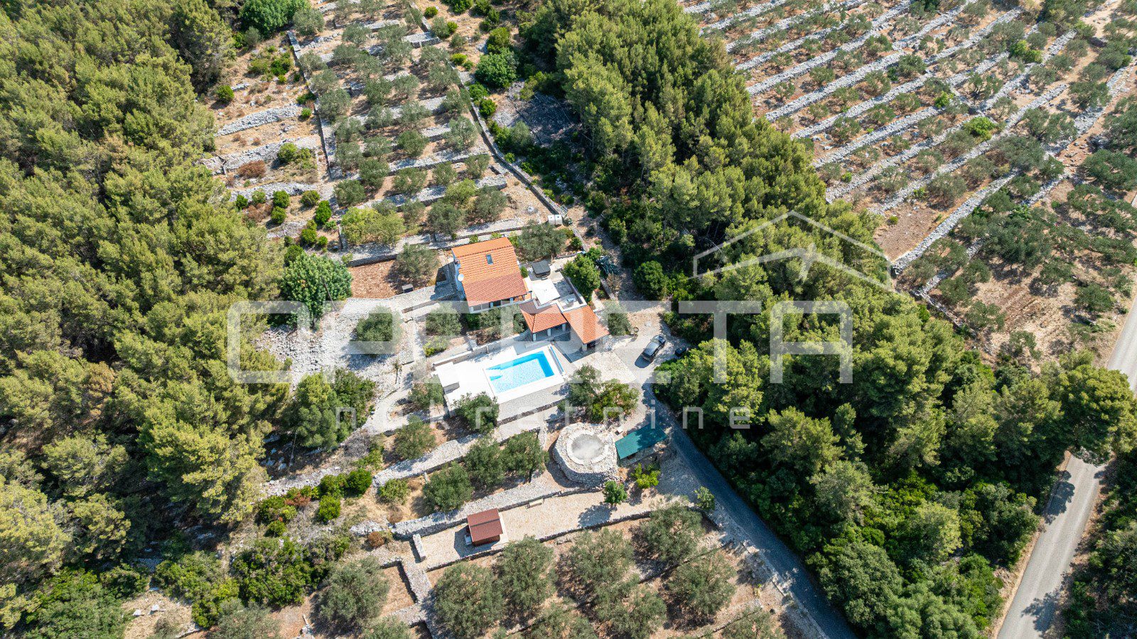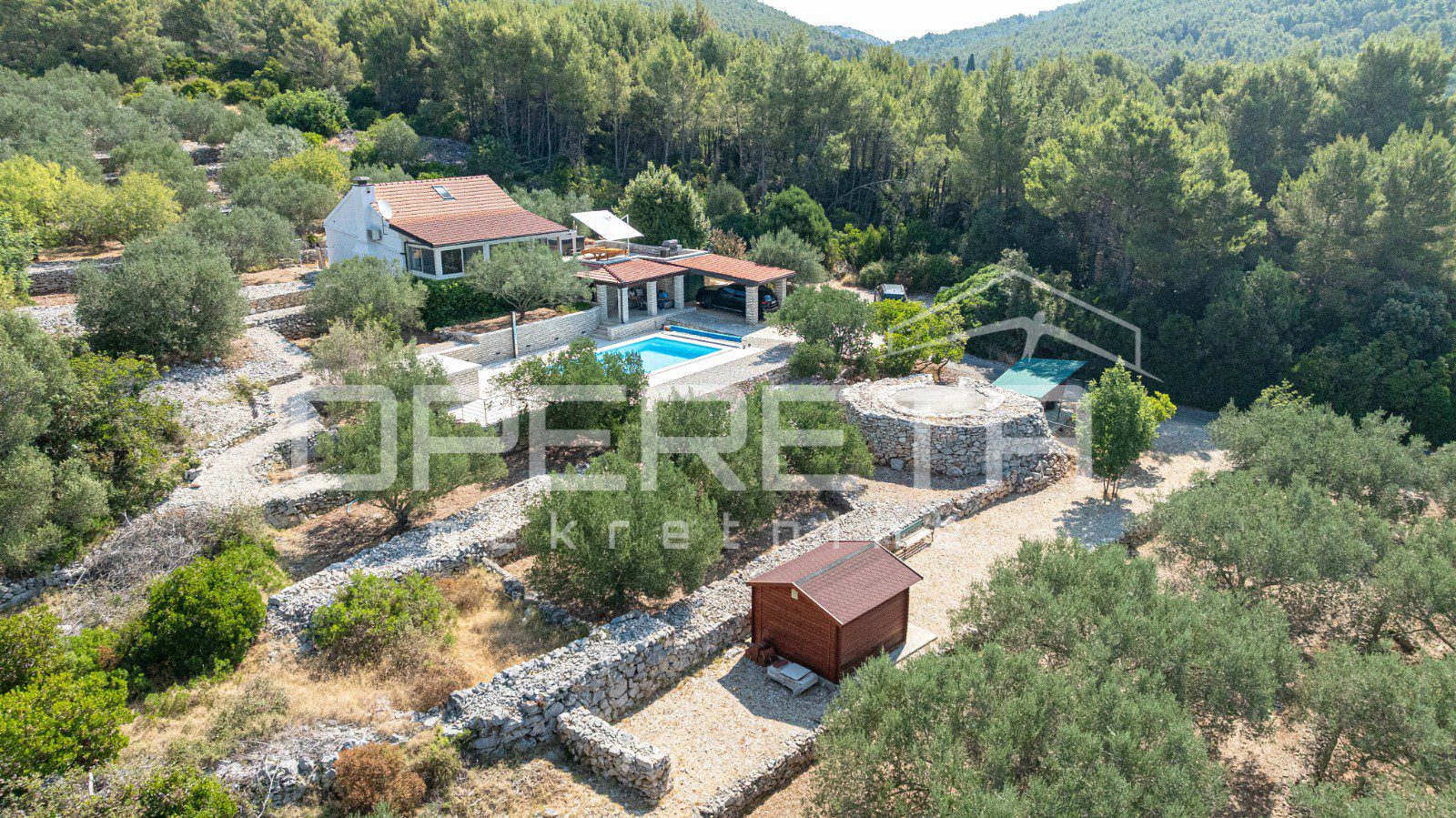 Na parceli od 2914 m², s kamenim suhozidima i pažljivo uređenom okućnicom, smješten je objekt neto stambene površine oko 100 m², raspoređen na dvije etaže. U prizemlju se nalazi moderna kuhinja s blagovaonicom, kupaonica i glavna spavaća soba, dok dnevni boravak besprijekorno komunicira sa zatvorenom terasom zahvaljujući velikoj, visokokvalitetnoj staklenoj stijeni koja omogućuje obilje prirodnog svjetla i neometan pogled na okolnu prirodu. Na katu je smještena dječja soba koja nudi idealan prostor za djecu i obiteljski boravak.
