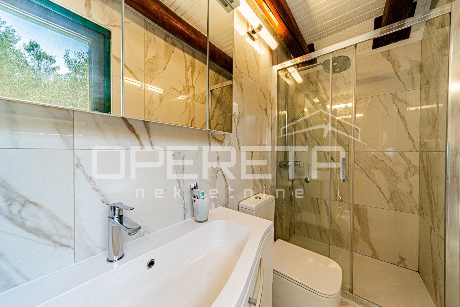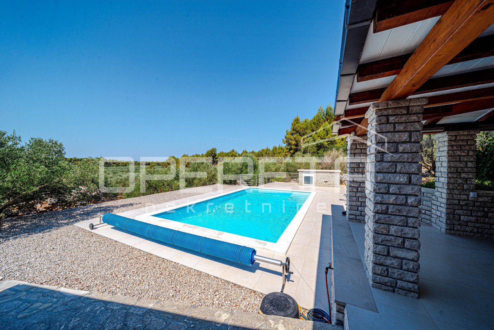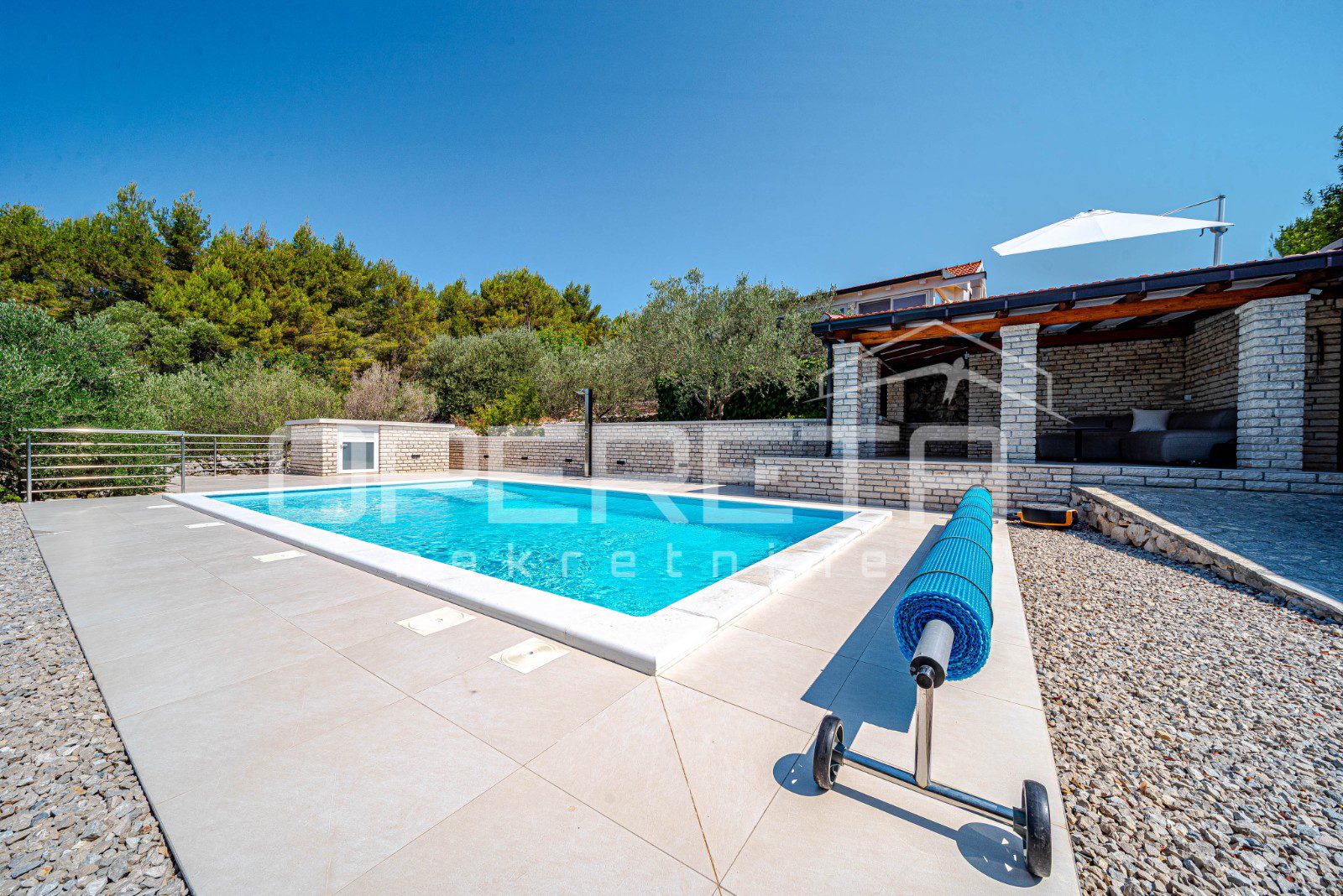 Kuća je pripremljena za cjelogodišnji boravak – središnje grijanje, peć na drva, dvije klimatizacijske jedinice, grijani bazen i jacuzzi osiguravaju maksimalnu udobnost bez obzira na sezonu.
