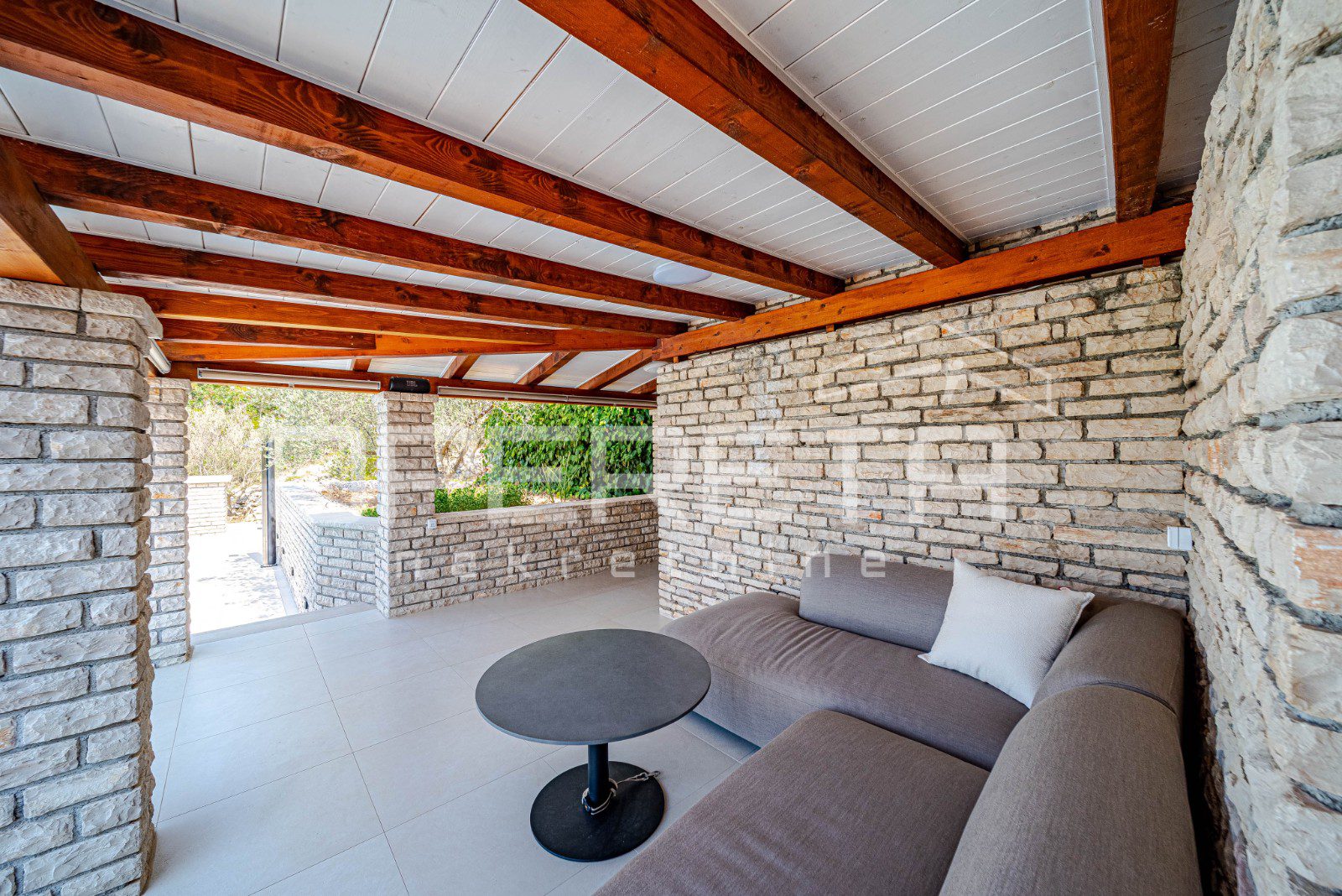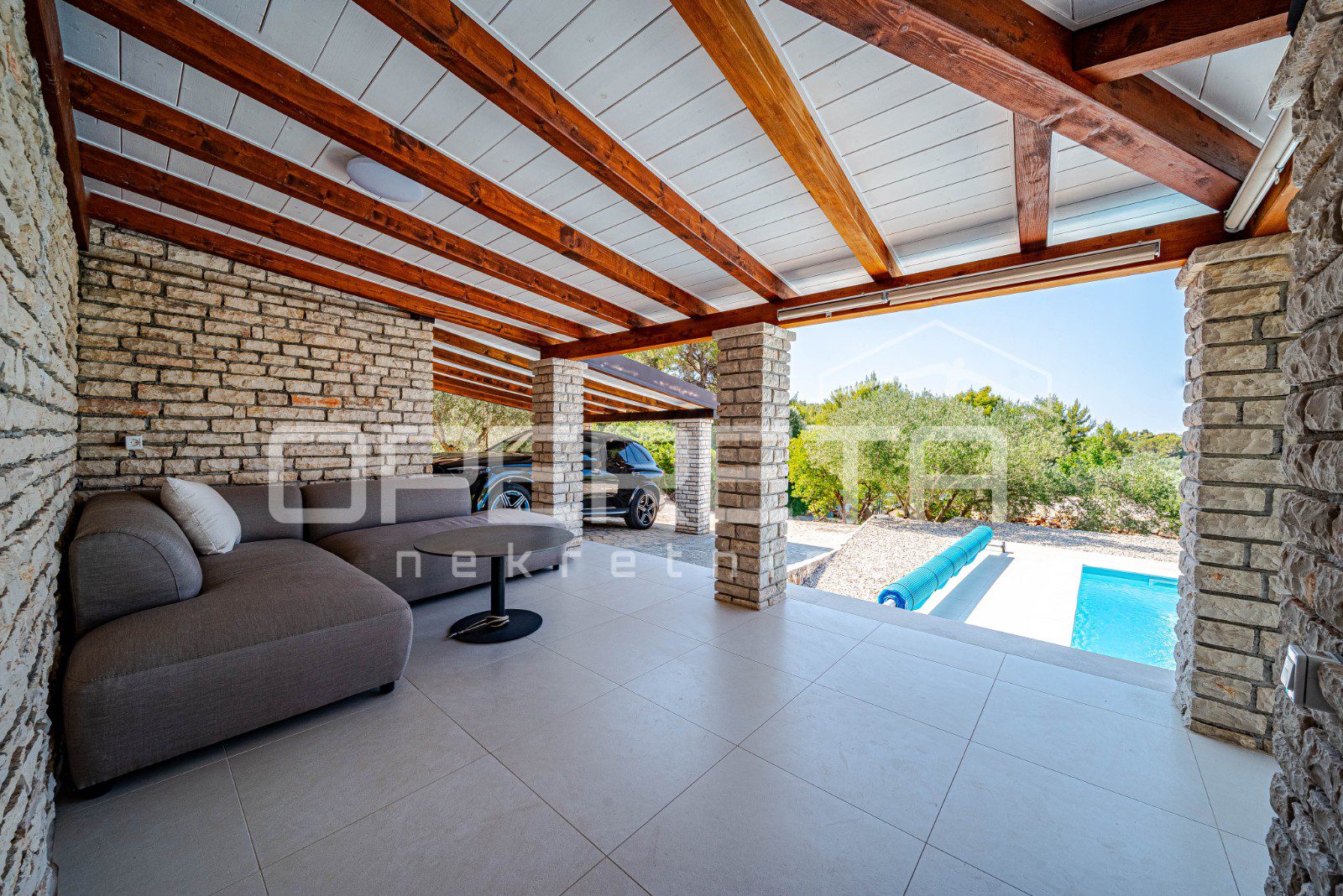 Iz zatvorene terase izlazi se na prostranu vanjsku terasu opremljenu jacuzzijem i vrhunskim roštiljem, idealnu za opuštanje i druženje. Ispod kuće smještena je garaža, natkrivena terasa za vanjska druženja te grijani bazen površine 36 m², koji dodatno proširuju mogućnosti uživanja na otvorenom.