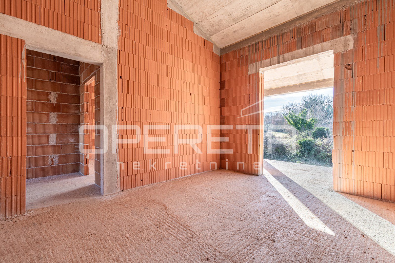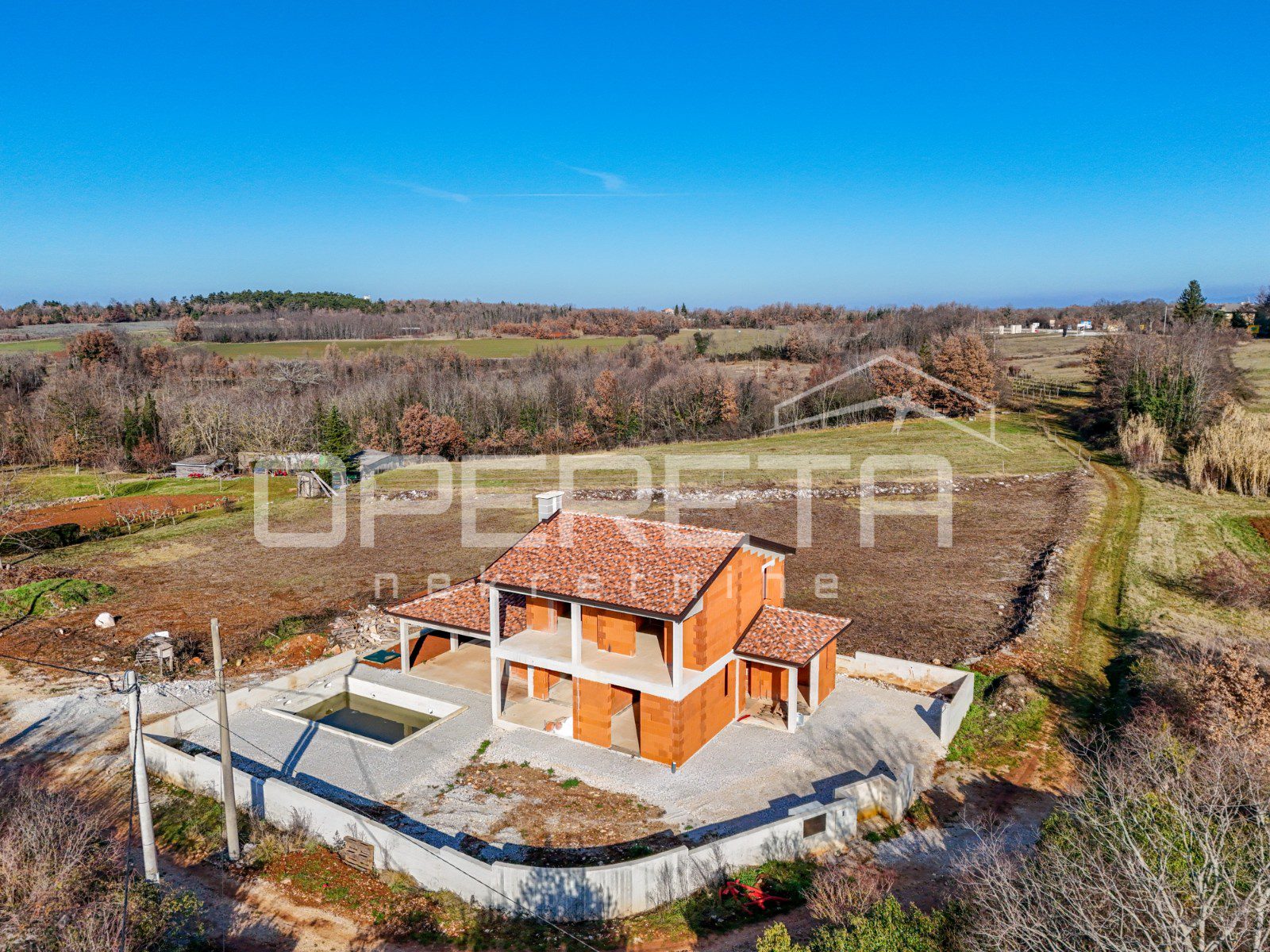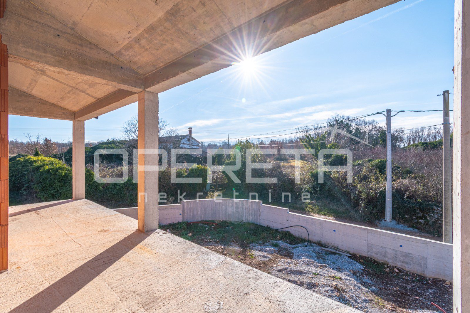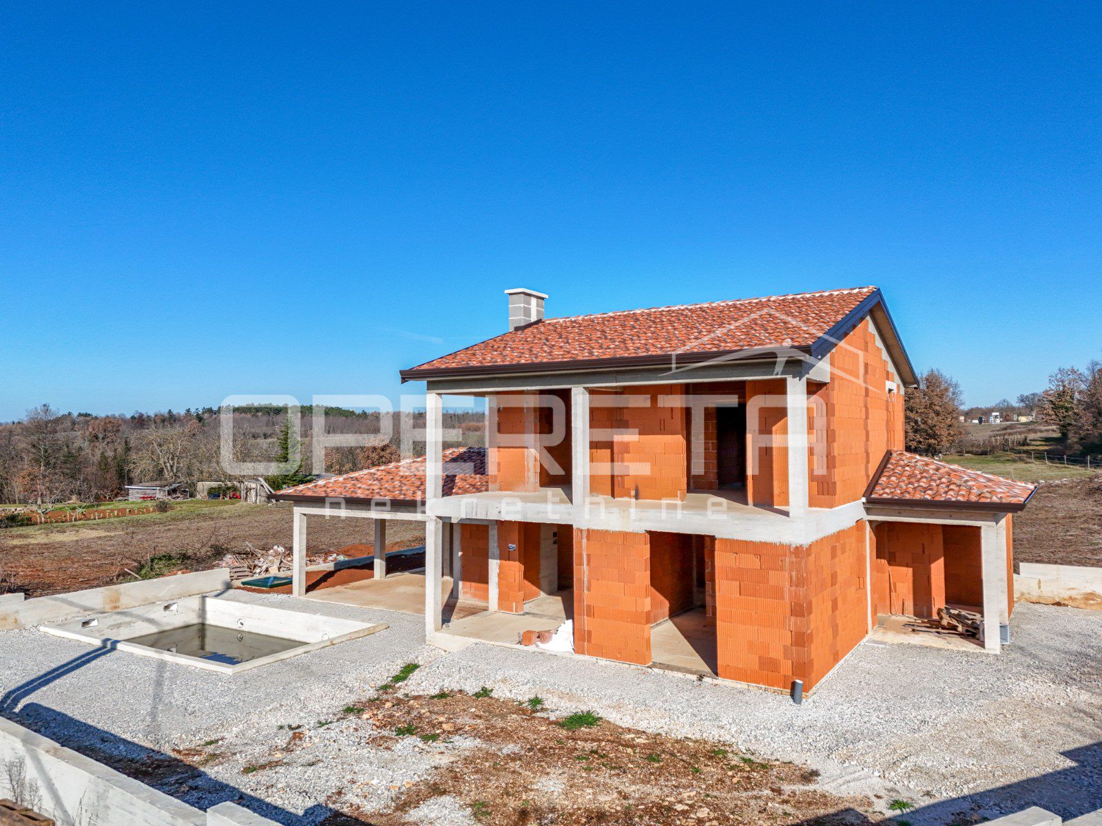 Na mirnoj lokaciji, svega 2 km od centra Višnjana, prodaje se samostojeća kuća u roh bau fazi izgradnje. Ukupna površina nekretnine iznosi 165 m2, a stambeni prostor funkcionalno je raspoređen na dvije etaže. Prizemlje obuhvaća prostrani dnevni boravak s kuhinjom i blagovaonicom koji ima izlaz na terasu, jednu spavaću sobu s vlastitom kupaonicom, gostinjski toalet te spremište. Na katu su smještene još dvije spavaće sobe, svaka sa svojom kupaonicom, te imaju izlaz na zajedničku terasu. Kuća se nalazi na parceli od 555 m2 na kojoj je smješten i bazen površine 28 m2. Nekretnina se prodaje u trenutnom stanju što novom vlasniku pruža mogućnost završnog uređenja prema vlastitim željama, a priključci za struju i vodu već su uključeni u cijenu.