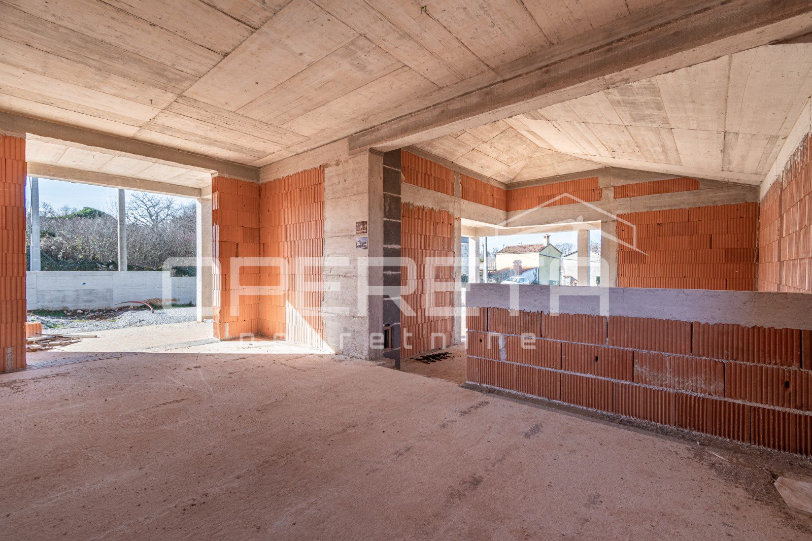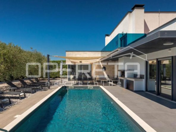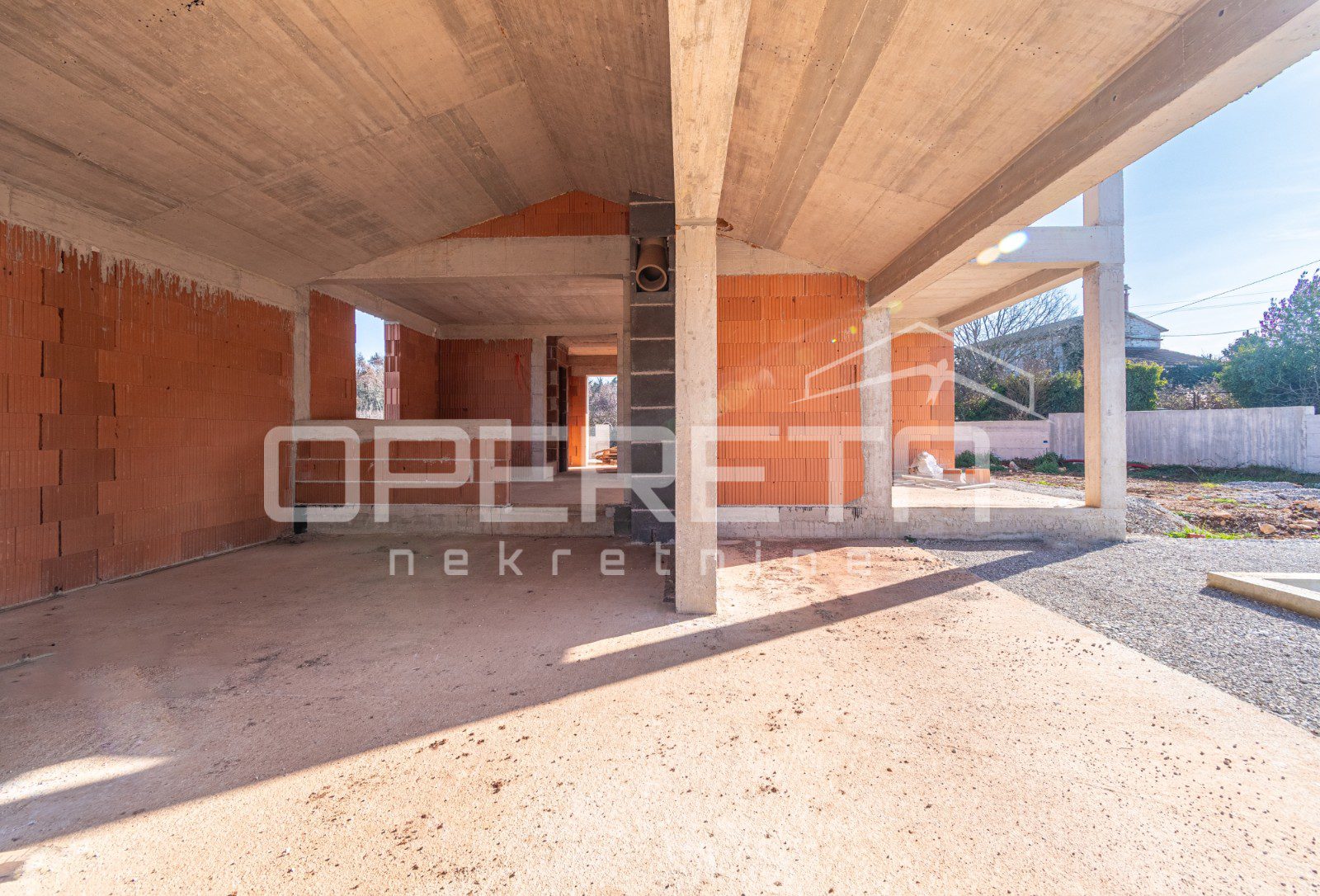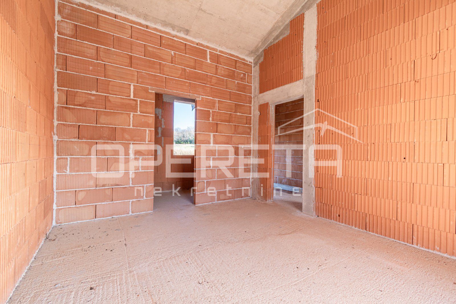 Na mirnoj lokaciji, svega 2 km od centra Višnjana, prodaje se samostojeća kuća u roh bau fazi izgradnje. Ukupna površina nekretnine iznosi 165 m2, a stambeni prostor funkcionalno je raspoređen na dvije etaže. Prizemlje obuhvaća prostrani dnevni boravak s kuhinjom i blagovaonicom koji ima izlaz na terasu, jednu spavaću sobu s vlastitom kupaonicom, gostinjski toalet te spremište. Na katu su smještene još dvije spavaće sobe, svaka sa svojom kupaonicom, te imaju izlaz na zajedničku terasu. Kuća se nalazi na parceli od 555 m2 na kojoj je smješten i bazen površine 28 m2. Nekretnina se prodaje u trenutnom stanju što novom vlasniku pruža mogućnost završnog uređenja prema vlastitim željama, a priključci za struju i vodu već su uključeni u cijenu.