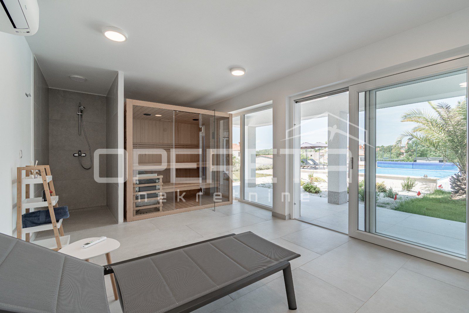 Prizemlje sastoji se od prostranog dnevnog boravka, kuhinje s blagovaonom stvaraju s izlaskom na vanjski sadržaj, uključujući prostranu natkrivenu terasu a u nastavku nalazi se bazen dimenzija 8,2 x 5 m, okružen sa 150 m² sunčališta te povezana strojarnica, a grijanje je rješeno putem dizalice topline koji omogućuje korištenje tijekom cijele godine.