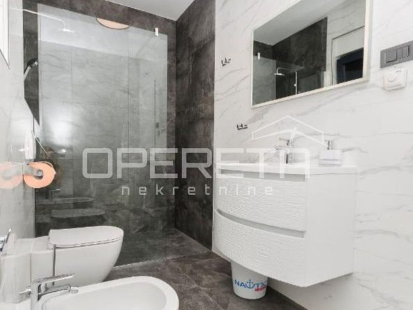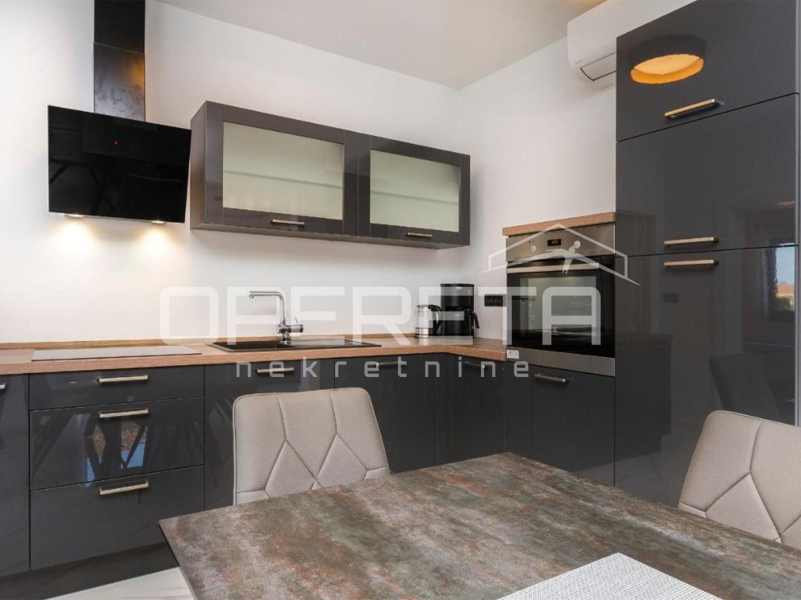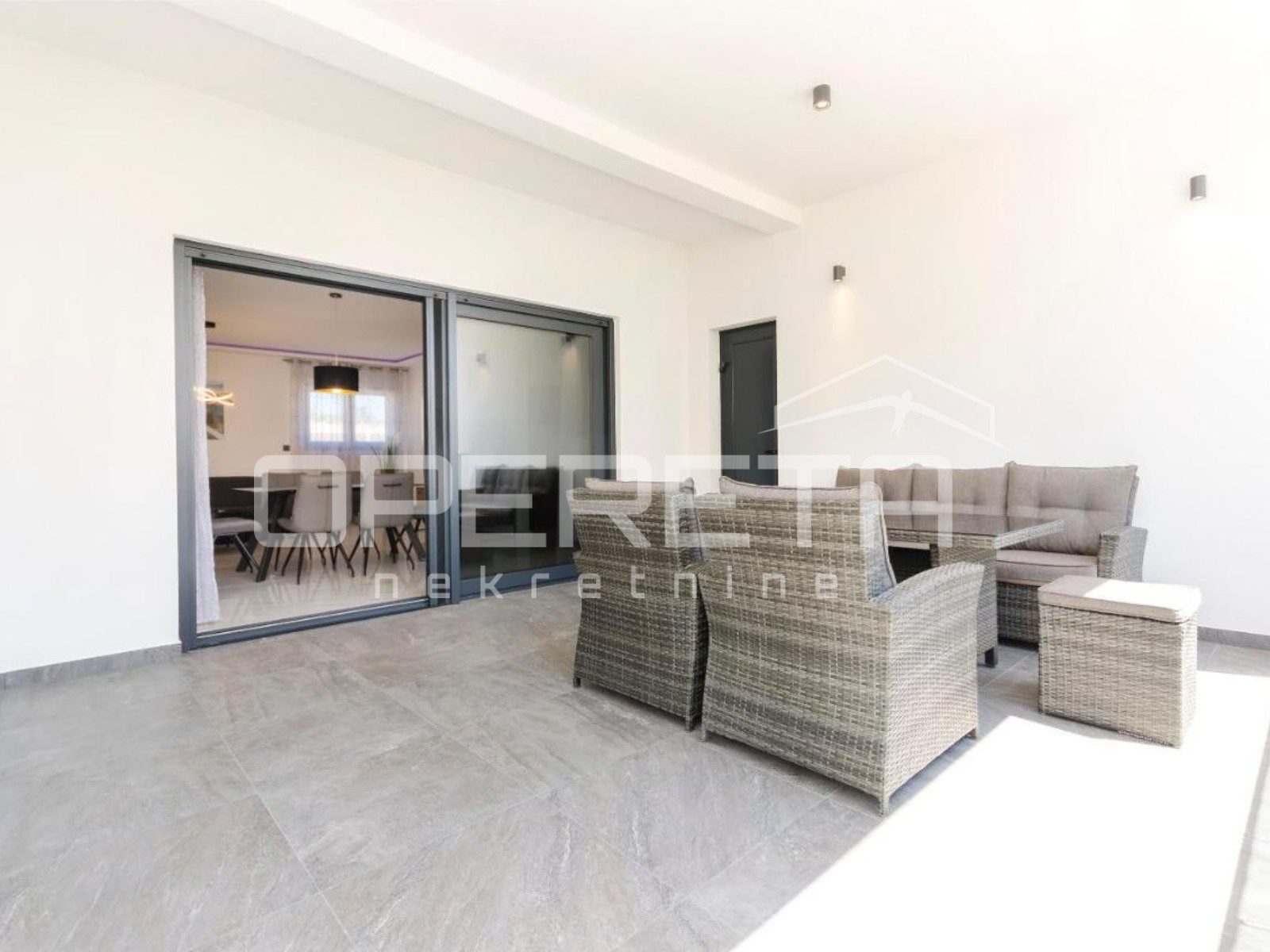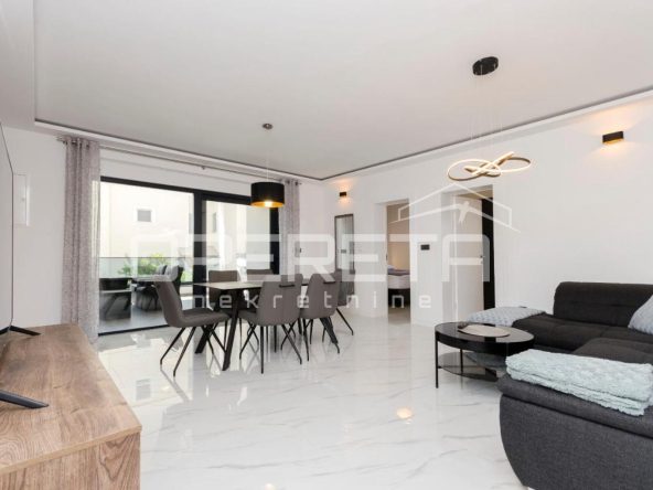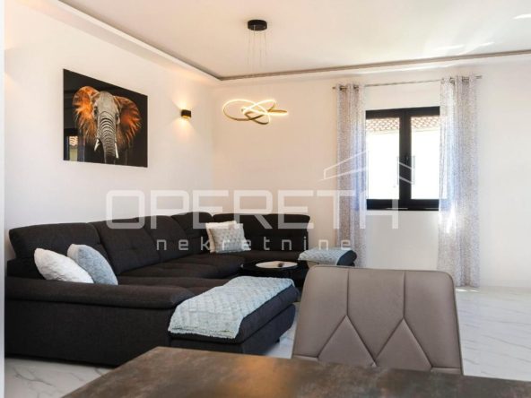 Kuća je opremljena modernim sustavima za ugodan boravak tijekom cijele godine, podnim grijanjem u dnevnim sobama i kupaonicama, električnim podizačima roleta, solarnim panelima, dizalicom topline, spremištem, vešerajem itd.