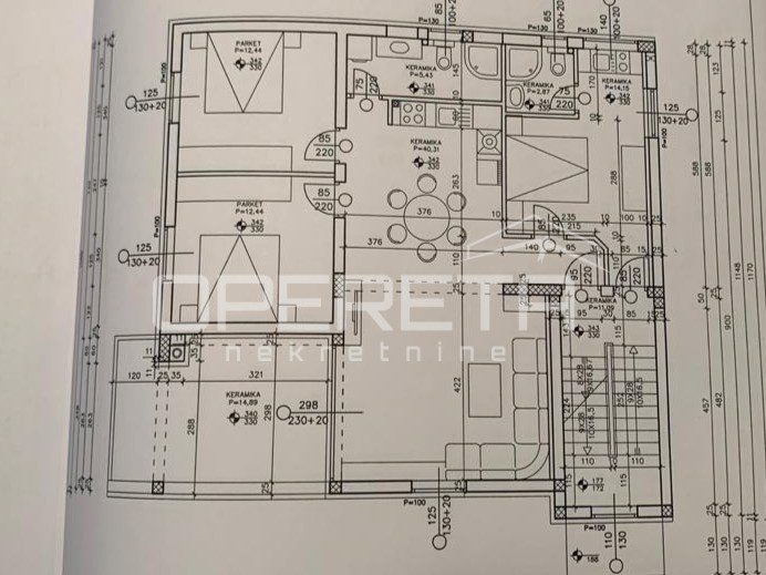 U prizemlju se nalazi apartman ukupne površine 84 m2, koji se sastoji od 2 spavaće sobe, kupaonice, dnevnog boravka, kuhinje i blagovaonice s izlazom na terasu površine 20m2. Na prvom i drugom katu smješten je po jedan dvosobni apartman površine 85 m² te po jedan studio apartman od 17 m², što ukupno čini pet odvojenih smještajnih jedinica.
