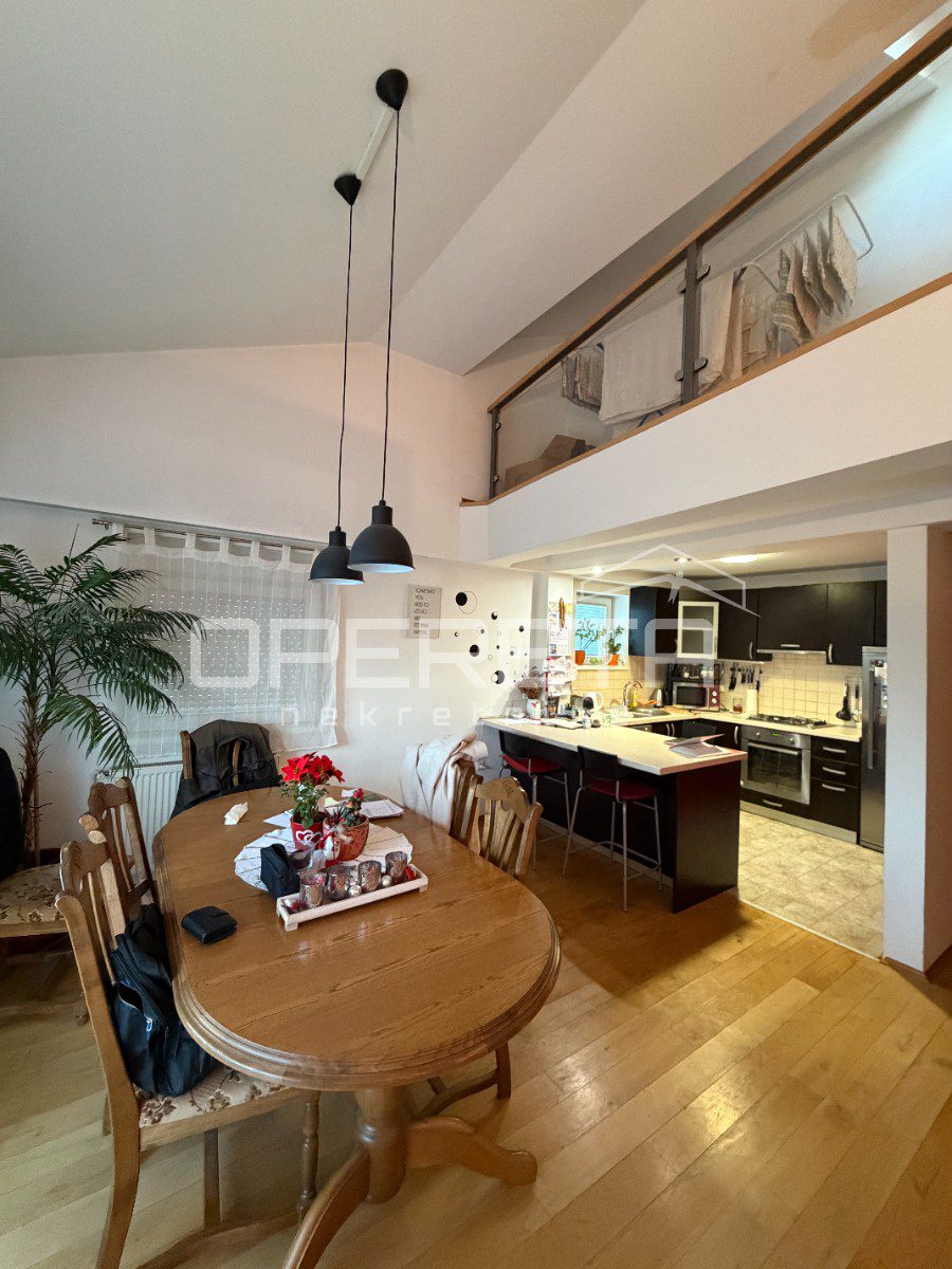 PRODAJA, KUĆA, ZABOK, Ulica Pavlovec Zabočki, 224 m2 stambenog dijela i 108,73 m2 pomoćne samostojeće građevine koja se sastoji od garaže u prizemlju, skladišnog prostora i velikog potkrovlja otvorenog koncepta. Kuća se sastoji od odvojenog životnog prostora u prizemlju (vlasnik davao u najam) i kata koji je vrlo atraktivan zbog visokog stropa i galerije koja vodi do dvije spavaće sobe. Ukupna veličina parcele je 881 m2 nadomak centru Zaboka (vrtić, škola, trgovina, bus, vlak, Tuheljske toplice).