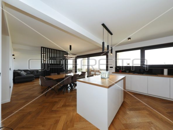 Iznimna površina vile je dala prednost izvedbe velikih prostorija, a sadrži 5 spavaćih soba, 4 kupaonice, 1 radne sobe, walk-in ormar i prostirani otvoreni dnevnih boravak s blagovaonicom i kuhinjom, površinom preko 50 m2. Svaka gornja etaža ima svoju terasu koja gleda prema moru.