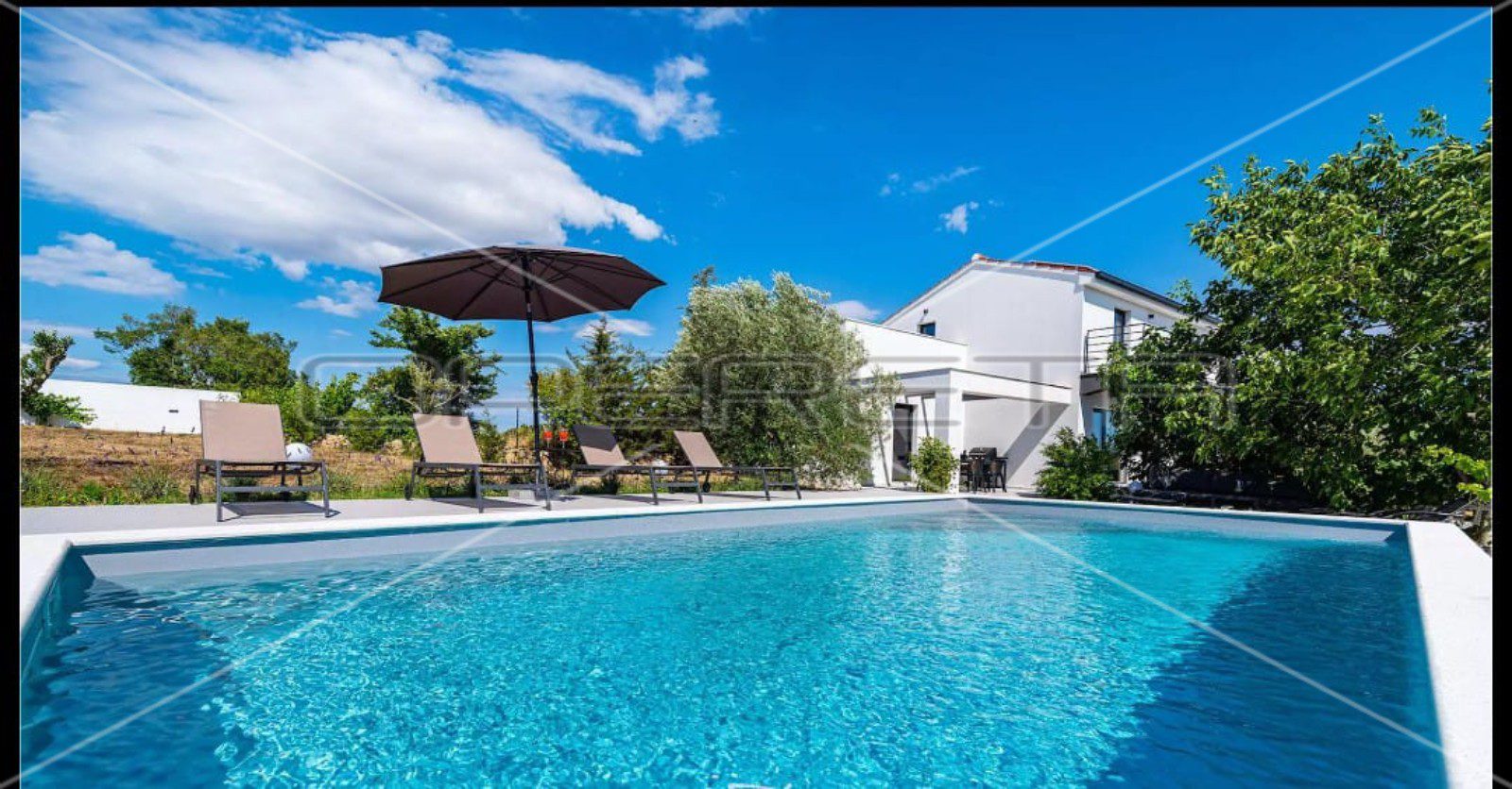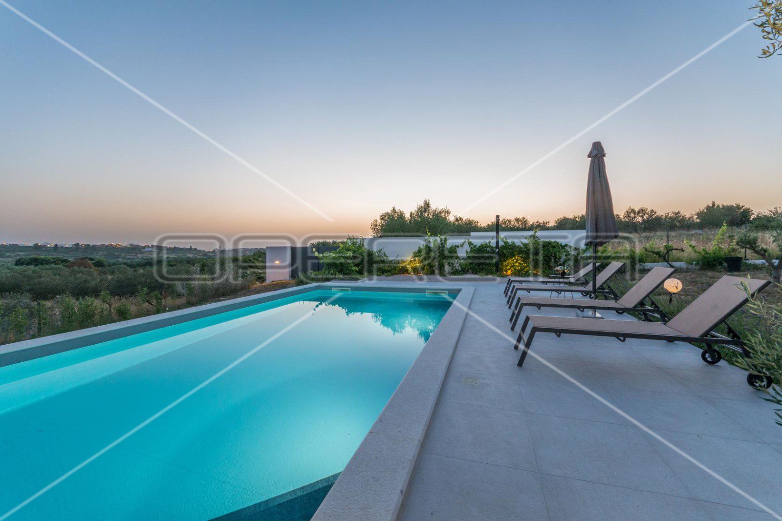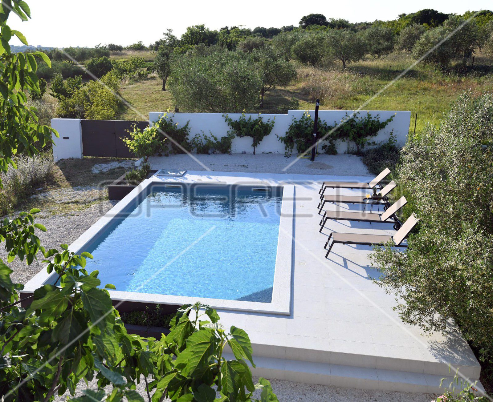 Vanjština ove vile posebno je dizajnirana kako bi istaknula harmoniju s prirodom. Velika ograđena okućnica prekrivena maslinama, trešnjama, smokvama i vinovom lozom pruža idiličan ambijent, dok impozantno stablo hrasta koje se uzdiže pored bazena nudi prirodnu hladovinu tijekom vrućih ljetnih dana. Ovdje bazen, okružen sunčalištem, predstavlja dodatnu zonu za opuštanje, idealnu za bijeg od svakodnevnih briga.
