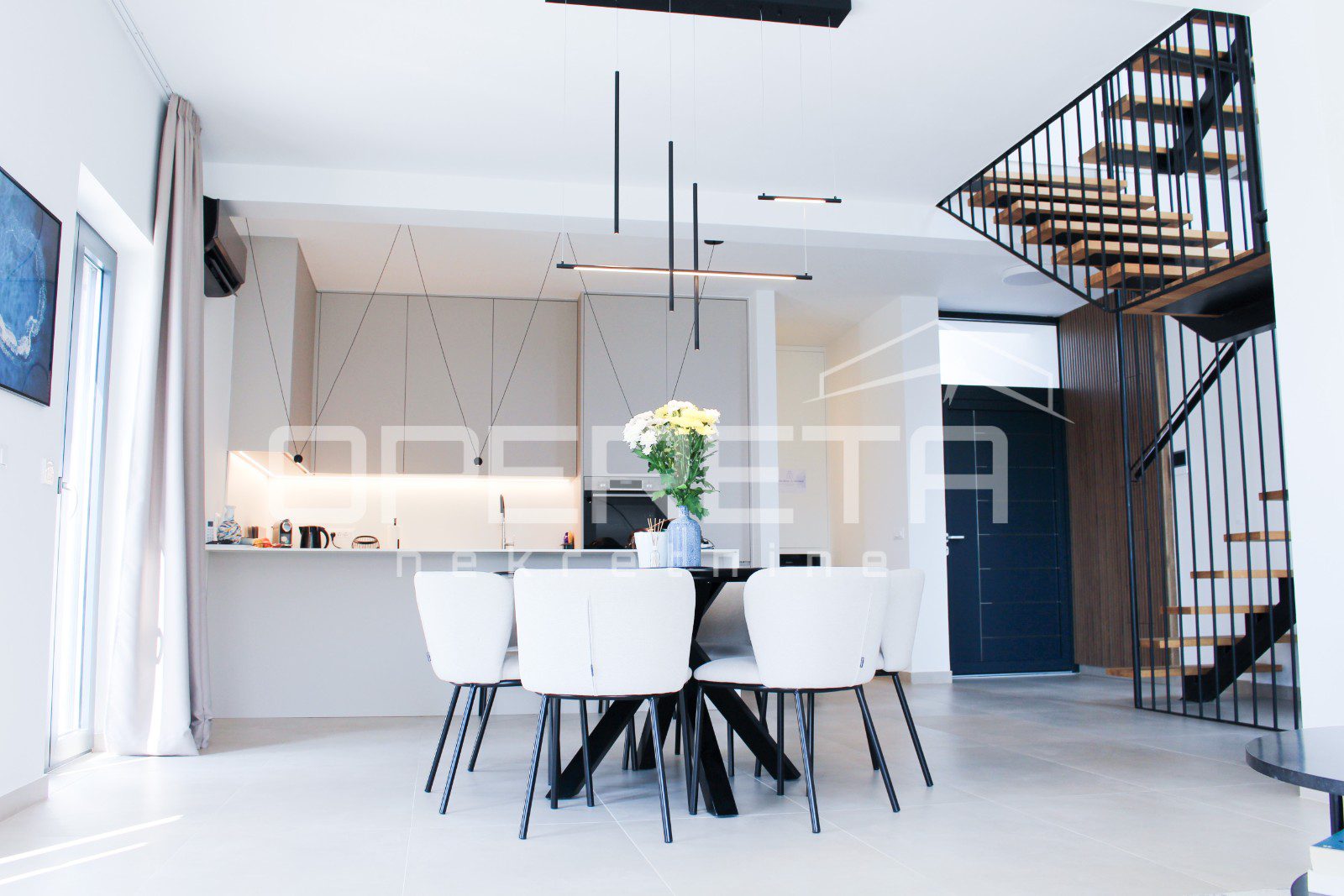 Prizemlje nudi elegantan dnevni prostor otvorenog koncepta – moderno opremljenu kuhinju, blagovaonicu i raskošno uređeni dnevni boravak. Tu su i gostinjski toalet te diskretno smješteno spremište.