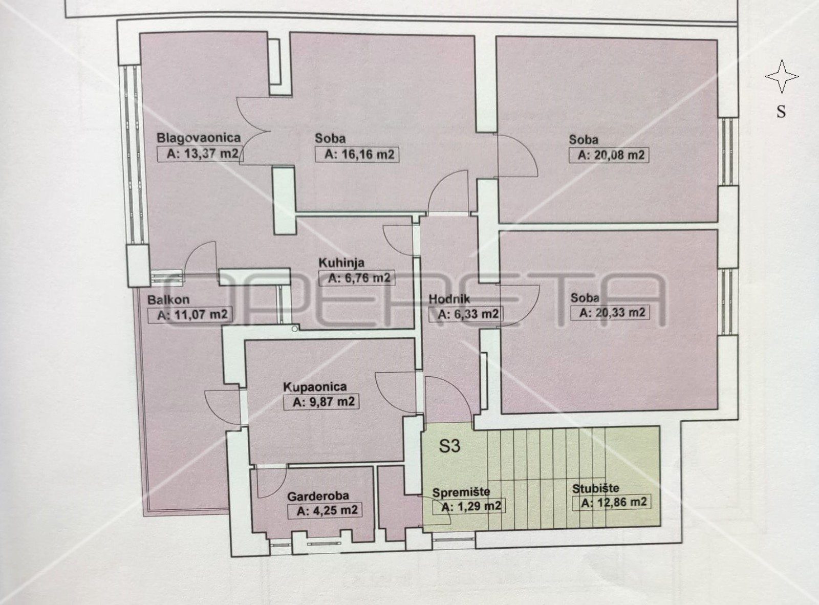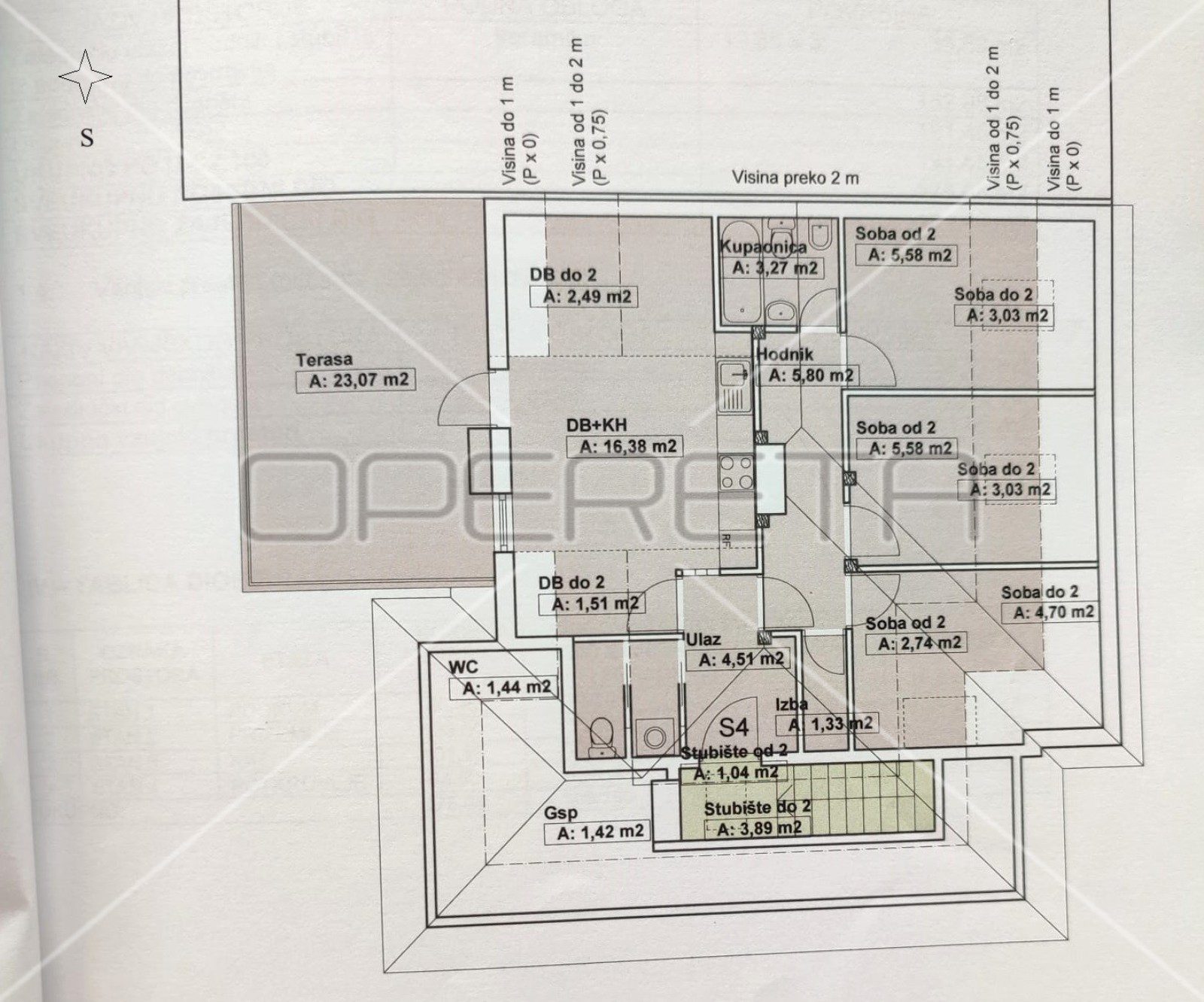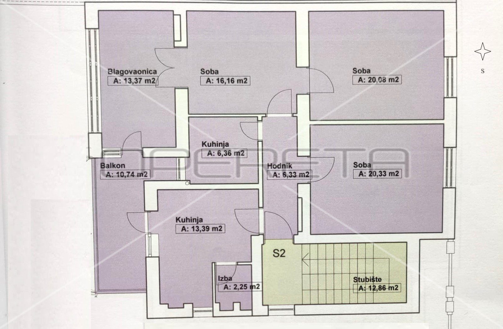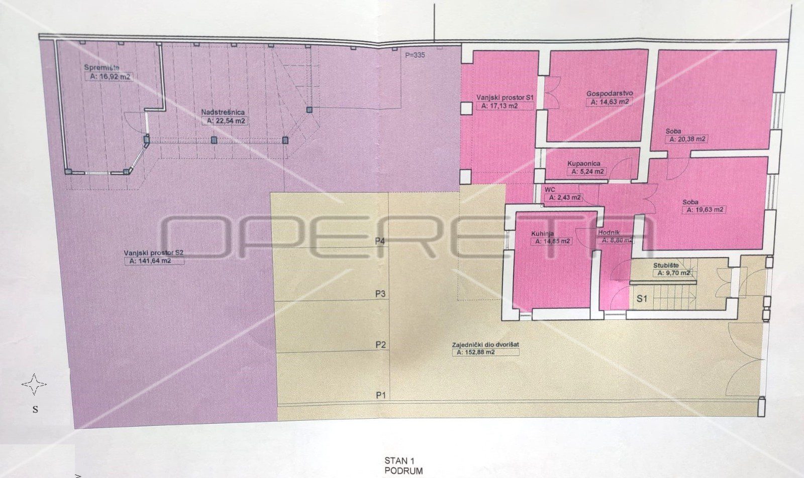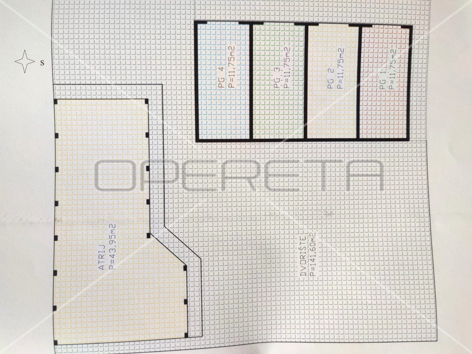 Sastoji se 4 građanska stana: od podruma (85,95m2), prizemlja (123,50m2), kata (101,10m2) i potkrovlja (obračunato s koeficijentima 64,50m2). Ima 311m2 dvorišta u kojemu je uređena natkrivena terasa za zajednička druženja, te parkirna mjesta.