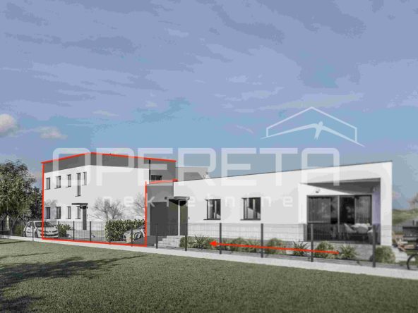 Visoko prizemlje (84,36m2) se sastoji od ulaznog dijela koji je povezan s blagovaonicom, odvojene kuhinje, dnevnog boravka, toaleta, velike terase (60m2) s pogledom na grad te stepeništa koje vodi na prvi kat (59,94m2) gdje su smještene dvije spavaće sobe, kupaonica i mala terasa.