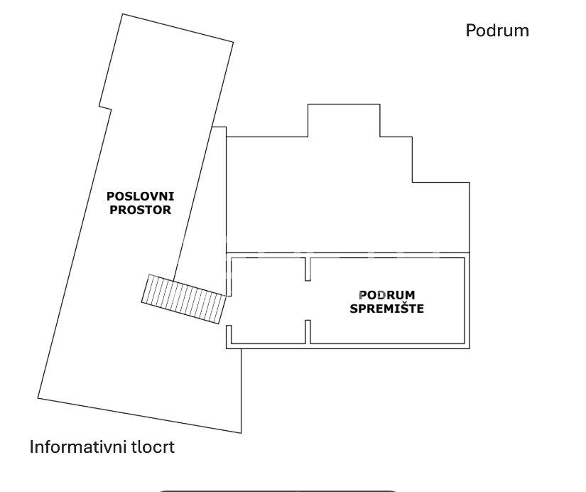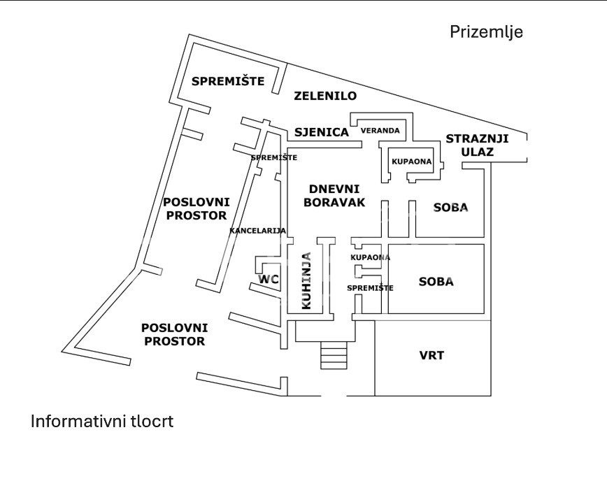 U prizemlju se nalazi samostalni poslovni prostor koji uključuje radionički dio s uličnim ulazom i odličnom vidljivošću te spremište koje je funkcionalno povezano s ostatkom poslovne jedinice.