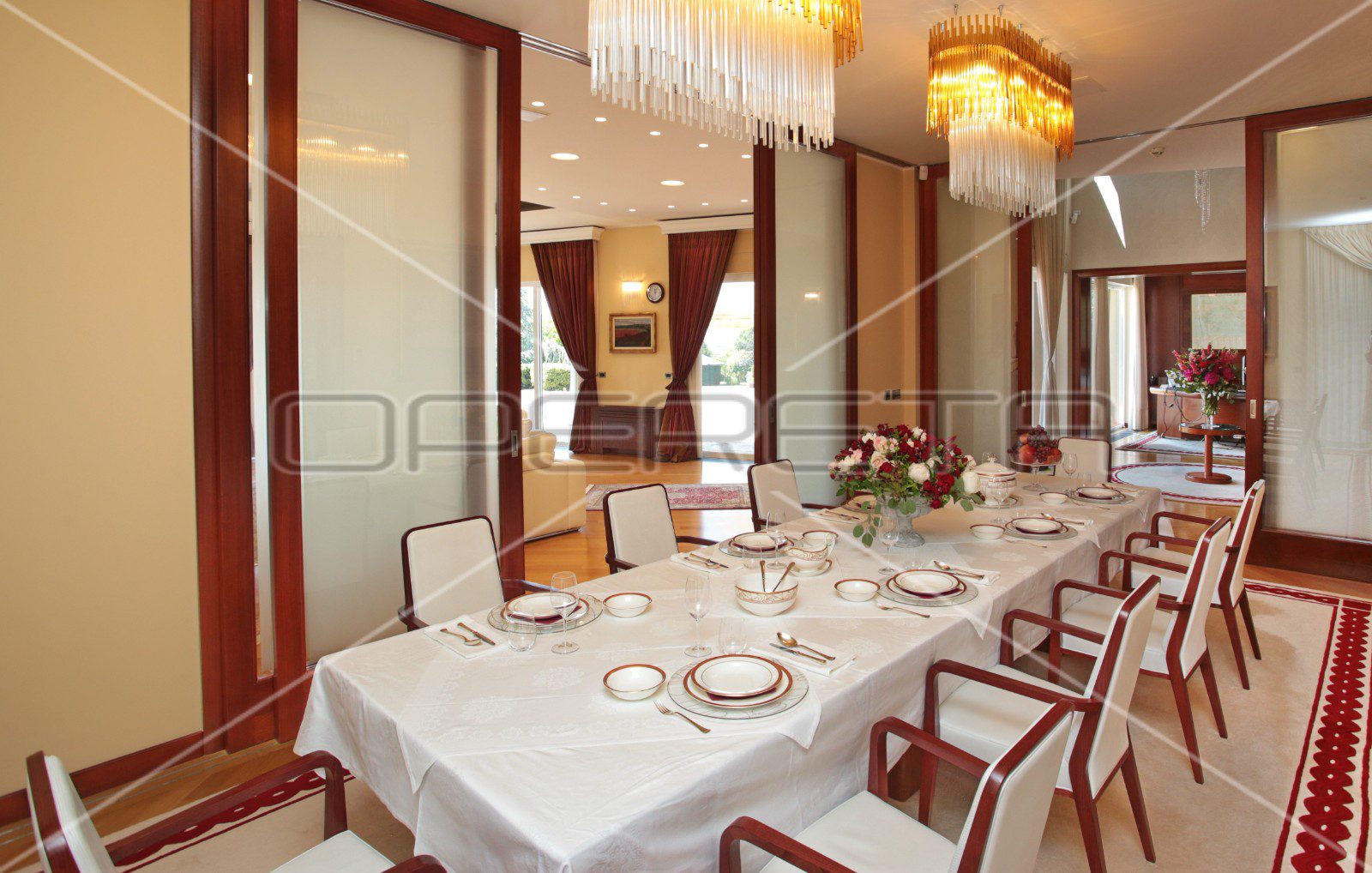 U glavnom dijelu dnevnog prostora smješten je prostrani boravak povezan s velikom blagovaonicom i radnom sobom koji zajedno odišu bogatom atmosferom komfora i raskošnosti.