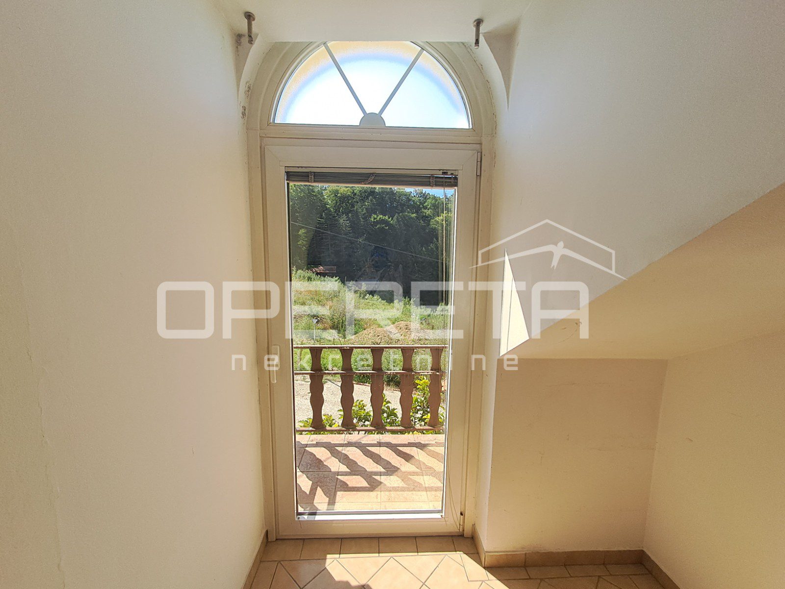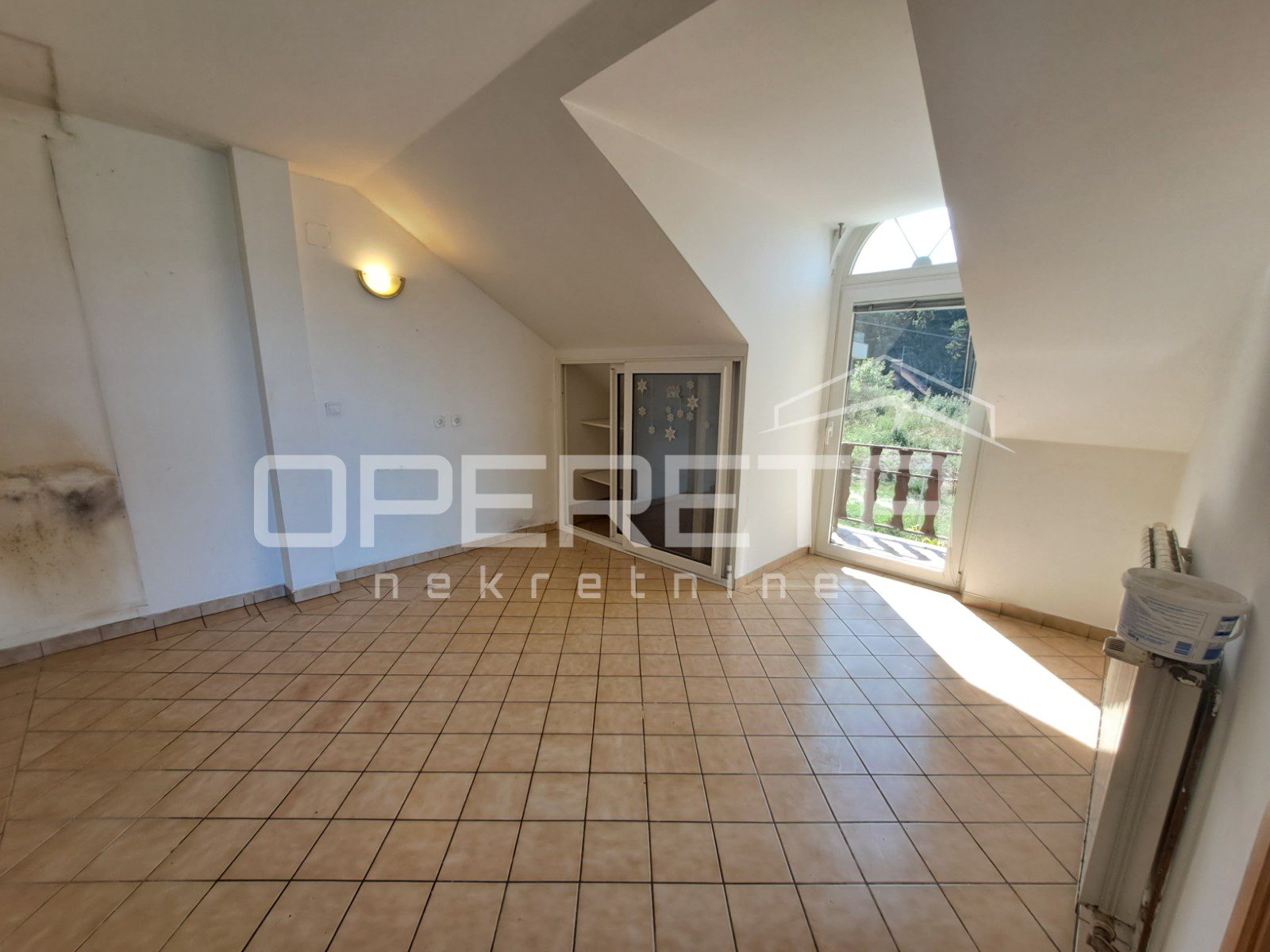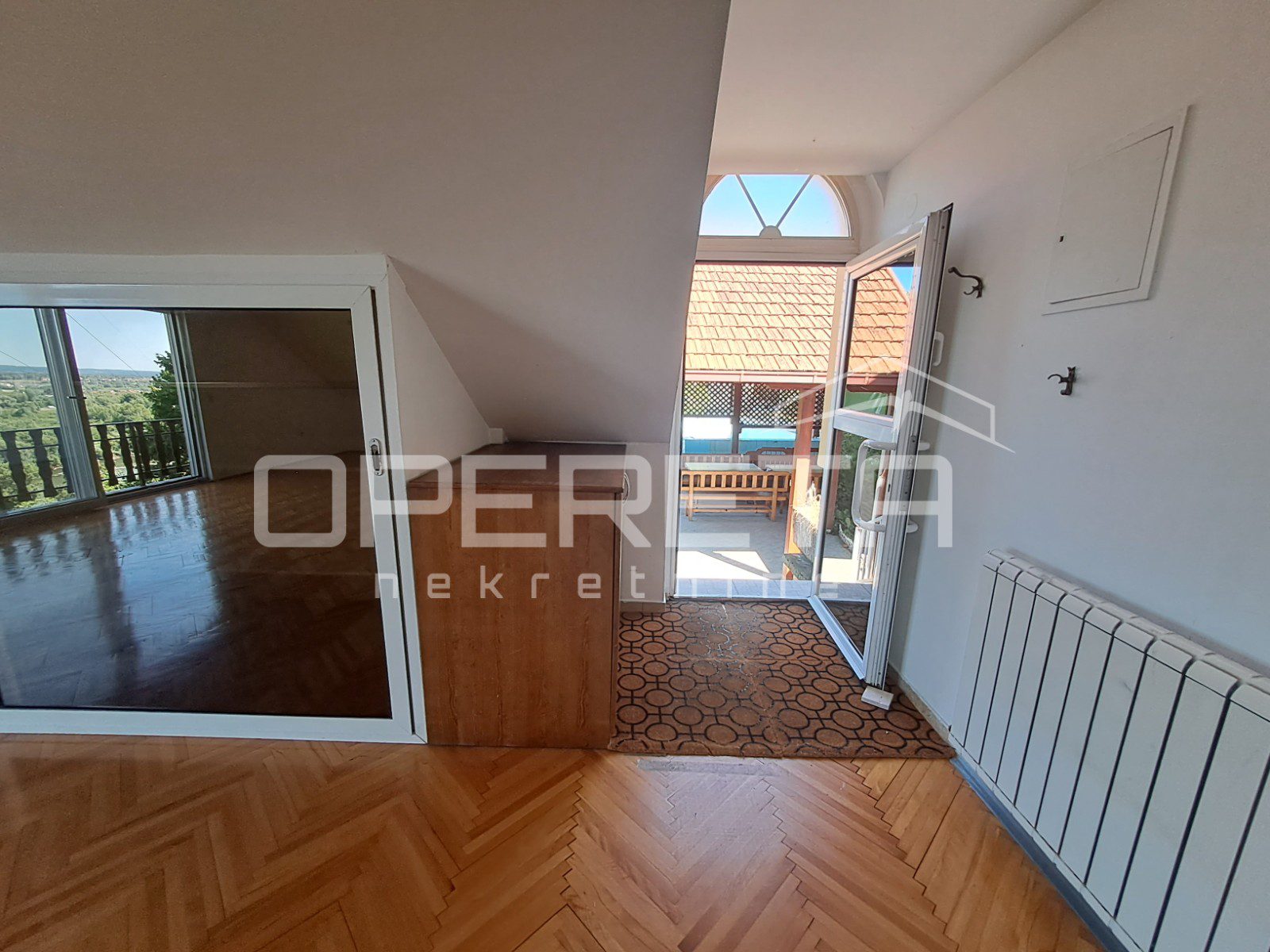 Na gornjoj, potkrovnoj etaži nalazi se stan od 103 m2 s velikim open space prostorom dnevnog boravka (56 m2), spavaćom sobom, kuhinjom s blagovaonicom, kupaonicom, te loggiom i balkonom. Ulaz na kat je kroz natkrivenu terasu. Ta terasa s ugrađenim kaminom je srce kuće i njen prekrasan dio. Prostor za druženje i boravak na zraku veći dio godine. Odmah pored je bazen od 26m2, a iza njega pomoćna kućica od 24m2. Uz kuću je garaža za dva auta. U podrumskoj etaži ( 36 m2) smješten je vinski podrum s prostorom za degustaciju i druženje.