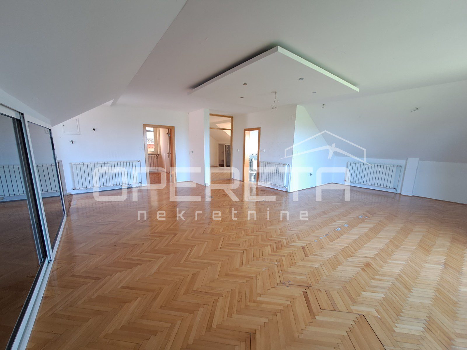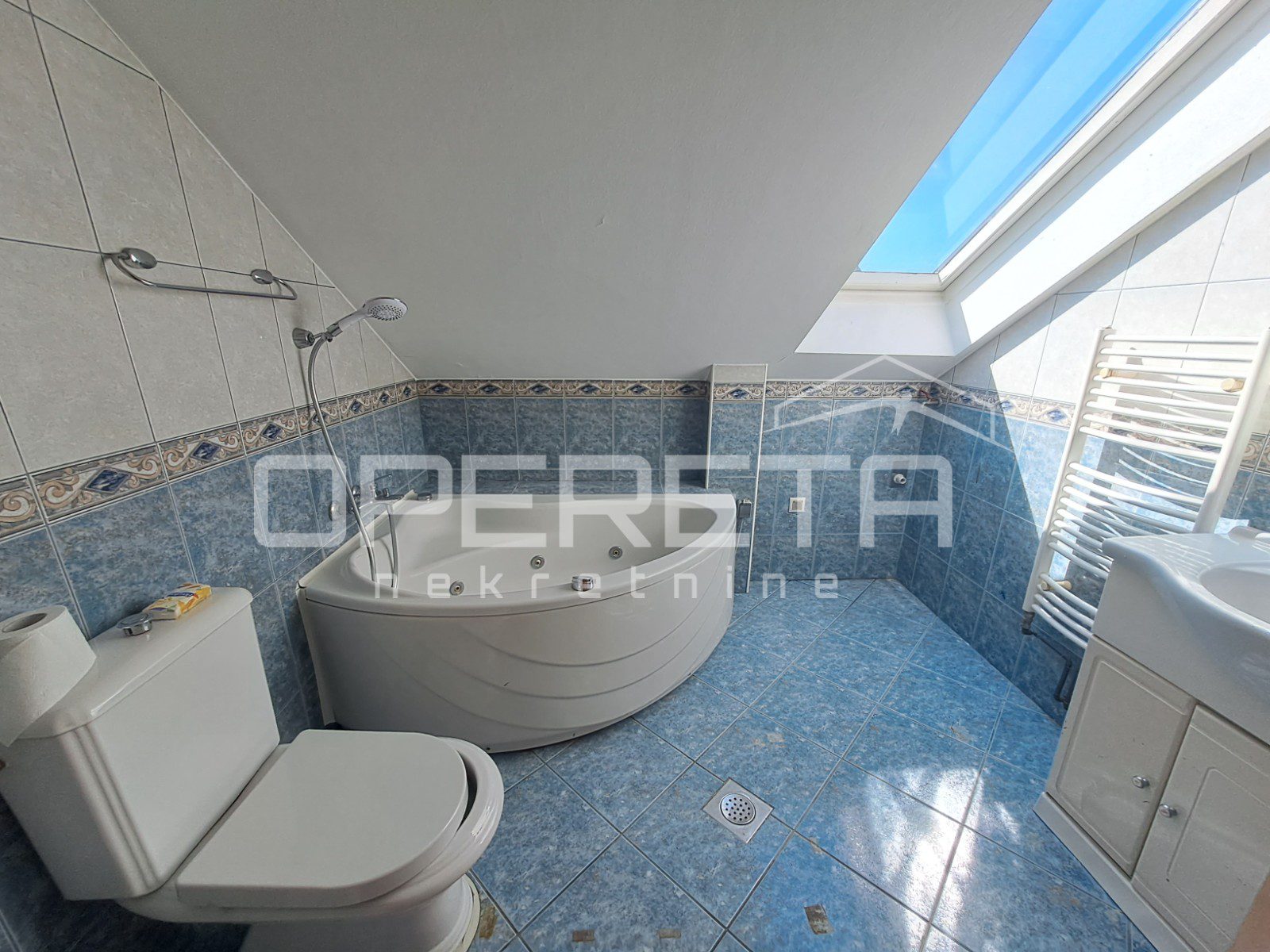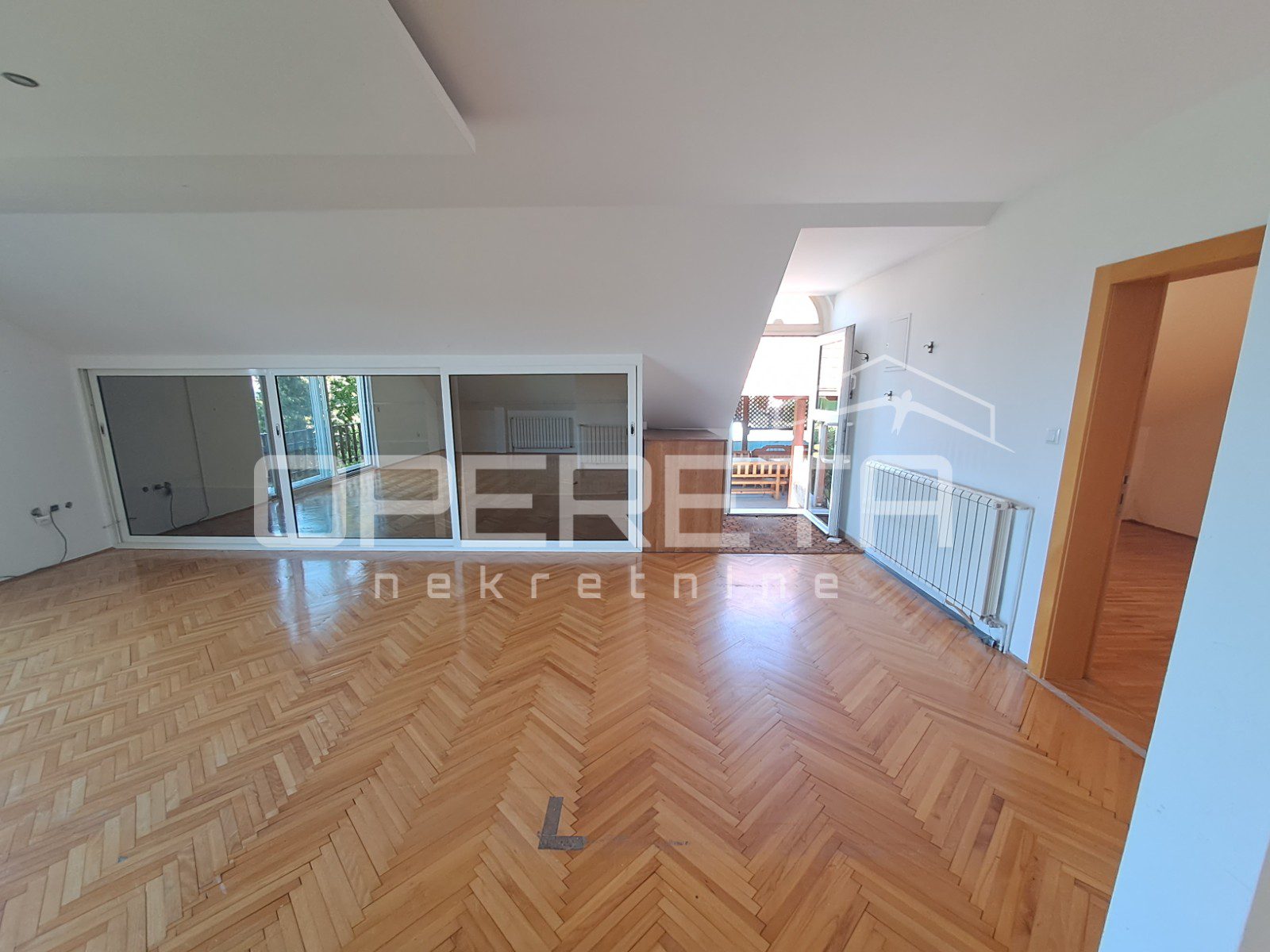 Na gornjoj, potkrovnoj etaži nalazi se stan od 103 m2 s velikim open space prostorom dnevnog boravka (56 m2), spavaćom sobom, kuhinjom s blagovaonicom, kupaonicom, te loggiom i balkonom. Ulaz na kat je kroz natkrivenu terasu. Ta terasa s ugrađenim kaminom je srce kuće i njen prekrasan dio. Prostor za druženje i boravak na zraku veći dio godine. Odmah pored je bazen od 26m2, a iza njega pomoćna kućica od 24m2. Uz kuću je garaža za dva auta. U podrumskoj etaži ( 36 m2) smješten je vinski podrum s prostorom za degustaciju i druženje.