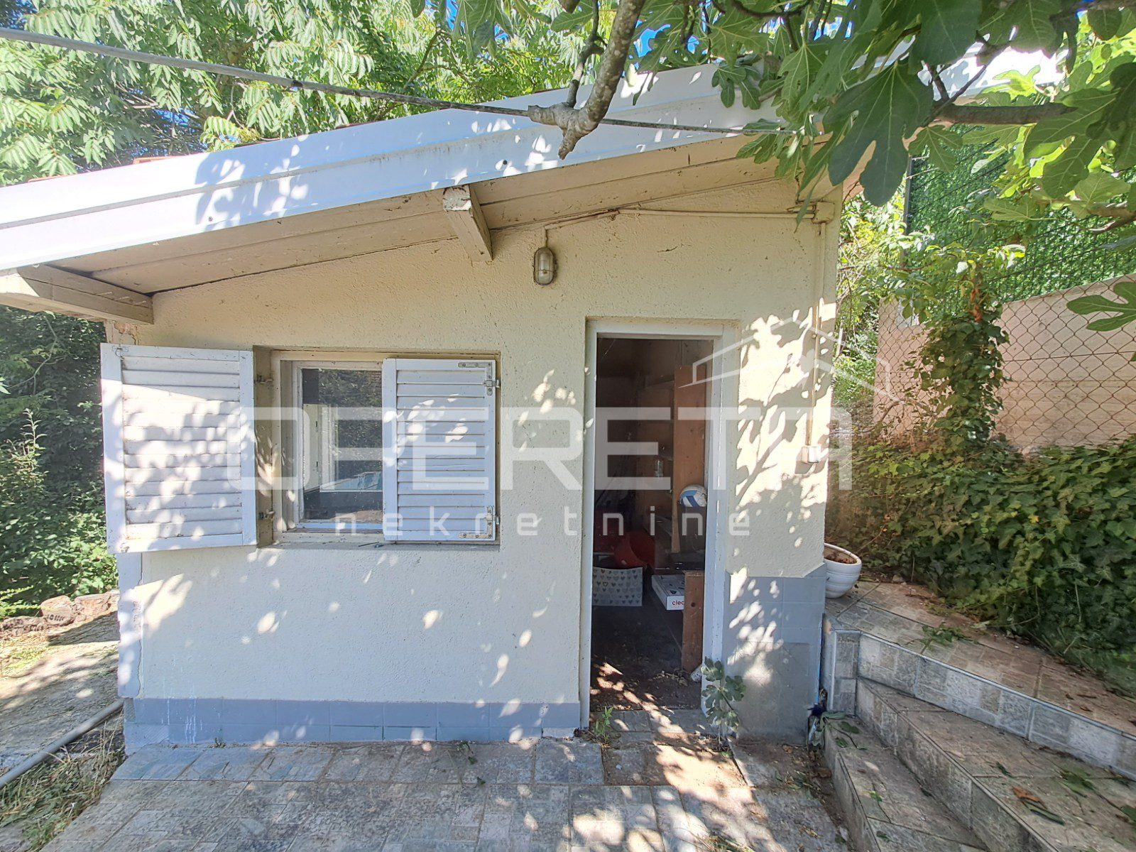 U prizemlju je zasebni stan, s dvije spavaće sobe, dnevnim boravkom s kuhinjom i blagovaonicom, te kupaonica ( ukupno 67 m2 ) s izlazom na terasu ( 24 m2 ) na koju se nadovezuje travnjak, voćnjak i vrt.