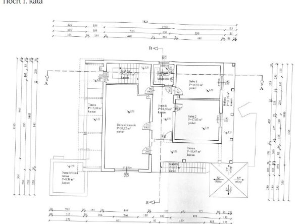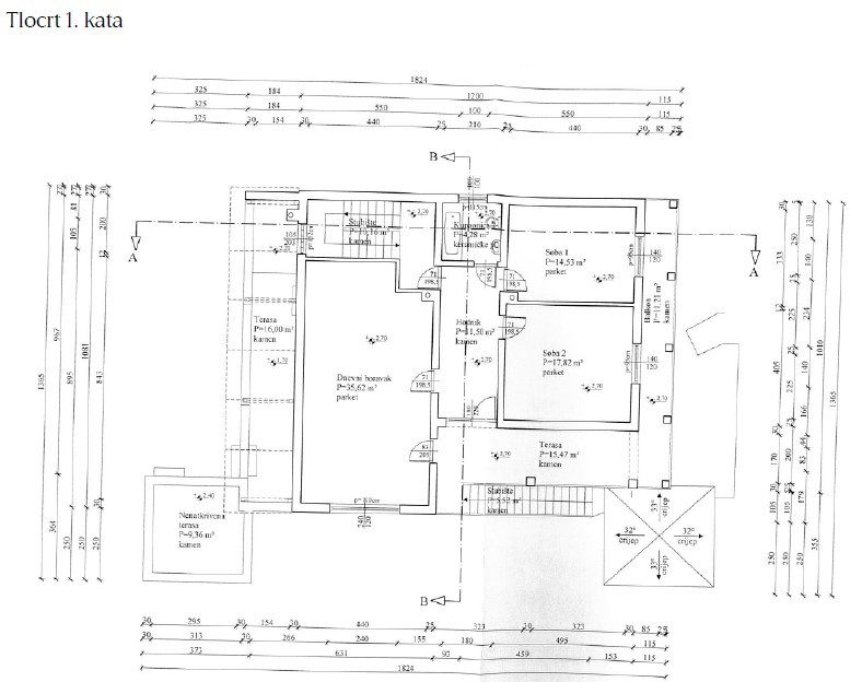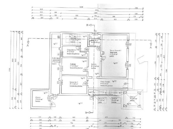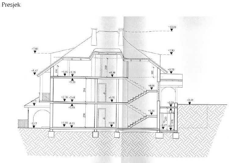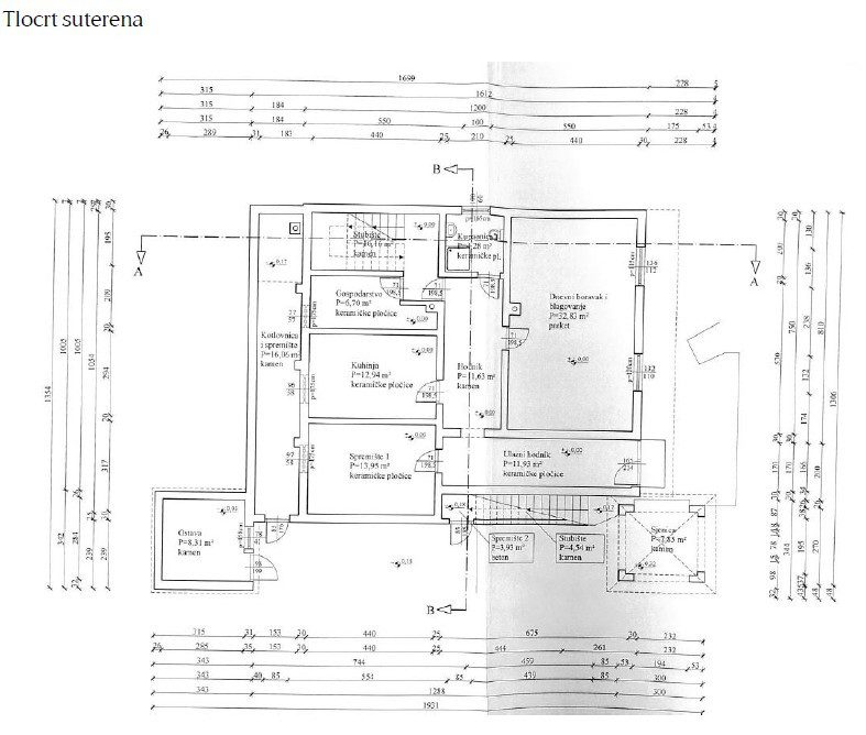 Suteren: ulazni hodnik, kuhinja, blagovaonica, dnevni boravak, kupaonica, spremišta, kotlovnica, ostava, gospodarstvo, stubište