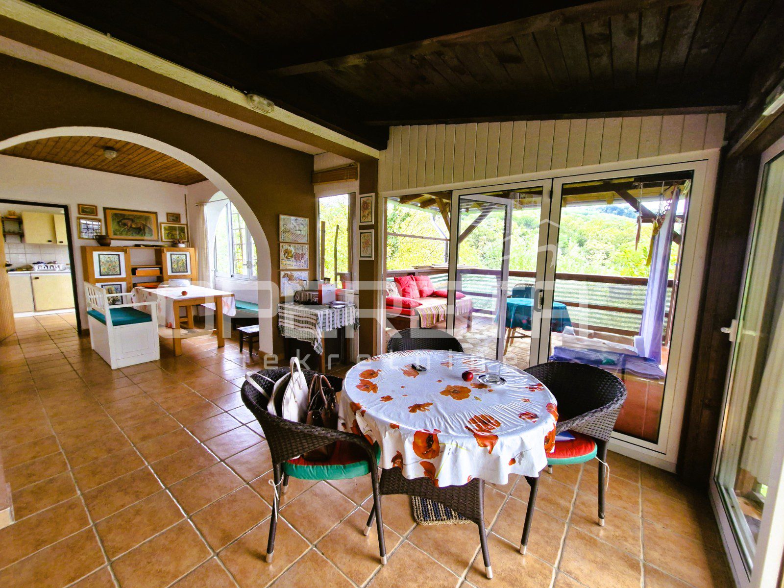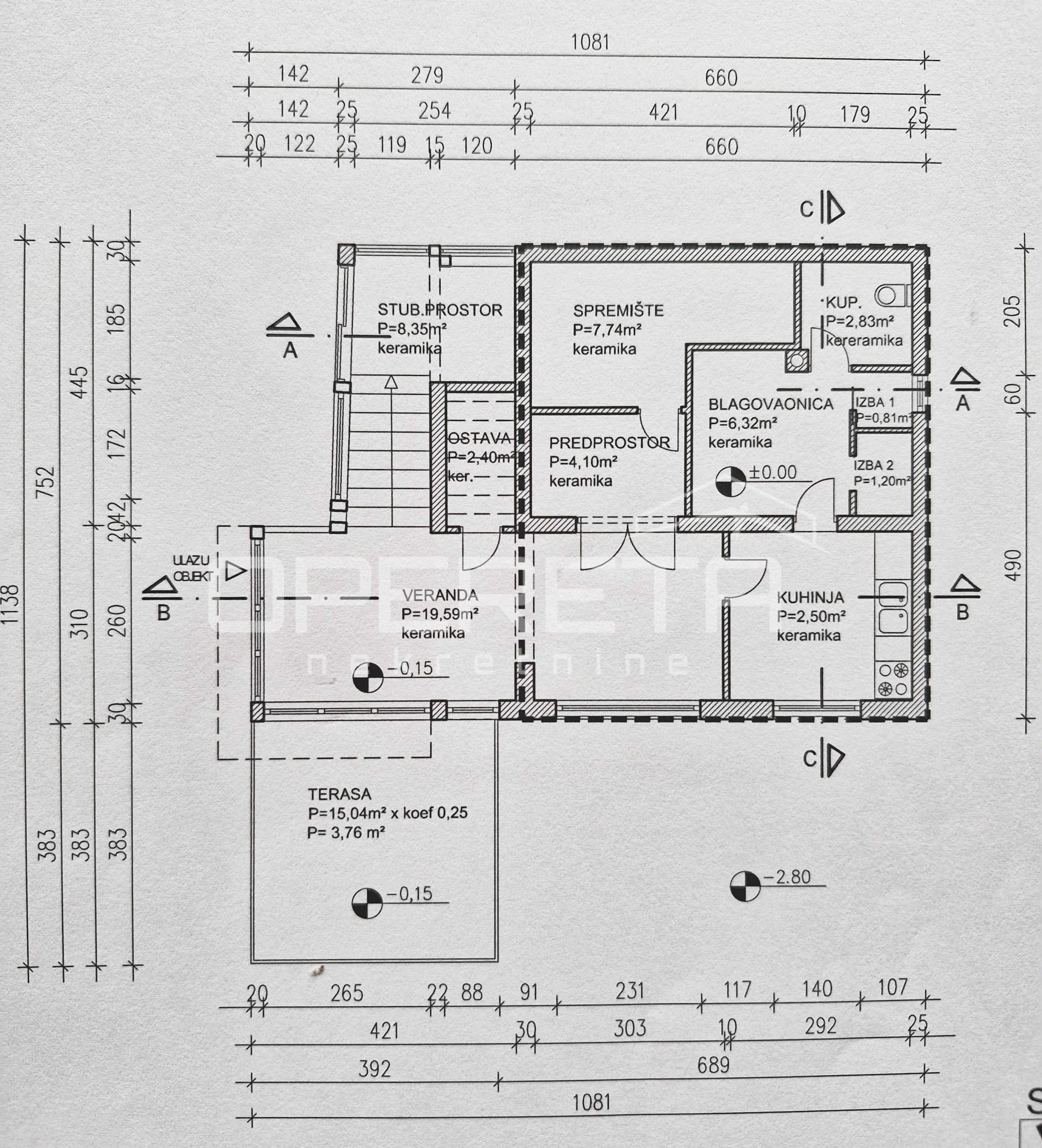 Prizemlje: dnevni boravak s ostakljenim dijelom i izlazom na veliku terasu, blagovaonica te prateći prostori.