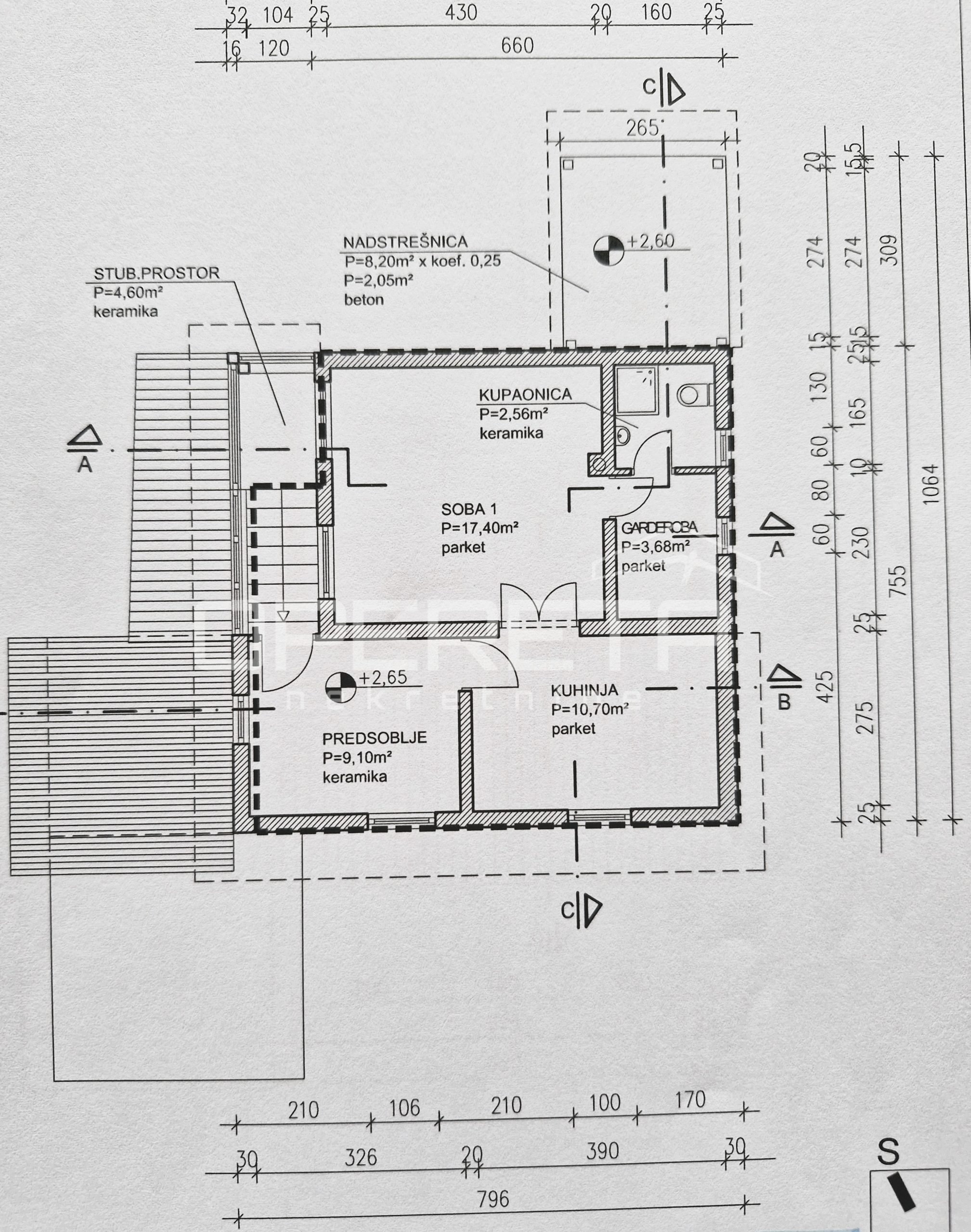 Kat: veći predprostor, kuhinja, spavaća soba i kupaonica.
