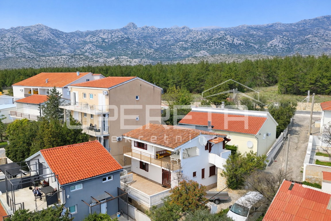 U mirnoj ulici, svega 200 m od mora, smjestila se samostojeća kuća podijeljena u dvije stambene jedinice, s vlastitom garažom, uređenim dvorištem i pogledom na more s gornje etaže.