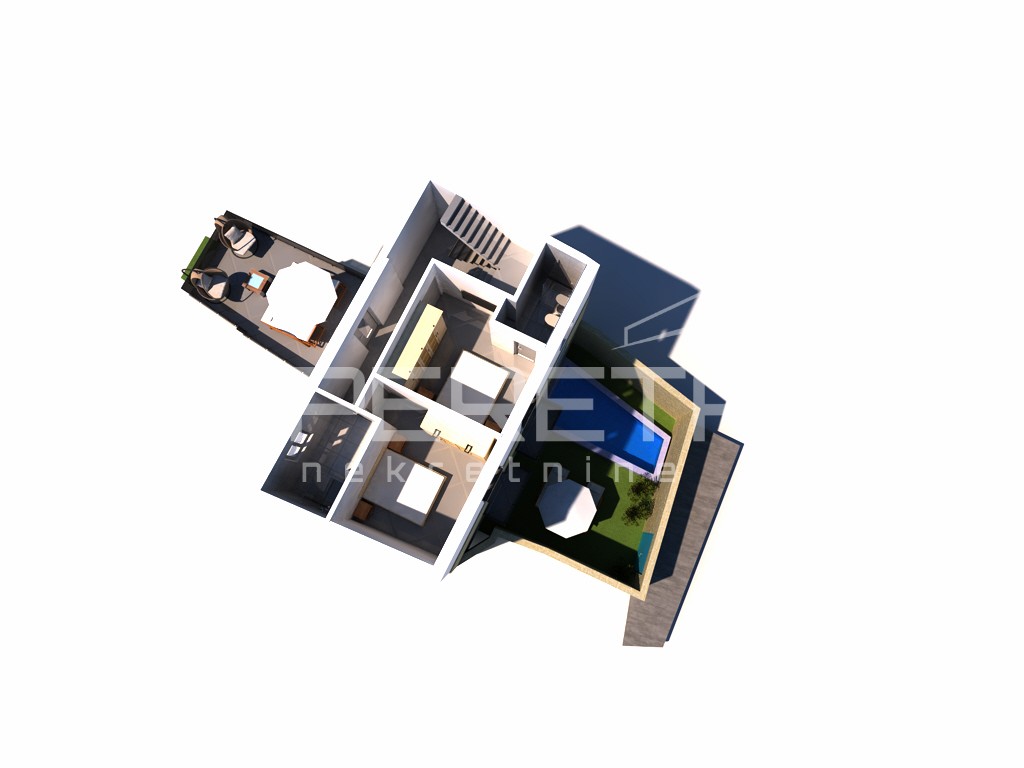 Prizemlje: kuhinja s blagovaonicom i dnevnim boravkom, hodnik, kupaonica, spavaća soba, izlaz na privatni bazen.