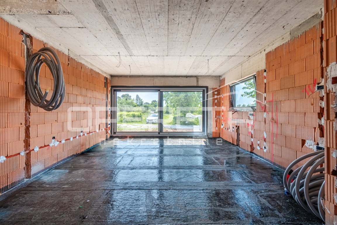 Kuća ukupne površine 118 m² prostire se na dvije etaže. U prizemlju, površine 66 m², nalazi se prostrani open-space prostor koji objedinjuje kuhinju, blagovaonicu i dnevni boravak, s velikom staklenom stijenom koja omogućuje obilje prirodnog svjetla i direktan izlaz u vrt. Na istoj etaži smještena je jedna spavaća soba s vlastitom kupaonicom, gostinjski WC te praktična praonica.