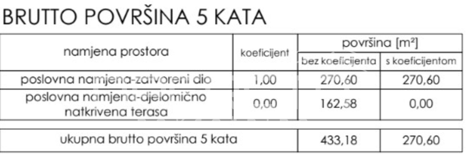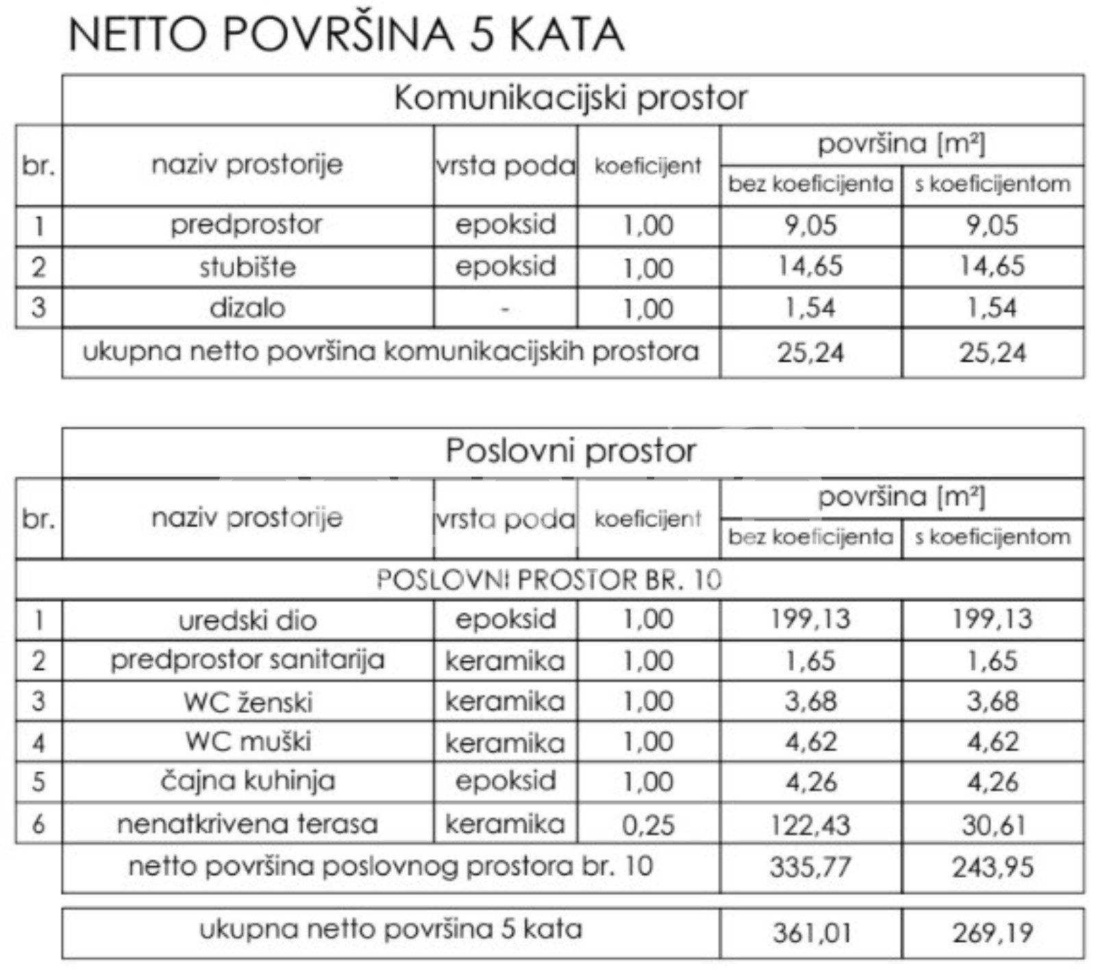 Najam luksuznog poslovnog prostora od neto površine 243,95 m2 na 5. katu. Bruto površina 5. kata će biti 270,60 m2. Radi se vrlo luksuznoj novogradnji pozicioniranoj na samom ulazu u grad Varaždin. Bruto površina cijele poslovne zgradi iznositi će 2.800 m2, a neto 2.290 m2. Kompletni prostor zgrade biti će funkcionalan i autonoman 24 sata. S obzirom na vrstu djelatnosti postoji mogućnost odabira površina ovisno o potrebama kao i prilagodba u izgradnji potencijalnoj djelatnosti. U zgradi će biti 2 posebna ulaza/izlaza i neovisna komunikacija, a biti će ugrađen kompletni sustav optičke infrastrukture. Cijela zgrada biti će niskog energetskog potencijala s ugrađenim toplinskim pumpama s najnovijim sustavima grijanja i hlađenja.