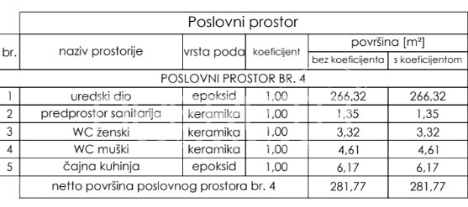 Luksuzni poslovni prostor od 281,77 m2 na drugom katu. Označen je kao poslovni prostor broj 4. Moderna zgrada bit će na samom ulazu u Varaždin iz pravca autoceste Goričan-Zagreb. Radi se vrlo luksuznoj novogradnji bruto površine zgrade od 2.800 m2, a neto 2.290 m2. Kompletni prostor zgrade bit će funkcionalan i autonoman 24 sata. S obzirom na vrstu djelatnosti postoji mogućnost pregovora i odabira površina ovisno o potrebama kao i prilagodba u izgradnji potencijalnoj djelatnosti. U zgradi će biti 2 posebna ulaza/izlaza, neovisna komunikacija, a bit će ugrađen kompletni sustav optičke infrastrukture. Cijela zgrada biti će niskog energetskoga potencijala s ugrađenim toplinskim pumpama s najnovijim sustavima grijanja i hlađenja. Završetak 6.mj. 2026.