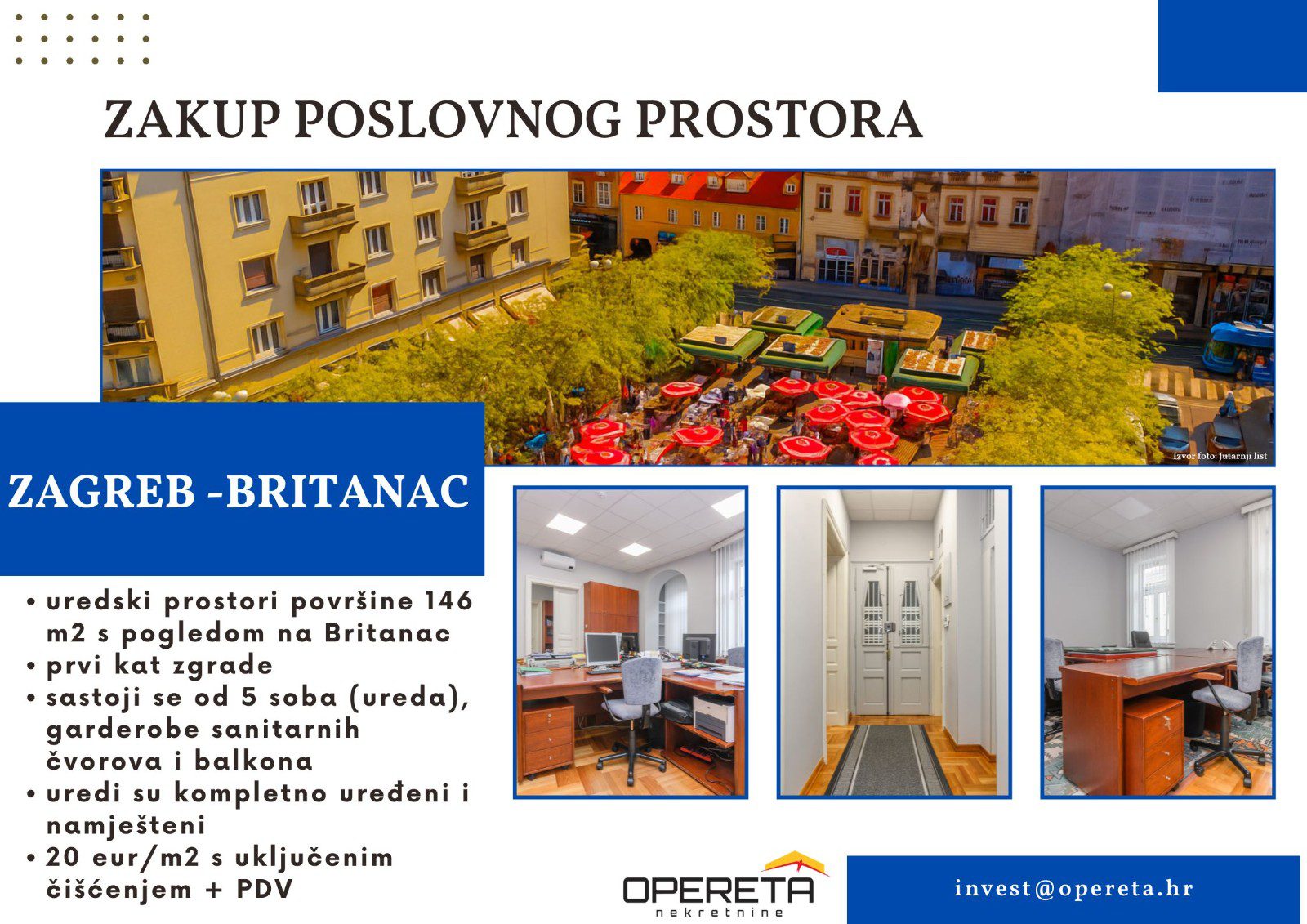 Cijena zakupa s uključenom uslugom čišćenja iznosi 20 eur/m2 + PDV + režijski troškovi. Dostupno od 1.10.2025.