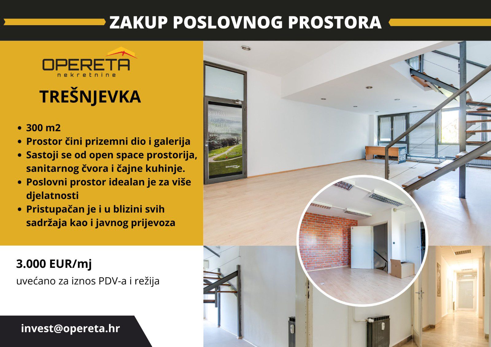 Daje se u zakup poslovni prostor na Trešnjevci ukupne površine oko 300 m2. Prostor čini prizemni dio i galerija. Sastoji se od open space prostorija, sanitarnog čvora i čajne kuhinje.